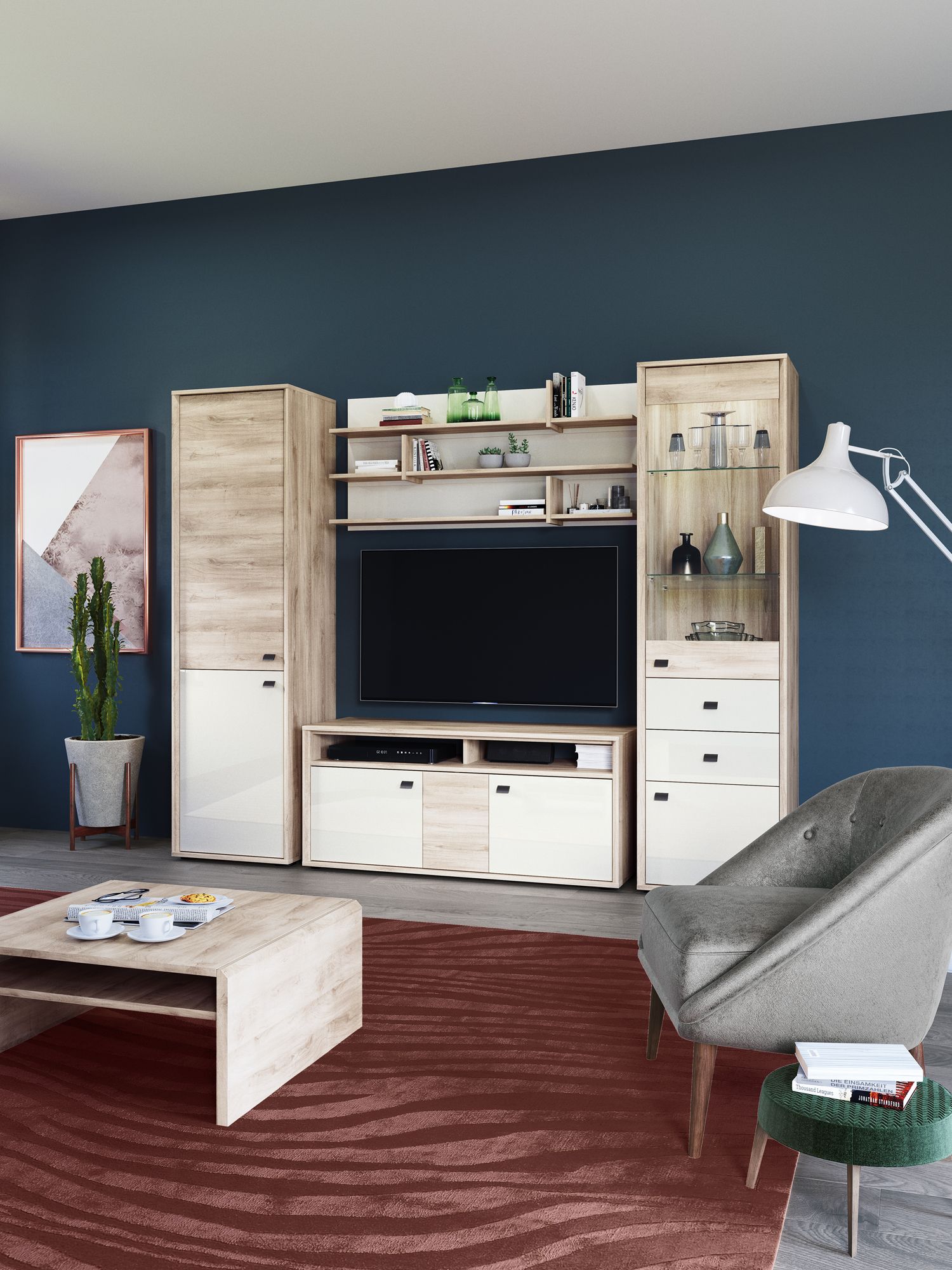 Дизайн коллекции позволяет комбинировать древесную текстуру с глянцевыми фасадами приятного базового оттенка. Это решение оптимально подходит для компактных помещений, поскольку глянец обладает высоким коэффициентом отражения и служит повышению освещенности.