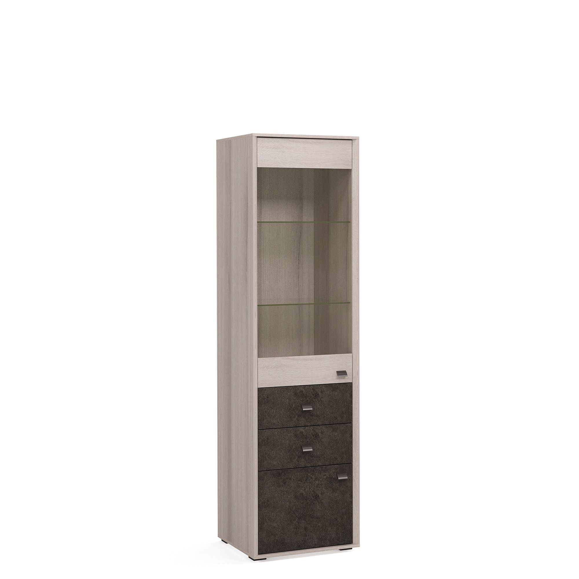 Шкаф-витрина ALTERA с выдвижными ящиками и фасадом из прочного закаленного стекла отлично подходит как для гостиных, так и для молодежных комнат, домашних библиотек и рабочих кабинетов. Доводчики и направляющие для плавного закрывания включены в базовую комплектацию. Стандартный комплект ручек входит в комплектацию. Вы можете подобрать к шкафу ручки другого дизайна (заказываются отдельно).