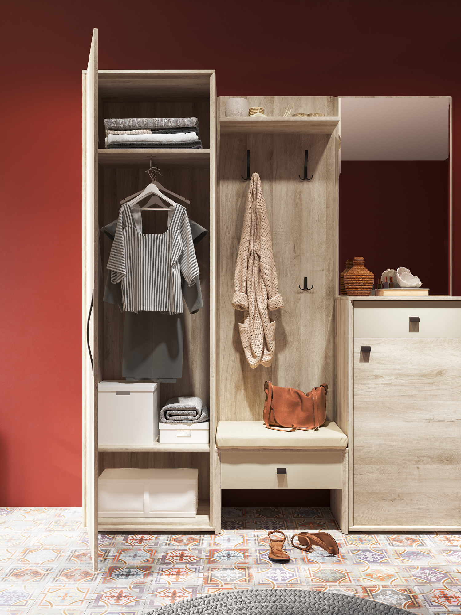 Благодаря небольшой глубине  однодверный шкаф ALTERA подходит, в том числе, для обустройства компактных прихожих. Модель оснащена двумя полками, верхняя из которых осащена штангой для вешалок. Это позволяет организовать рациональное хранение вещей, используя пространство максимально эффективно.