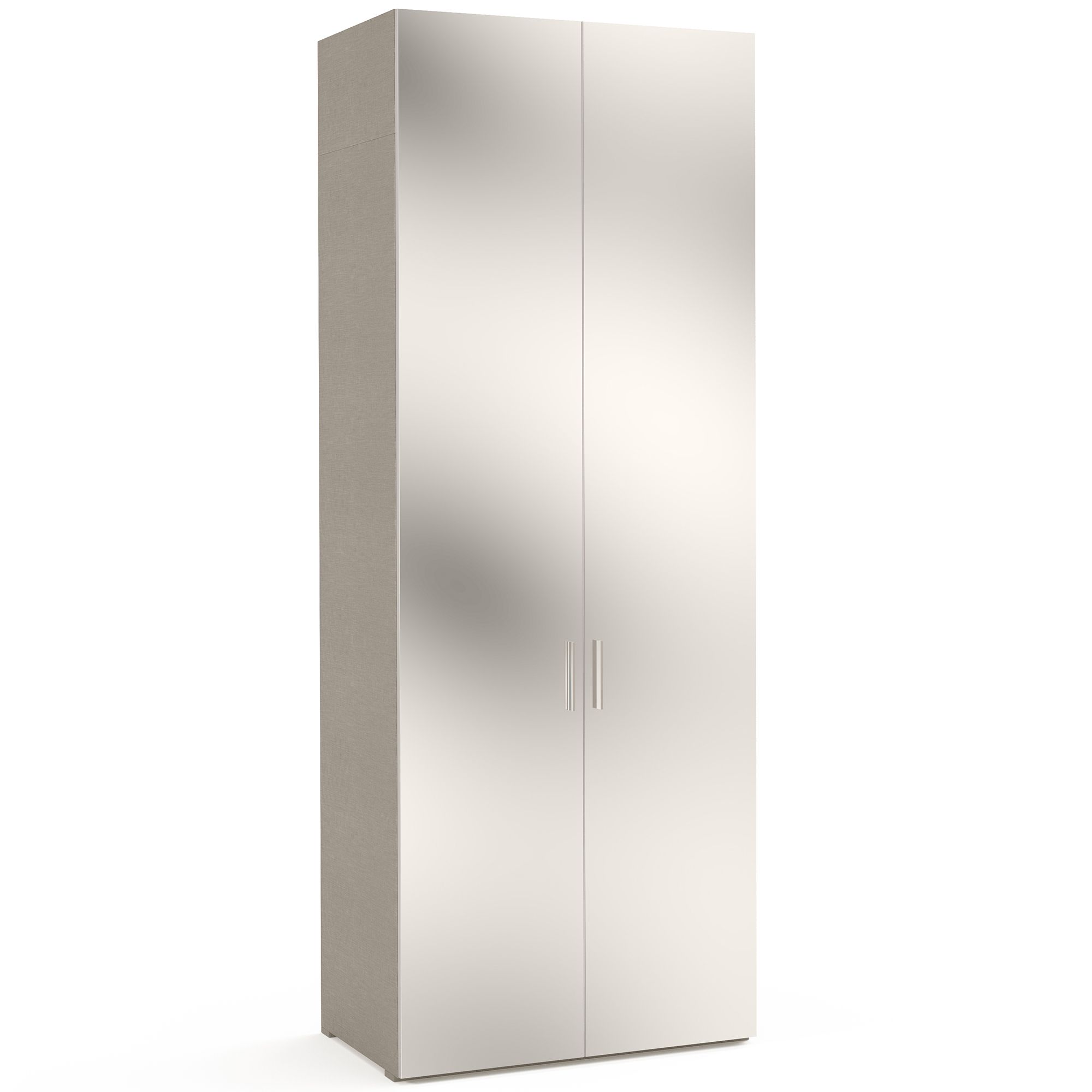 Двухдверный шкаф ESTE оснащен антресолями, увеличивающими его высоту, что позволяет использовать по максимуму свободное пространство под потолком. Фасады шкафа представляют собой сплошное зеркальное полотно. Внутреннее пространство оформлено в текстуре Шенилл, воспроизводящей рисунок плетения натуральной ткани. Наполнение шкафа представляет собой систему из трех полок, к нижней из которых крепится штанга для вешалок. Шкаф оснащен встроенным светильником, который включается автоматически при открывании дверей (система включения светильника с трансформатором заказываются отдельно). В комплектацию включены ручки в отделке Хром-глянец. Предусмотрена возможность замены на ручки в отделке Черный никель. ВАЖНО! Глубина шкафа указана без учета фасада, высота – без учета карниза. Боковые стенки и карнизы заказываются отдельно. Каждый зеркальный фасад поставляется с двумя сквозными отверстиями под ручку.