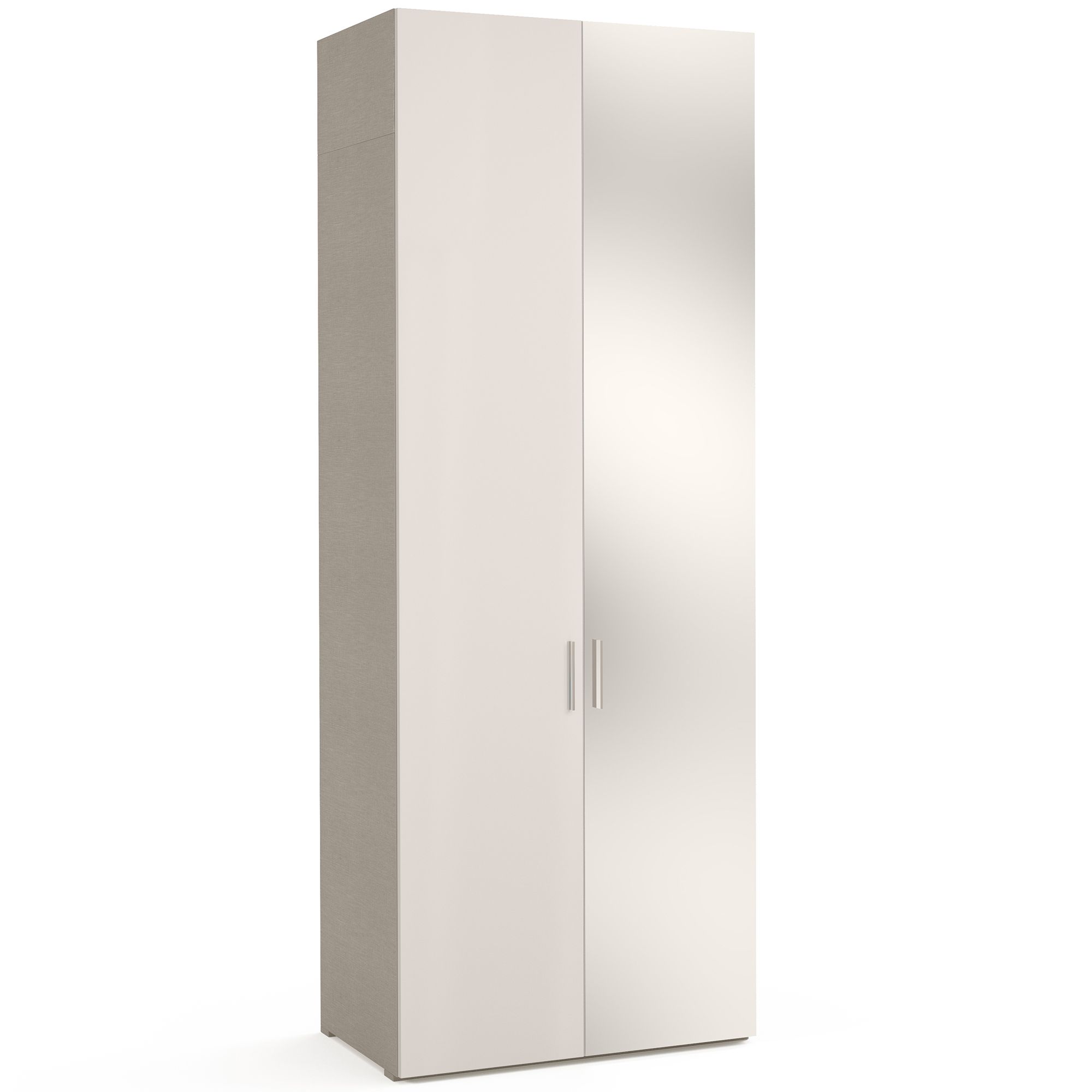 Двухдверный шкаф ESTE оснащен антресолями, увеличивающими его высоту, что позволяет использовать по максимуму свободное пространство под потолком. Один из фасадов шкафа выполнен в отделке Белый глянец, второй представляет собой сплошное зеркальное полотно. Внутреннее пространство оформлено в текстуре Шенилл, воспроизводящей рисунок плетения натуральной ткани. Наполнение шкафа представляет собой систему из трех полок, к нижней из которых крепится штанга для вешалок. Шкаф оснащен встроенным светильником, который включается автоматически при открывании дверей (система включения светильника с трансформатором заказываются отдельно). В комплектацию включены ручки в отделке Хром-глянец. Предусмотрена возможность замены на ручки в отделке Черный никель. ВАЖНО! Глубина шкафа указана без учета фасада, высота – без учета карниза. Боковые стенки и карнизы заказываются отдельно. Зеркальный фасад поставляется с двумя сквозными отверстиями под ручку.