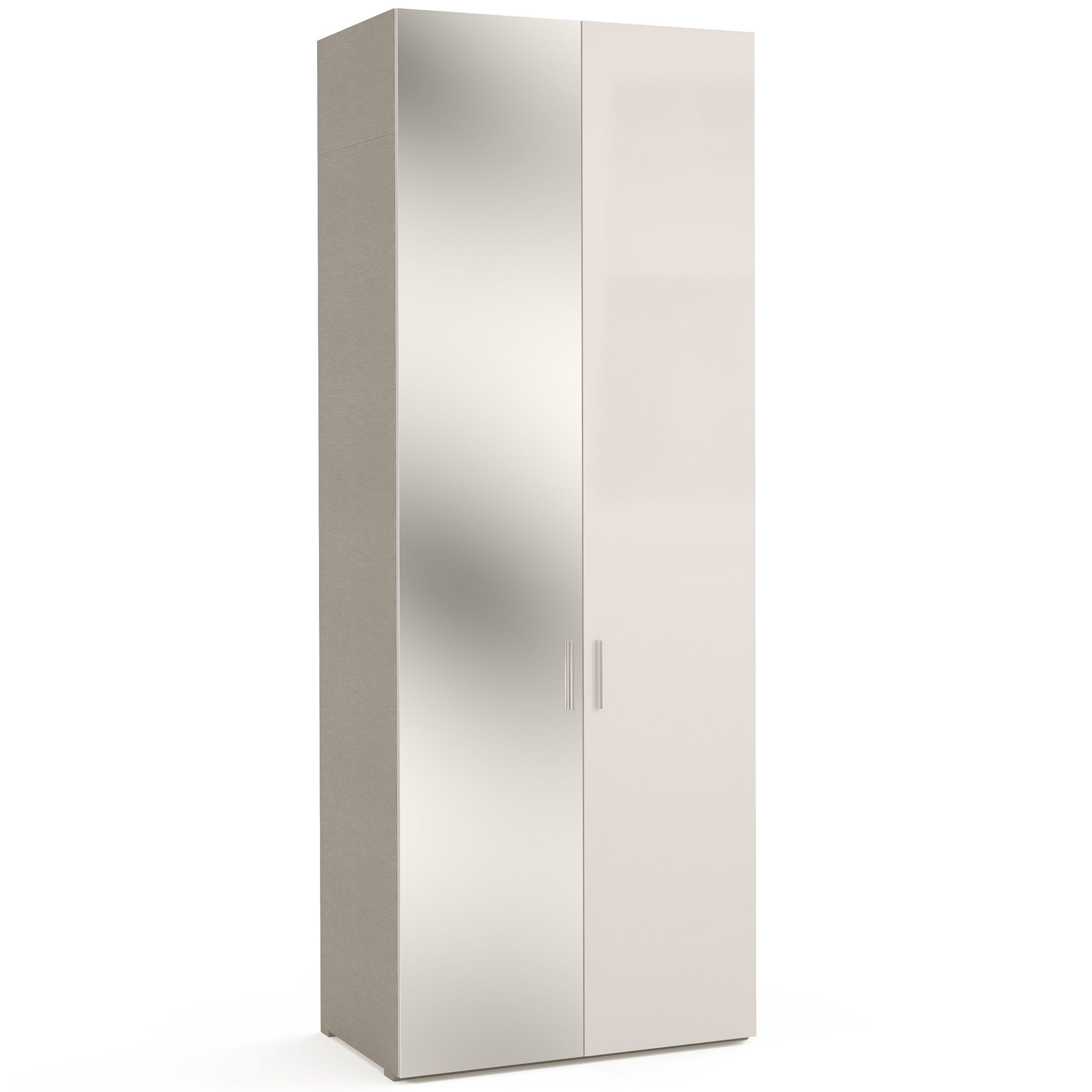 Двухдверный шкаф ESTE оснащен антресолями, увеличивающими его высоту, что позволяет использовать по максимуму свободное пространство под потолком. Один из фасадов шкафа выполнен в отделке Белый глянец, второй представляет собой сплошное зеркальное полотно. Внутреннее пространство оформлено в текстуре Шенилл, воспроизводящей рисунок плетения натуральной ткани. Наполнение шкафа представляет собой систему из трех полок, к нижней из которых крепится штанга для вешалок. Шкаф оснащен встроенным светильником, который включается автоматически при открывании дверей (система включения светильника с трансформатором заказываются отдельно). В комплектацию включены ручки в отделке Хром-глянец. Предусмотрена возможность замены на ручки в отделке Черный никель. ВАЖНО! Глубина шкафа указана без учета фасада, высота – без учета карниза. Боковые стенки и карнизы заказываются отдельно. Зеркальный фасад поставляется с двумя сквозными отверстиями под ручку.