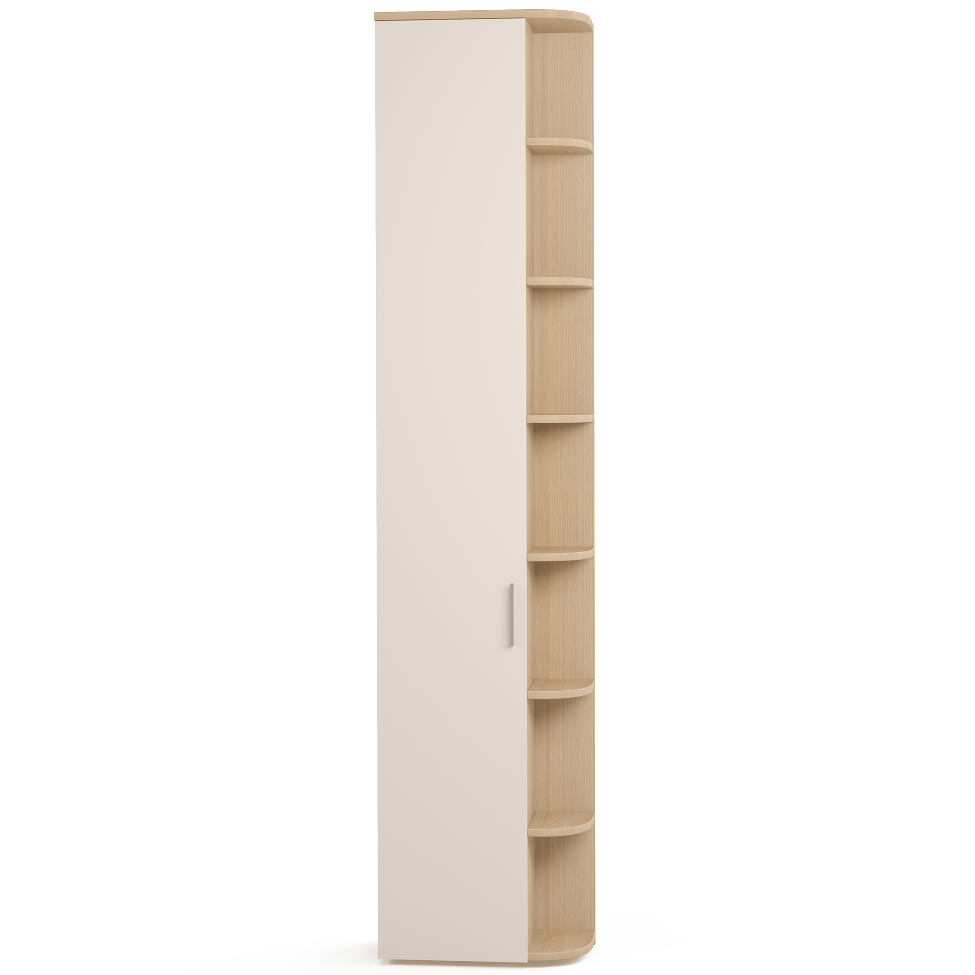 Завершающий модуль ESTE для шкафов с антресолями может иметь как левое, так и правое исполнение. Модель совмещает функции открытого и закрытого хранения. Отделка – комбинация текстур Cashmere матовый и Coimbra. В комплектацию включены ручки в отделке Хром-глянец.