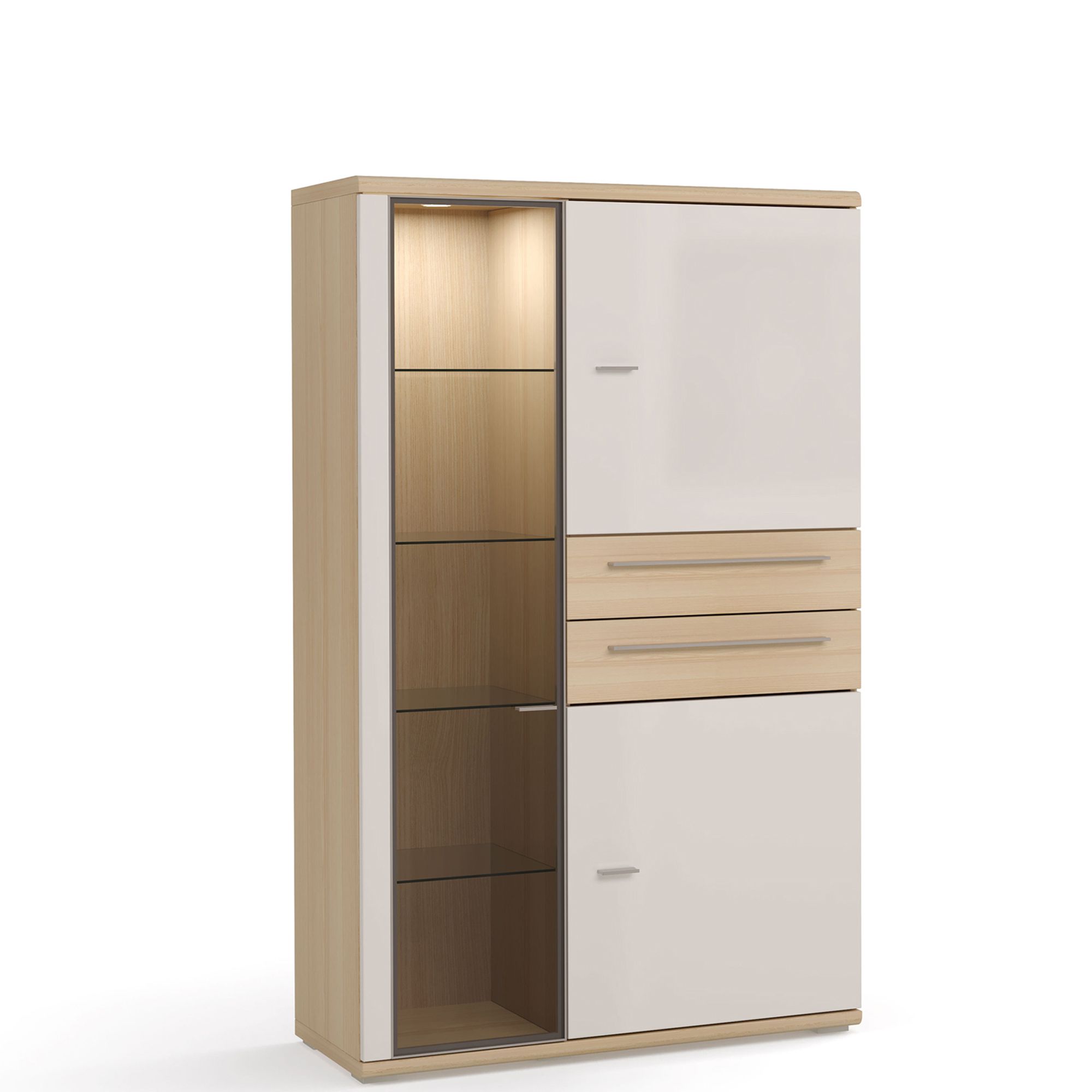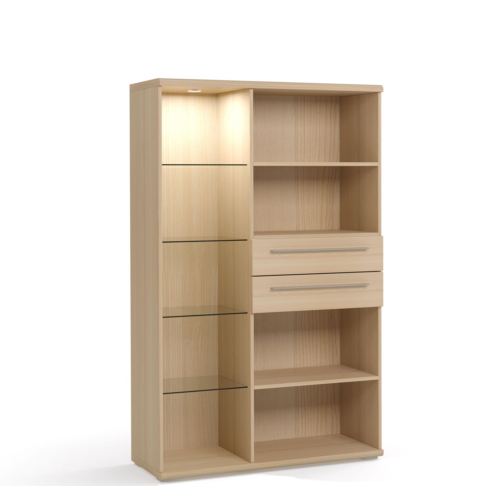 Вместительный шкаф ESTE оснащен распашными фасадами и выдвижными ящиками. За закаленным тонированным стеклом расположены стеклянные полки и система внутренней подсветки.
