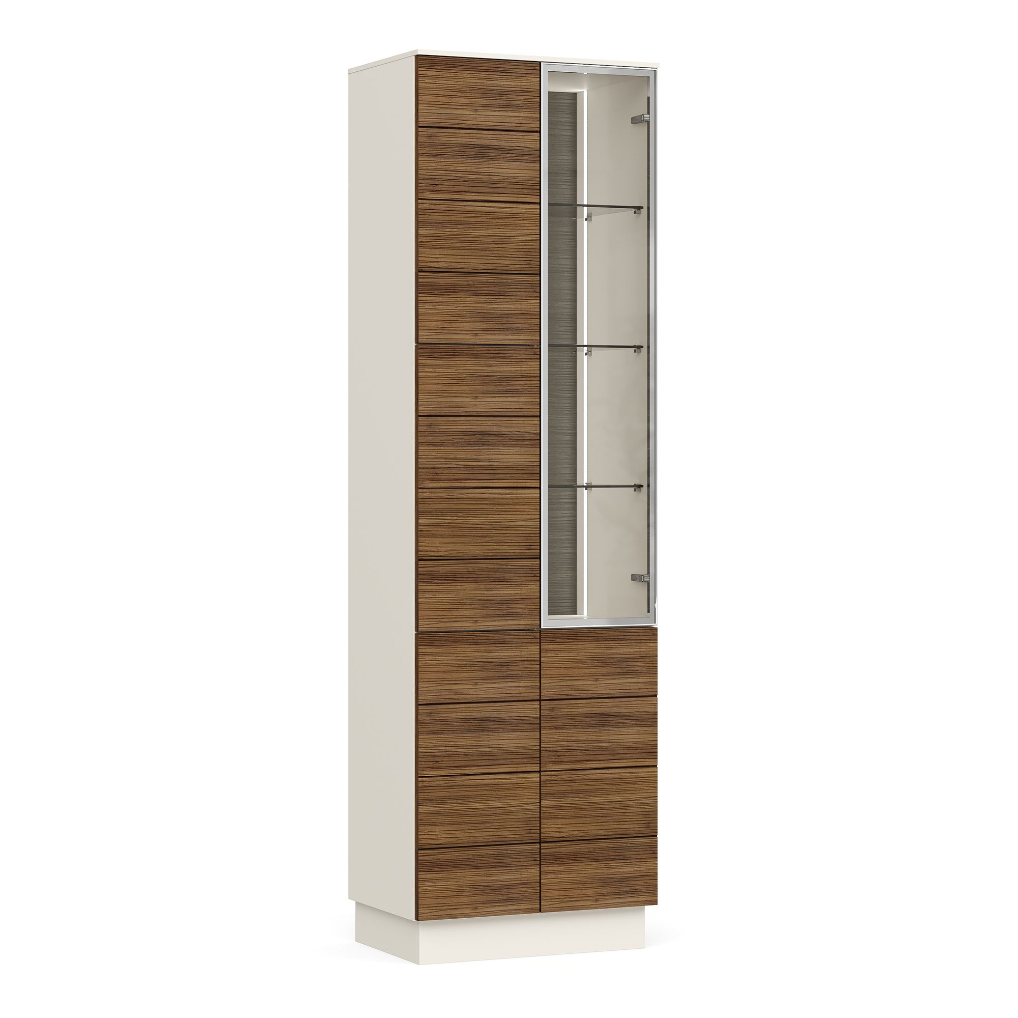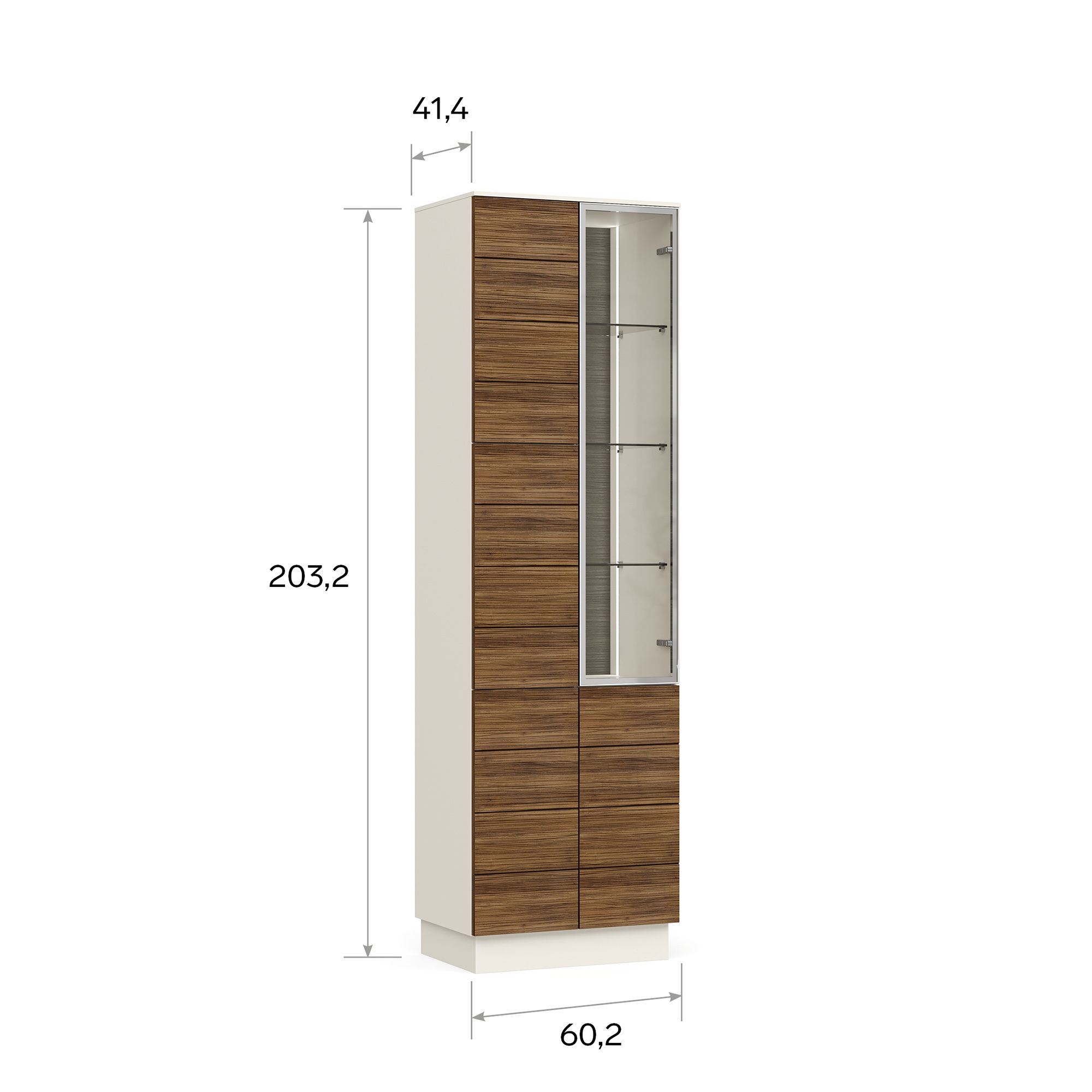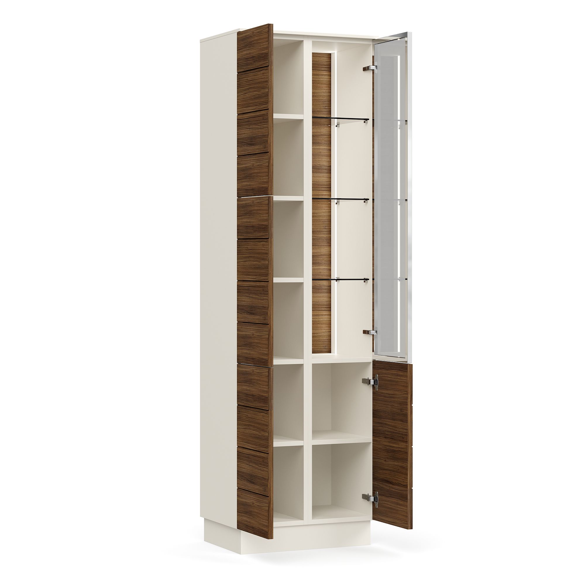Одна из секций шкафа-витрины MONAKO оснащена тремя распашными фасадами в отделке шпоном. Вторая состоит из одного сплошного фасада и одной секции с закаленным тонированным стеклом (оттенок Бронза). За сплошными фасадами располагается система полок из ЛДСП, полки за стеклянным фасадом изготовлены из тонированного стекла. Световое оборудование входит в комплектацию. На выбор предлагается система включения/выключения светильников с дистанционным пультом либо с ножным выключателем (заказывается отдельно).