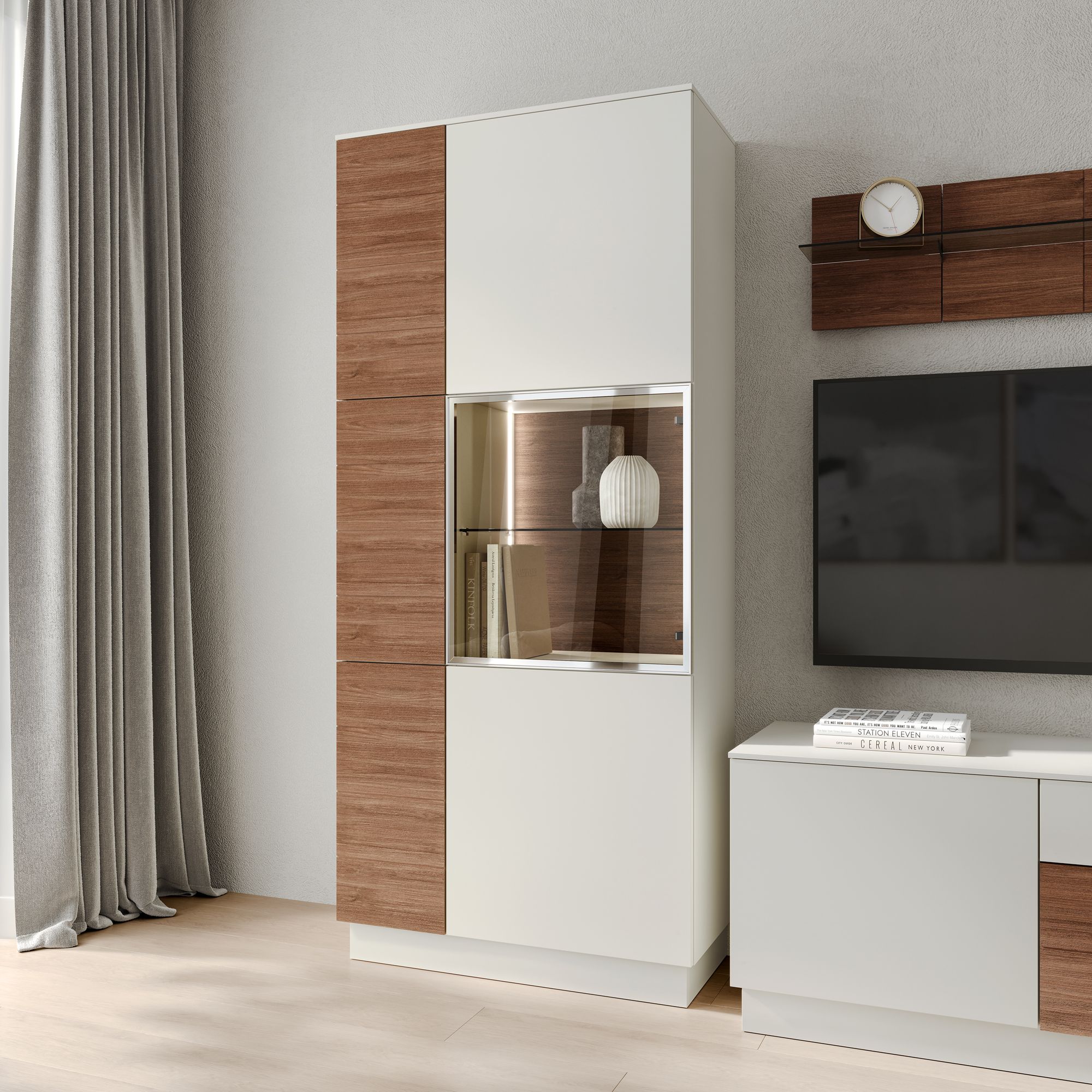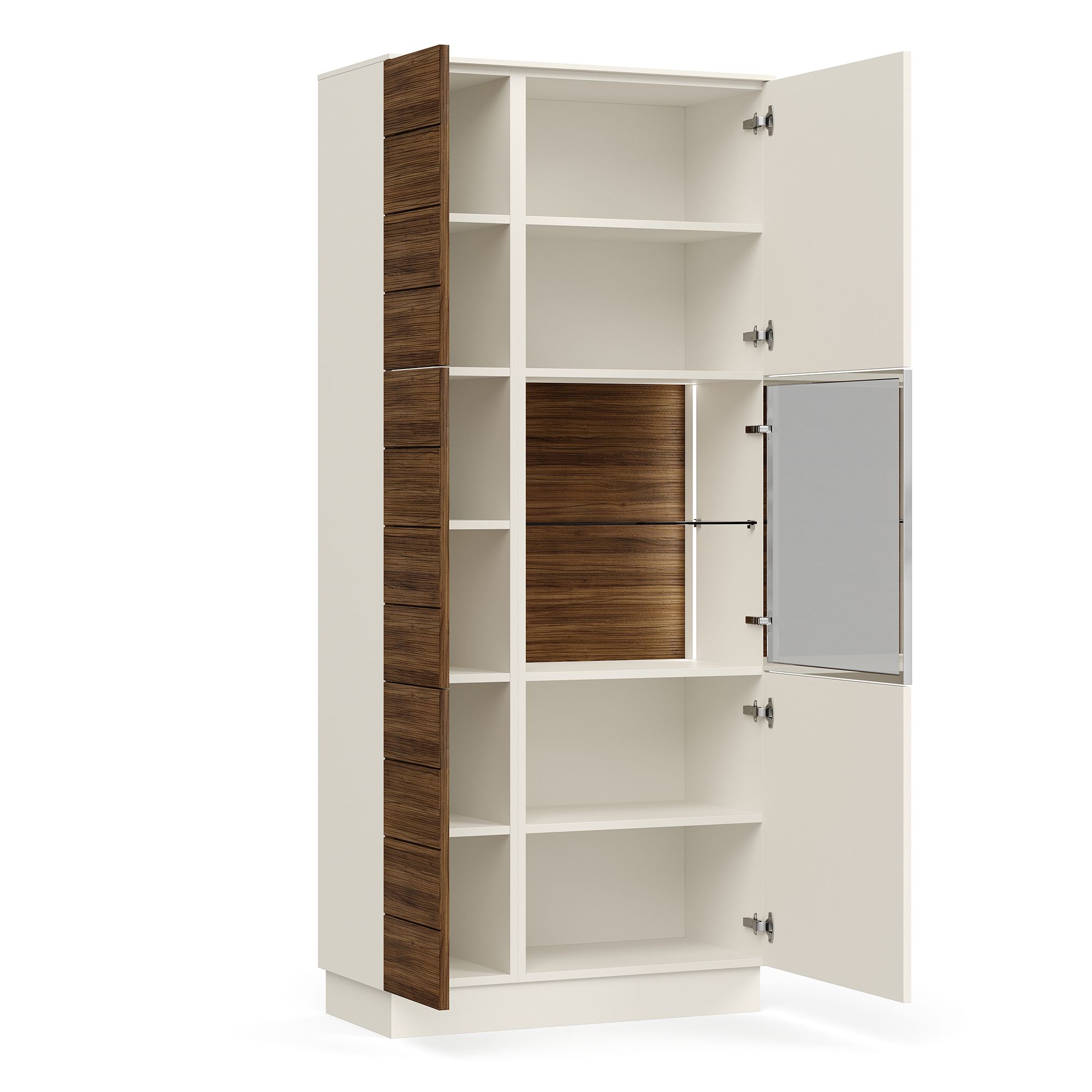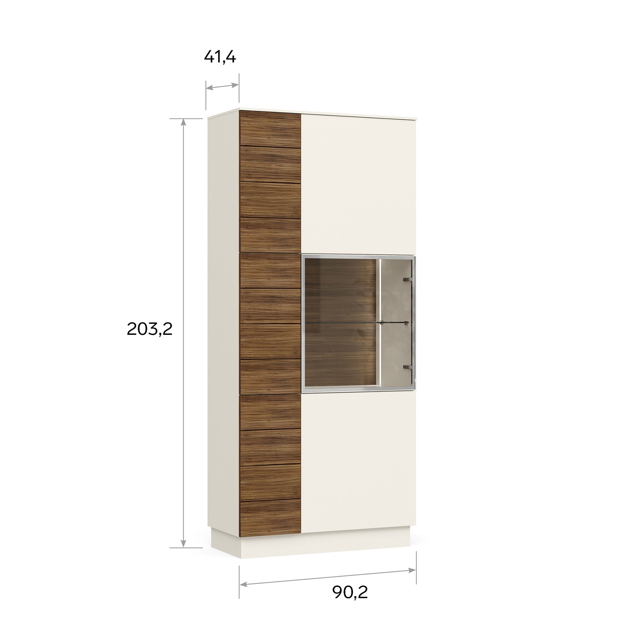 Узкая секция шкафа-витрины MONAKO оснащена тремя распашными фасадами в отделке шпоном. Средний фасад широкой секции выполнен из закаленного тонированного стекла (оттенок Бронза), верхний и нижний – в отделке эмалью. За сплошными фасадами располагается система полок из ЛДСП, полка за стеклянным фасадом изготовлена из тонированного стекла. Световое оборудование входит в комплектацию. На выбор предлагается система включения/выключения светильников с дистанционным пультом либо с ножным выключателем (заказывается отдельно). Модель также предусматривает зеркальное исполнение.