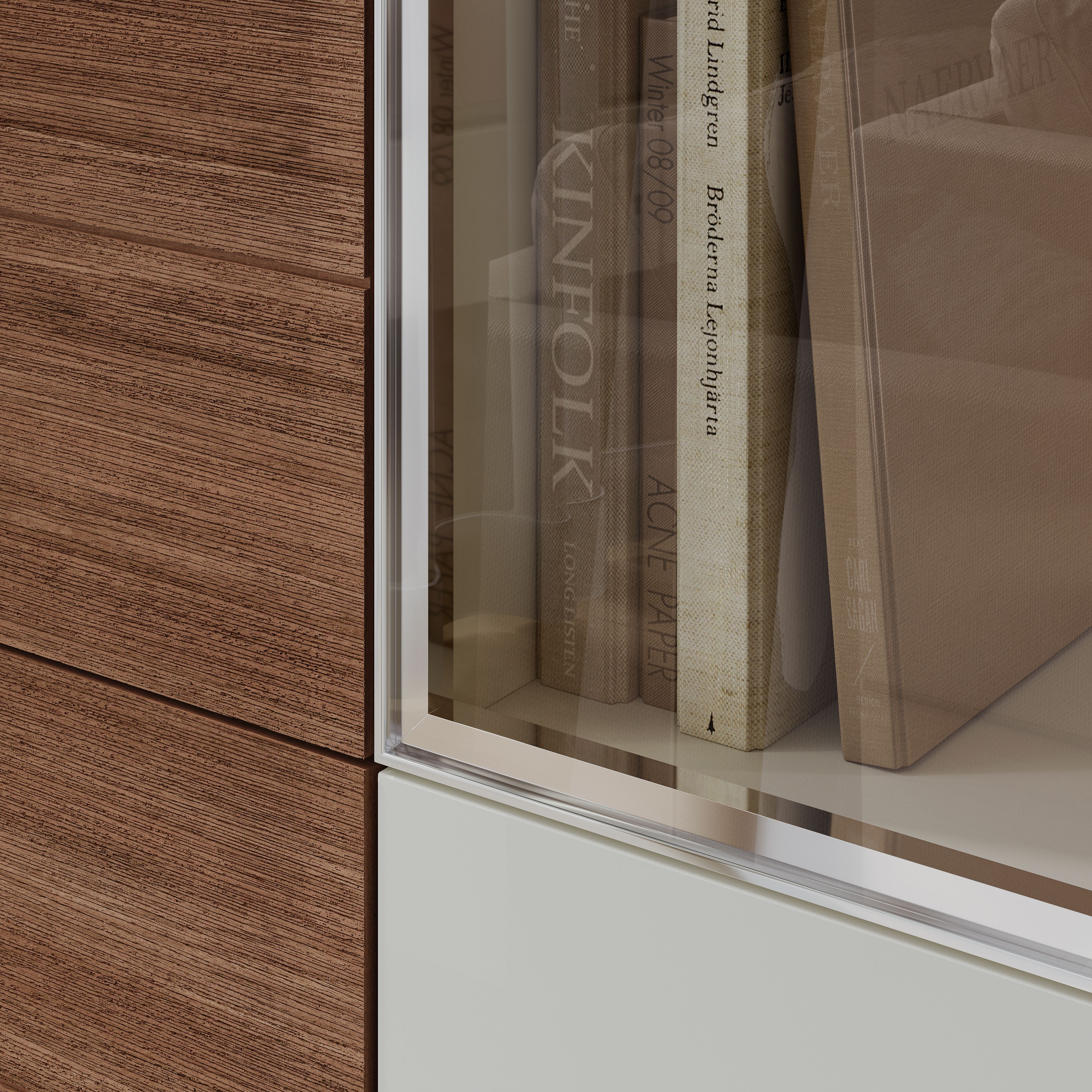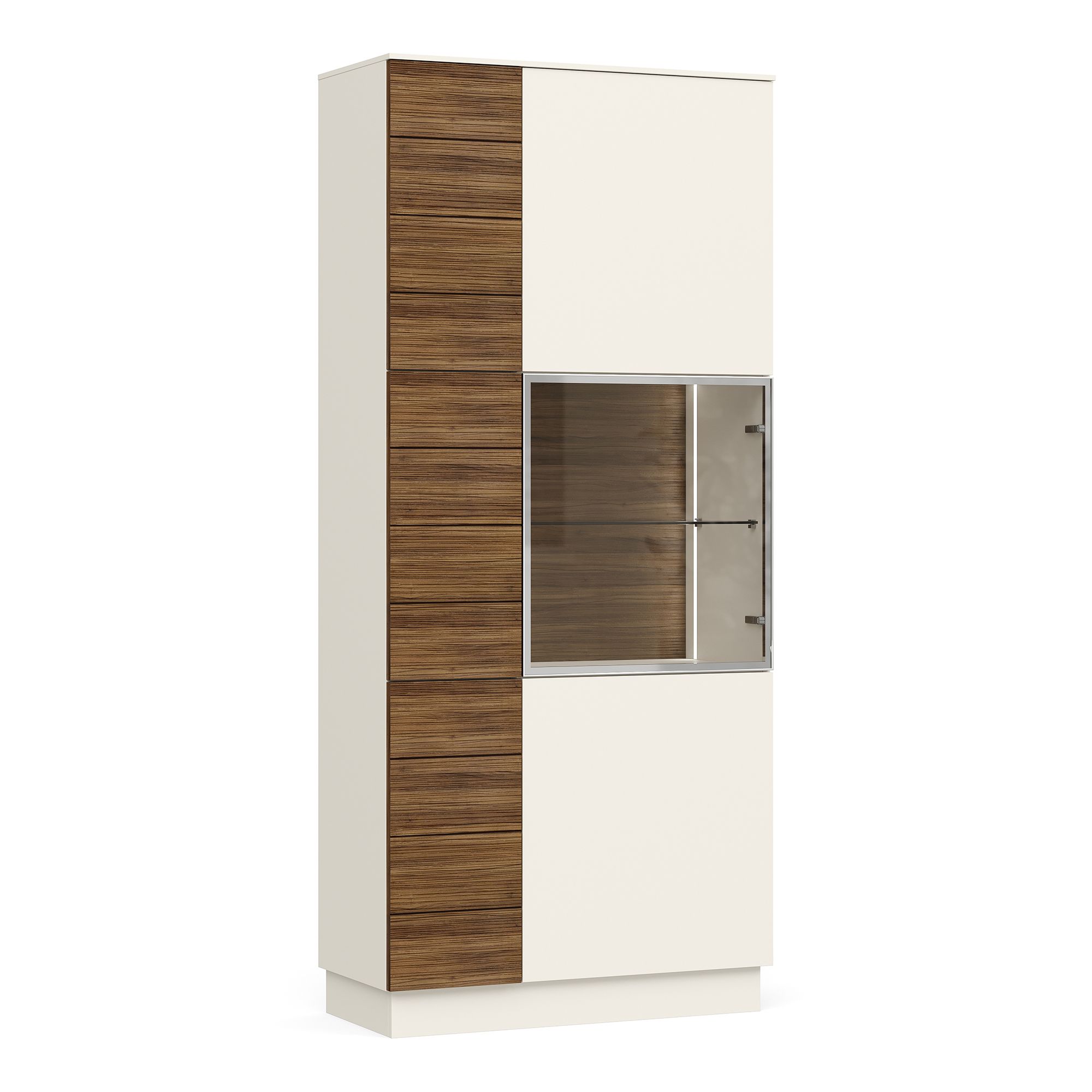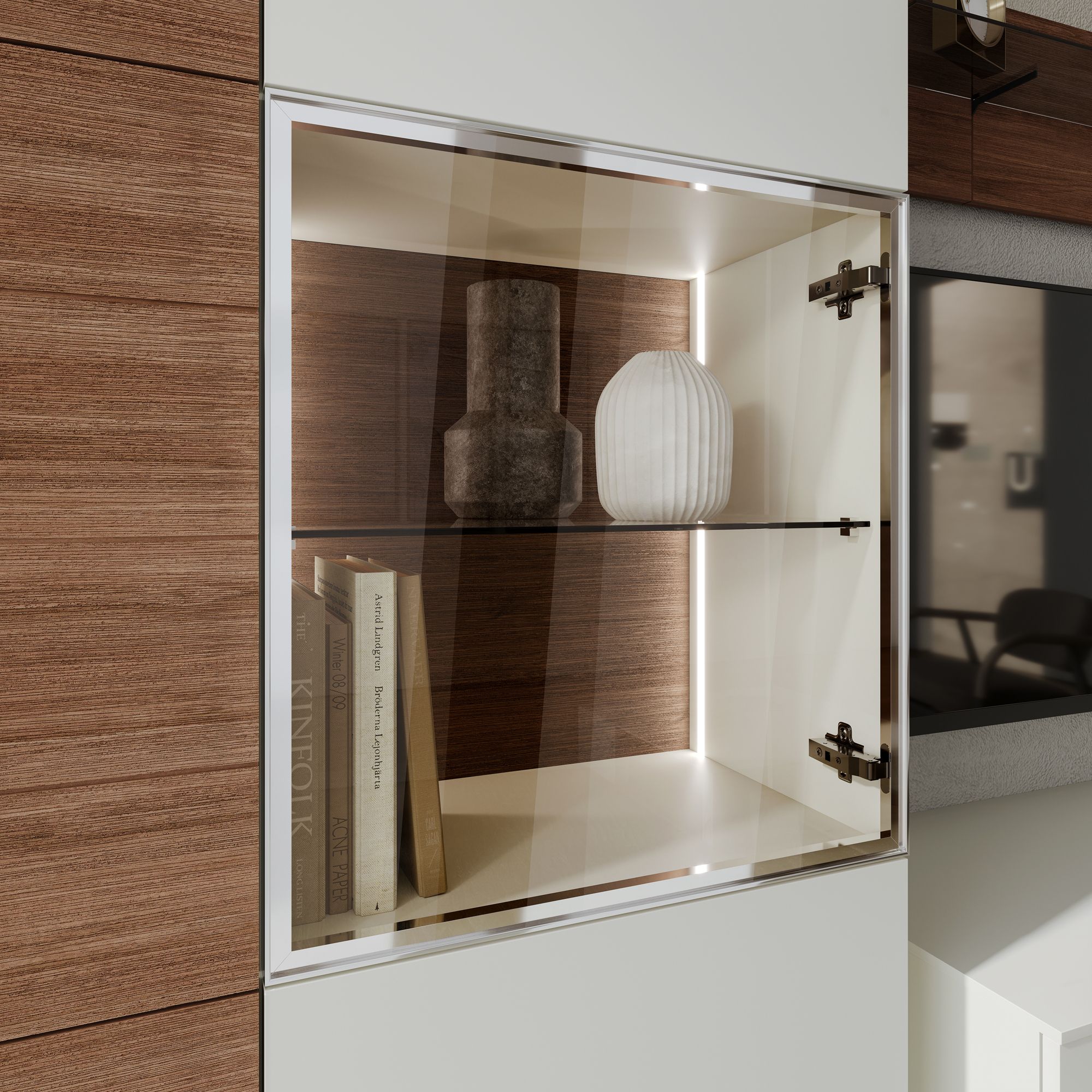 Узкая секция шкафа-витрины MONAKO оснащена тремя распашными фасадами в отделке шпоном. Средний фасад широкой секции выполнен из закаленного тонированного стекла (оттенок Бронза), верхний и нижний – в отделке эмалью. За сплошными фасадами располагается система полок из ЛДСП, полка за стеклянным фасадом изготовлена из тонированного стекла. Световое оборудование входит в комплектацию. На выбор предлагается система включения/выключения светильников с дистанционным пультом либо с ножным выключателем (заказывается отдельно). Модель также предусматривает зеркальное исполнение.