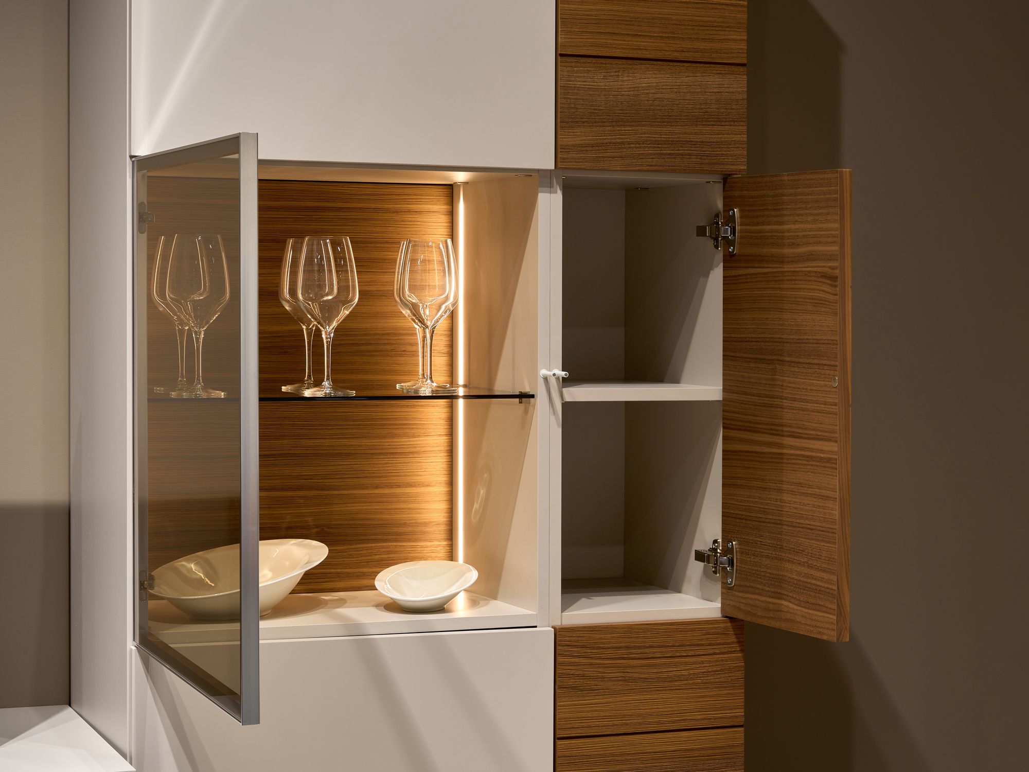 В боковые стенки шкафов и стеллажей интегрированы светодиодные светильники Fusion (Италия) в пластиковом корпусе молочного оттенка. На выбор предлагаются два вида выключателей: кнопочный и с пультом управления.