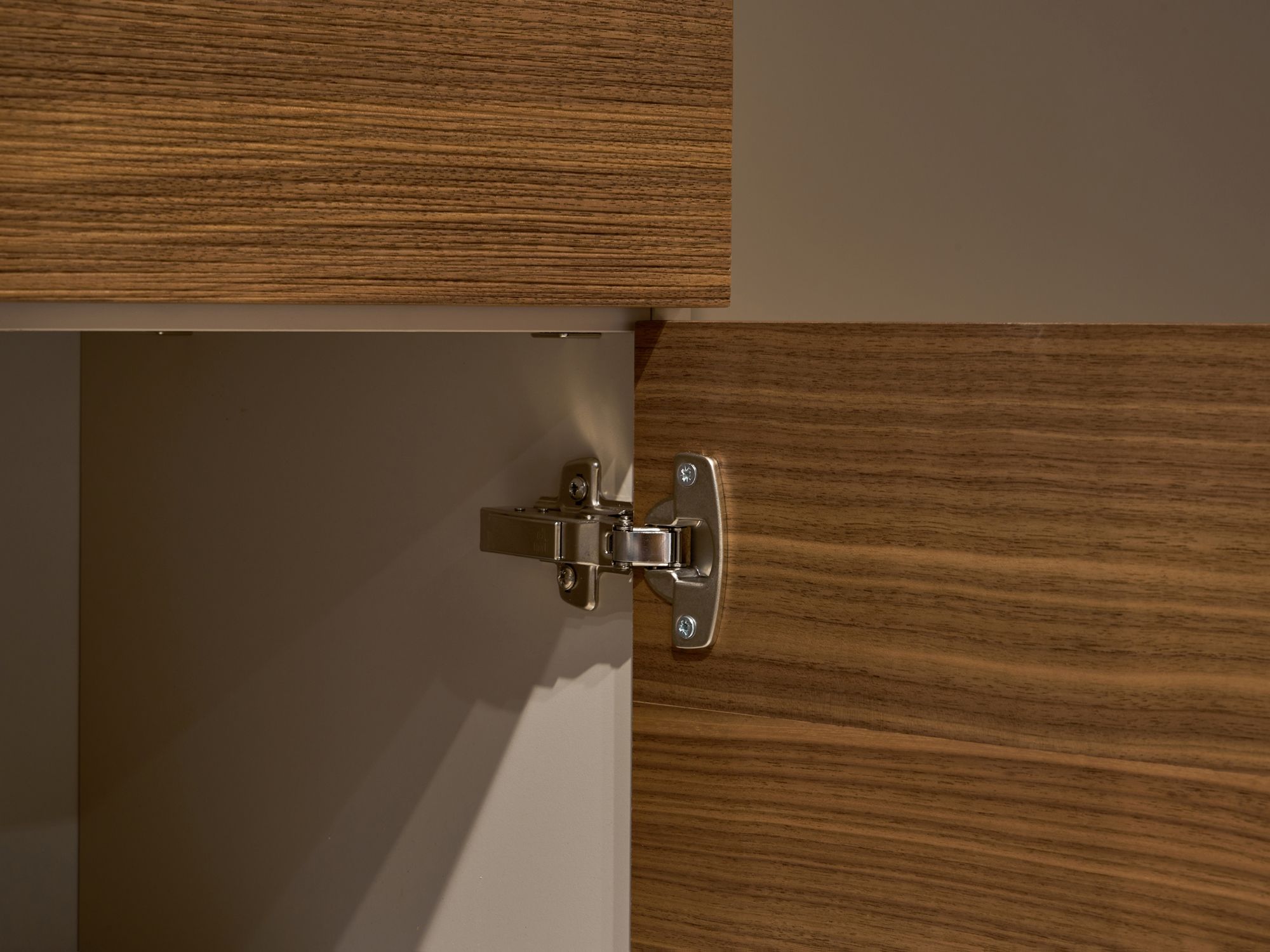 Для навески распашных фасадов используются петли быстрого монтажа, оснащенные доводчиком уже в базовой комплектации. Они рассчитаны на 200 тыс. циклов открывания, что обеспечивает удобство и комфорт эксплуатации мебели на долгие годы даже при ежедневном интенсивном использовании.