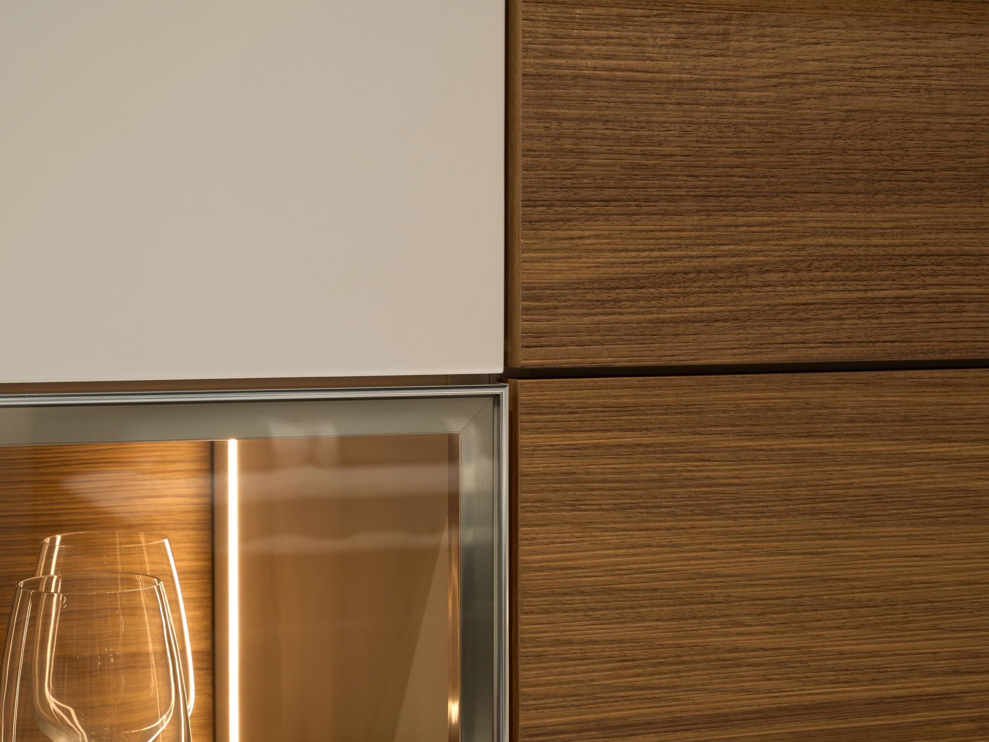 Благодаря сочетанию эмали Cashmere, вставок в отделке шпоном Орех Американский и Дуб морёный, декорированным эксклюзивным тиснением «Камыш» и бронзированных стекол общая колористика интерьера получается теплой и уютной. Оттенки сливочно-кофейной гаммы находятся на пике мировой интерьерной моды и выглядят актуально в любом помещении.