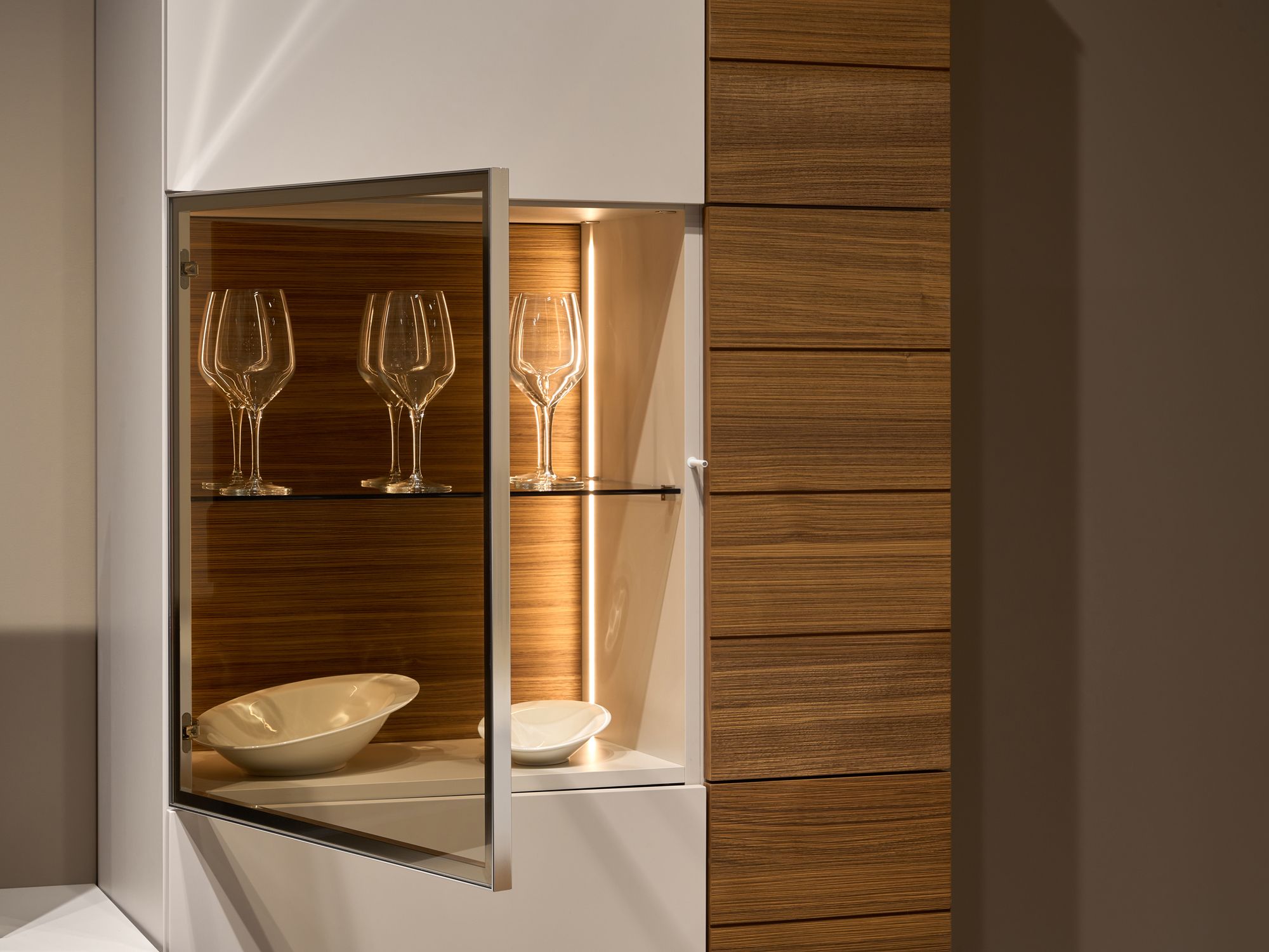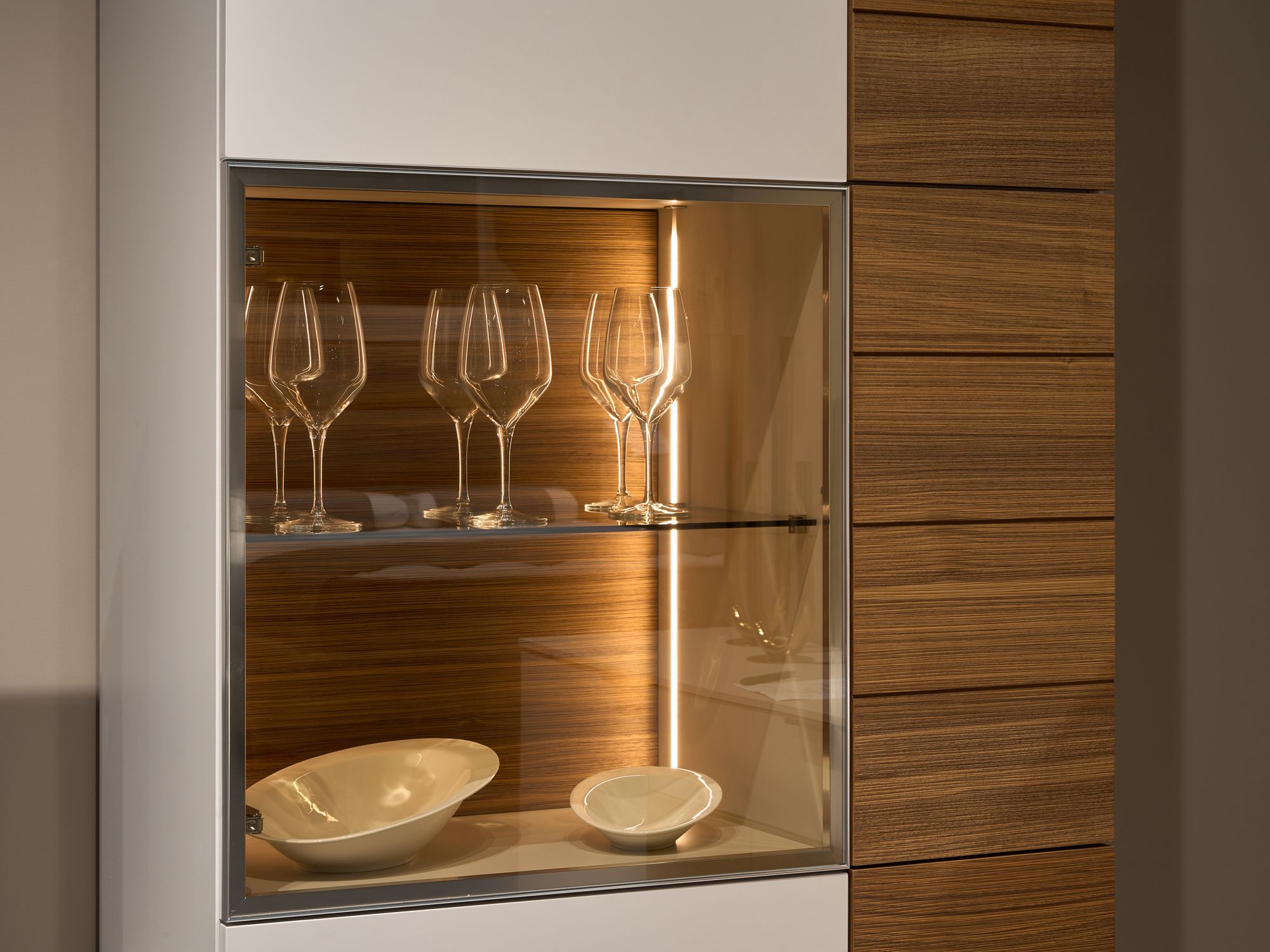 В изящных металлических рамах шкафов-витрин используются стекла, тонированные в трендовый бронзовый оттенок, который сейчас находится на пике популярности.