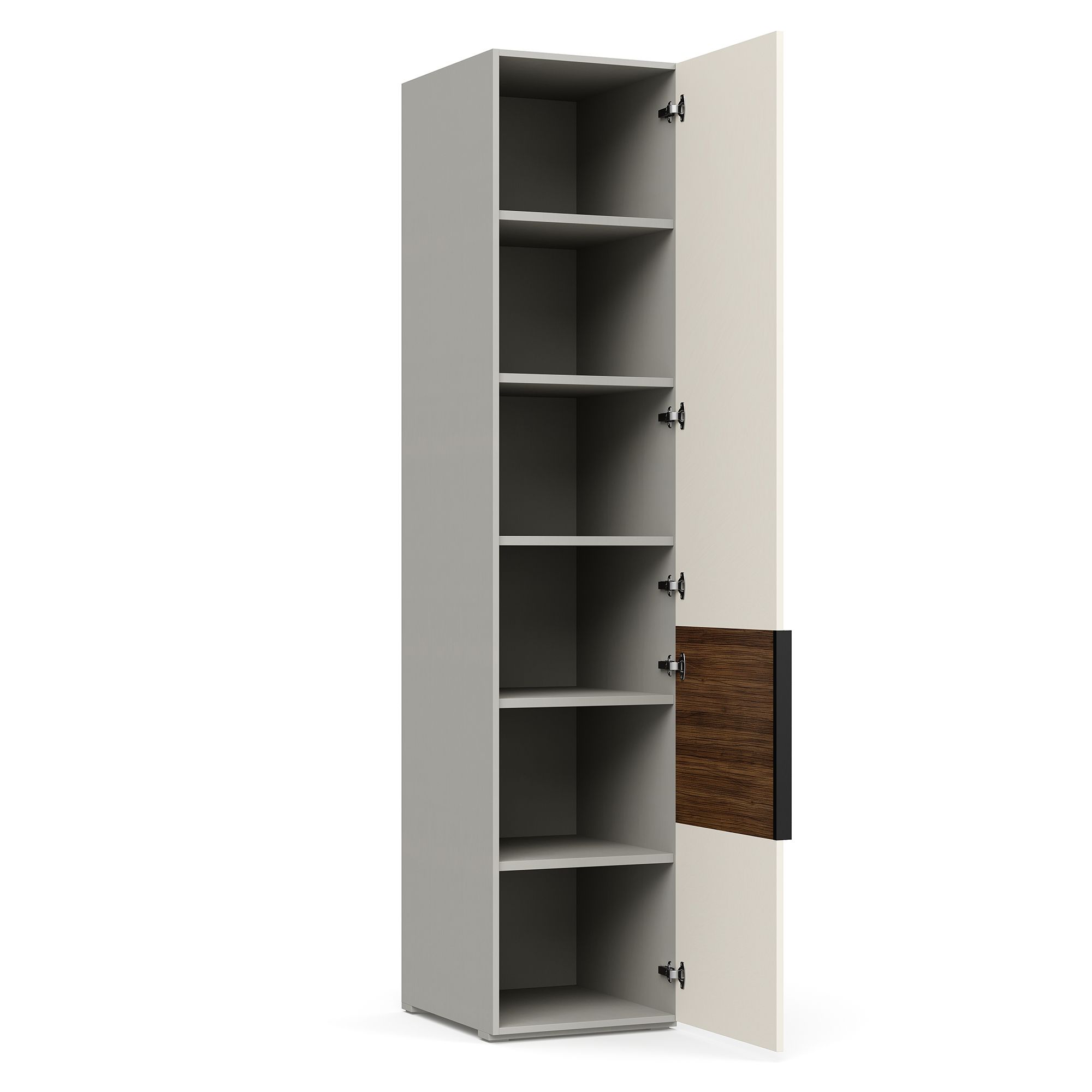 Наполнение однодверного шкафа MONAKO представляет собой систему полок. Фасад изделия выполнен в отделке премиальной шелковой эмалью и имеет вставку из натурального шпона. Корпус шкафа выполнен в текстуре Шенилл, имитирующей натуральную ткань. ВАЖНО! Боковые стенки для шкафа заказываются отдельно.