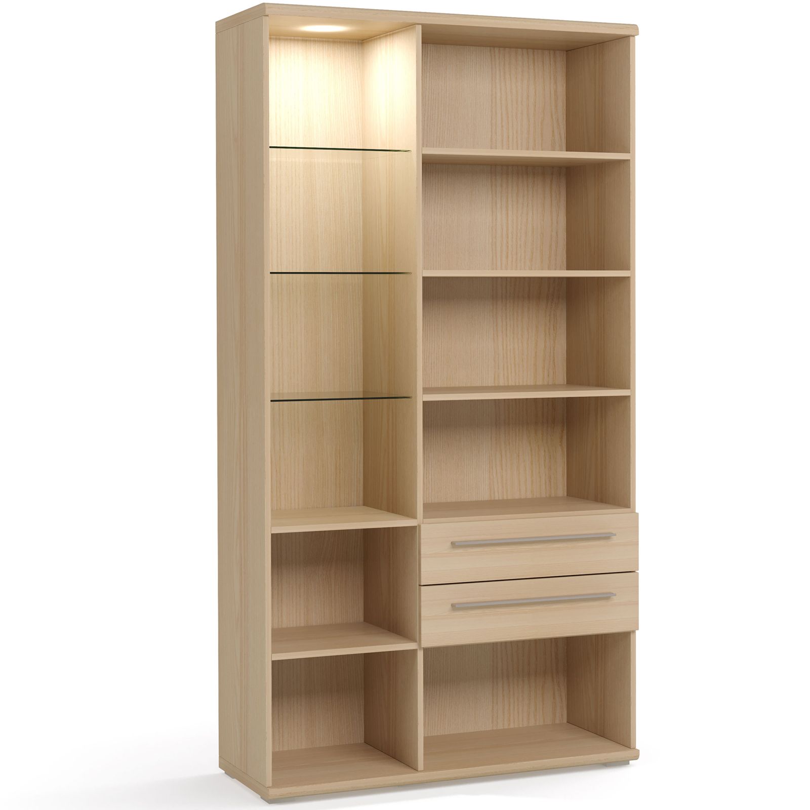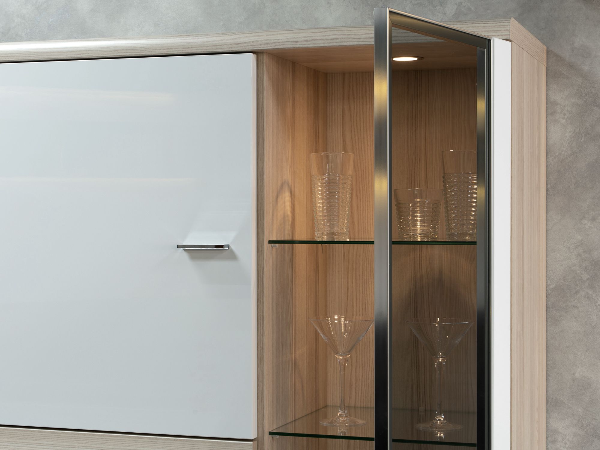 Вместительный шкаф ESTE оснащен распашными фасадами и выдвижными ящиками. За закаленным тонированным стеклом расположены стеклянные полки и система внутренней подсветки.