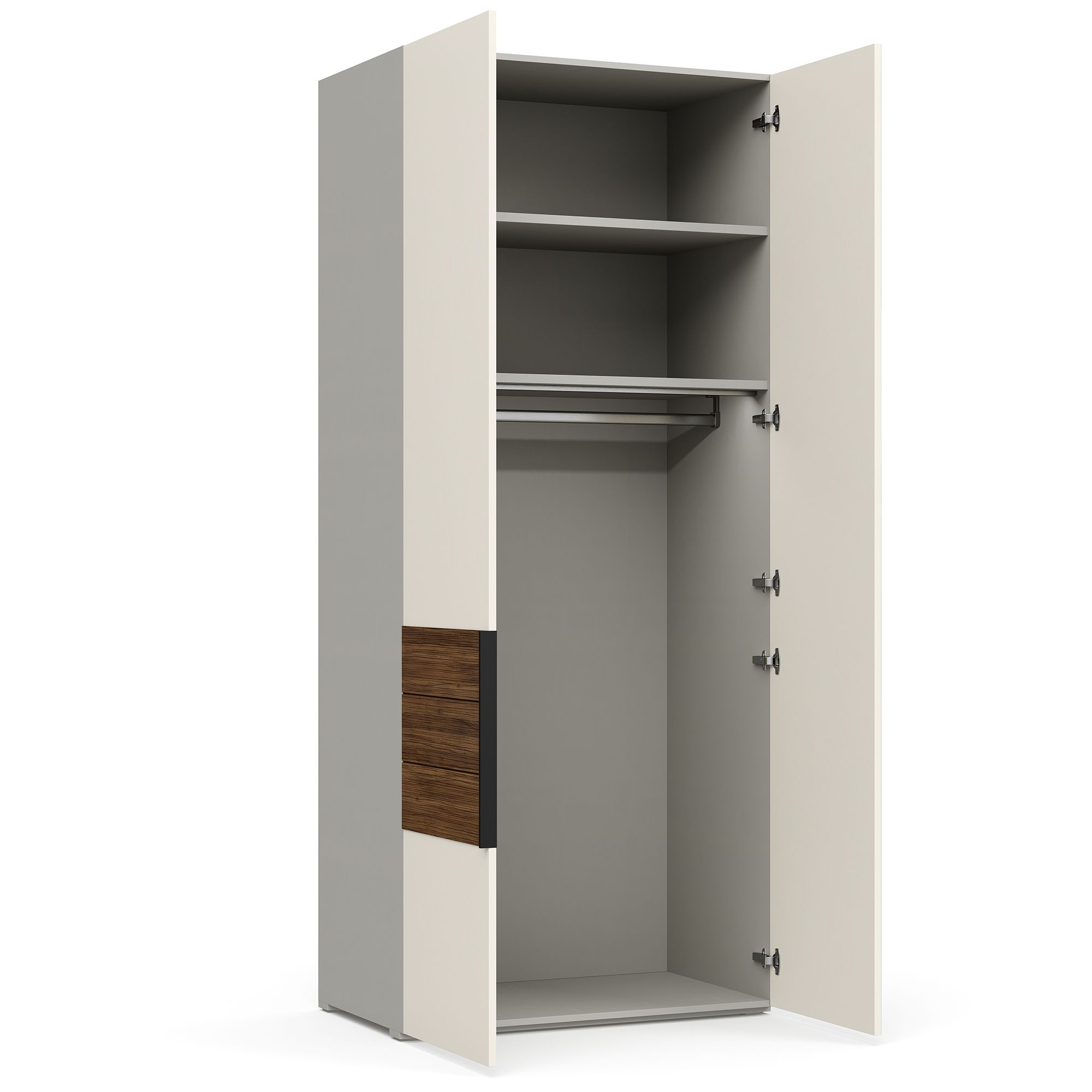 В коллекции используются стильные накладные ручки европейского производства, изготовленные из металла с черным матовым покрытием. Фурнитура отличается высокой надежностью и сохраняет безупречный внешний вид на протяжении всего срока службы мебели.