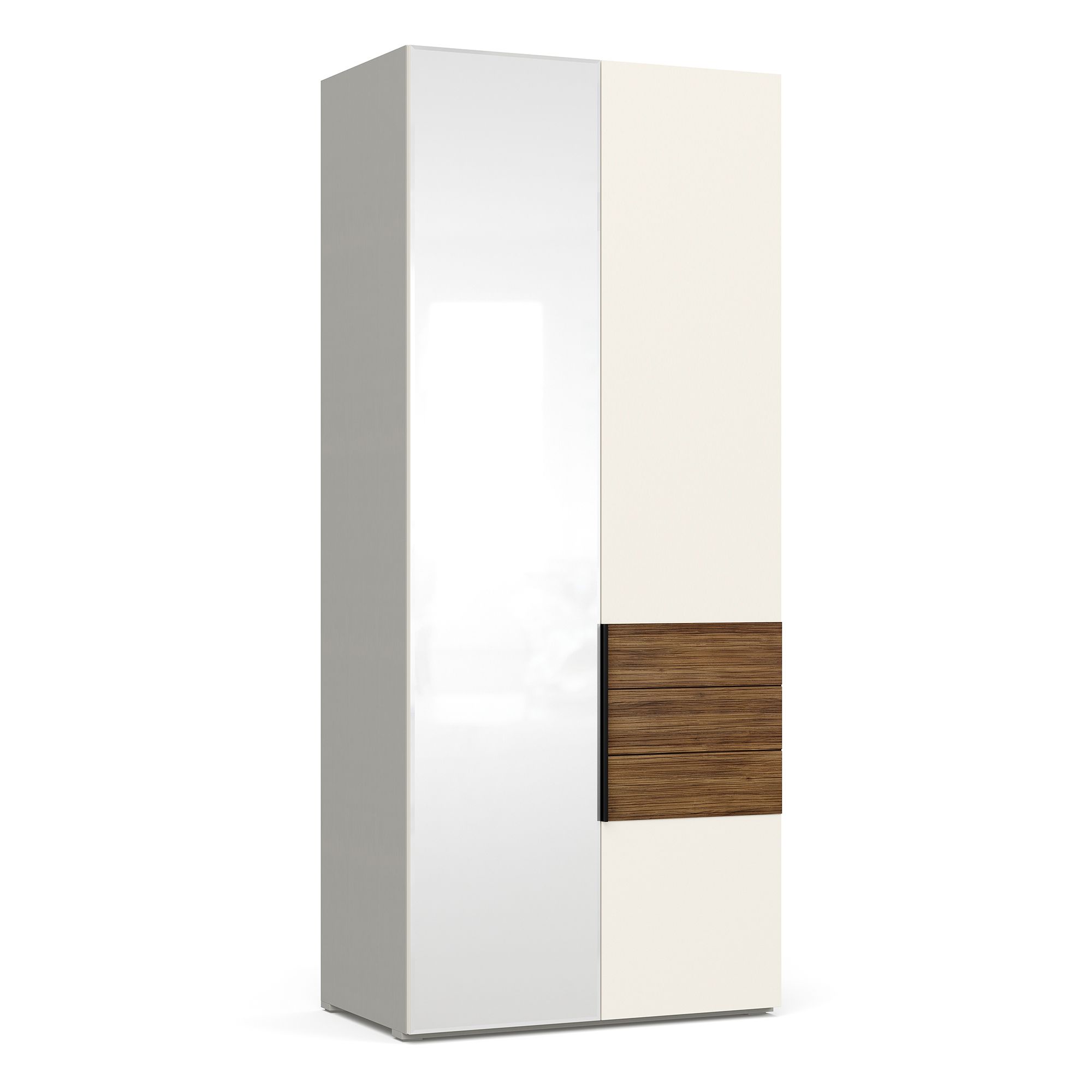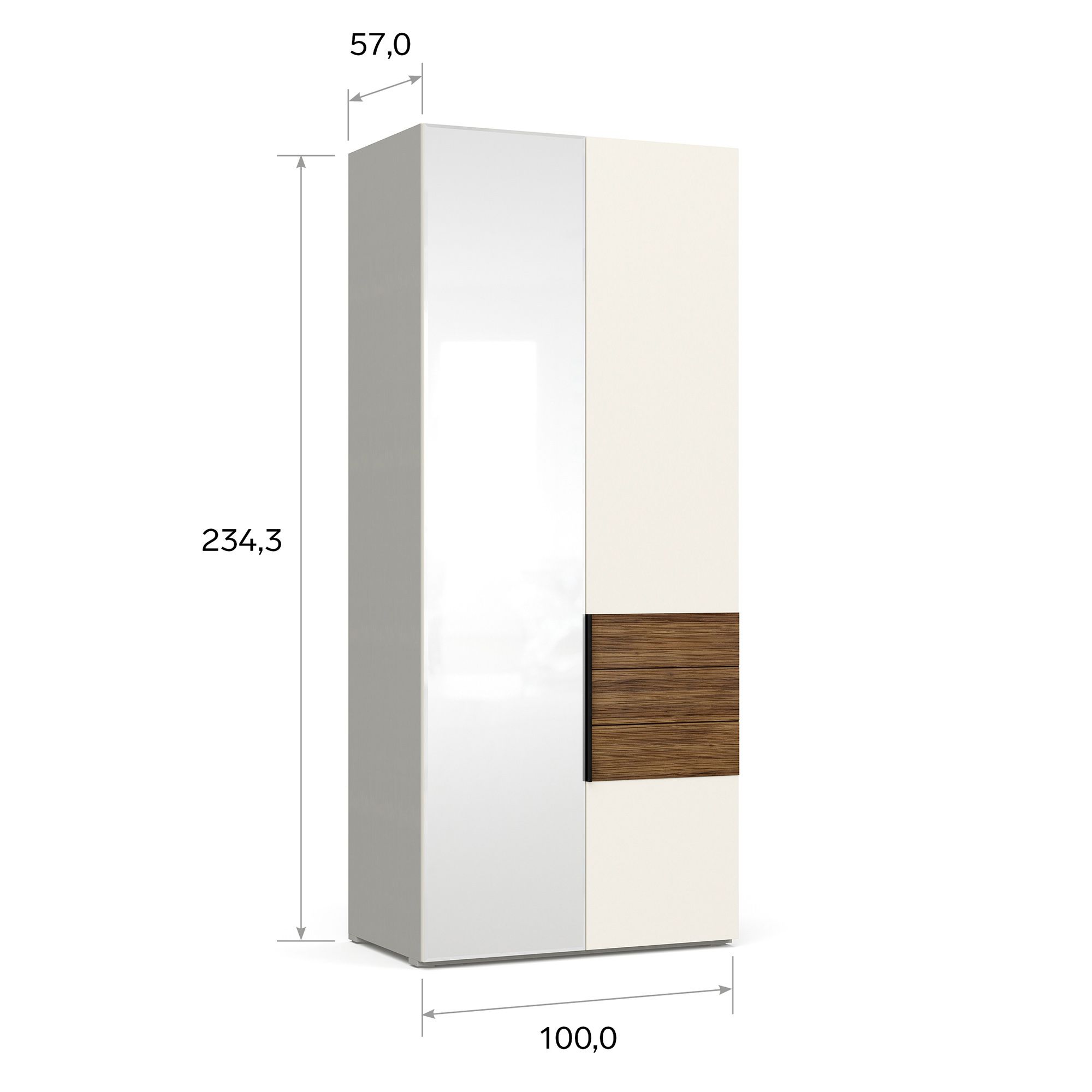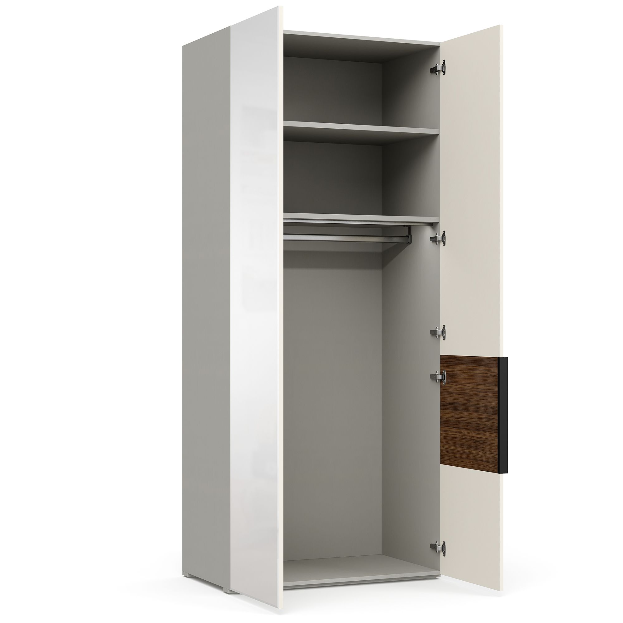 Один из фасадов двухдверного шкафа MONAKO представляет собой единое зеркальное полотно, второй выполнен в отделке премиальной шелковой эмалью и декорирован вставкой из натурального шпона. Корпус шкафа выполнен в текстуре Шенилл, имитирующей натуральную ткань. Наполнение шкафа представляет собой две полки, к нижней из которых крепится штанга для вешалок. В комплектацию включен встроенный светильник, который включается автоматически при открывании дверей. ВАЖНО! Боковые стенки для шкафа, а также система включения подсветки с трансформатором и удлинитель (2 метра) заказываются отдельно.