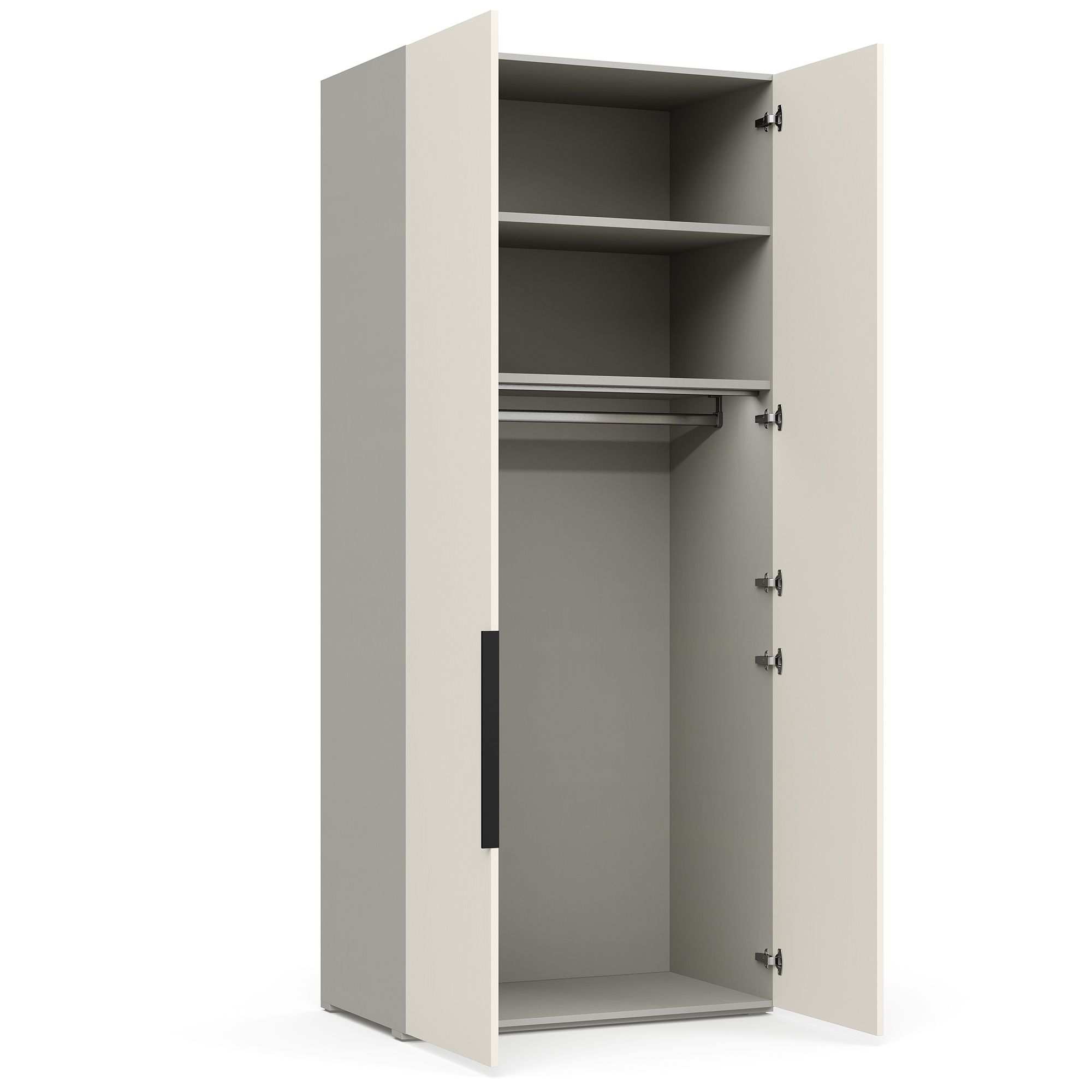 Наполнение двухдверного шкафа MONAKO с фасадами в премиальной шелковой эмали представляет собой две полки, к нижней из которых крепится штанга для вешалок. Корпус шкафа выполнен в текстуре Шенилл, имитирующей натуральную ткань. В комплектацию включен встроенный светильник, который включается автоматически при открывании дверей. ВАЖНО! Боковые стенки для шкафа, а также система включения подсветки с трансформатором и удлинитель (2 метра) заказываются отдельно.