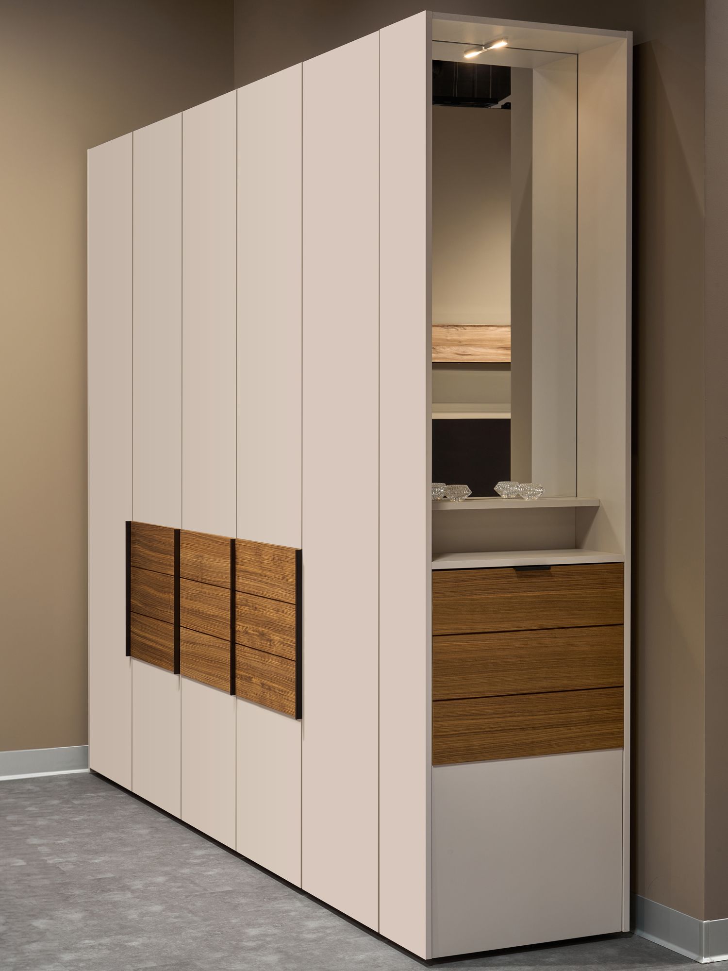 Коллекция включает завершающие шкафы с нишей, зеркалом и полкой. В нижней части шкафа расположена секция для хранения с распашным фасадом, декорированным вставкой в отделке шпоном. В качестве опции шкаф можно оборудовать светильником (заказывается отдельно).