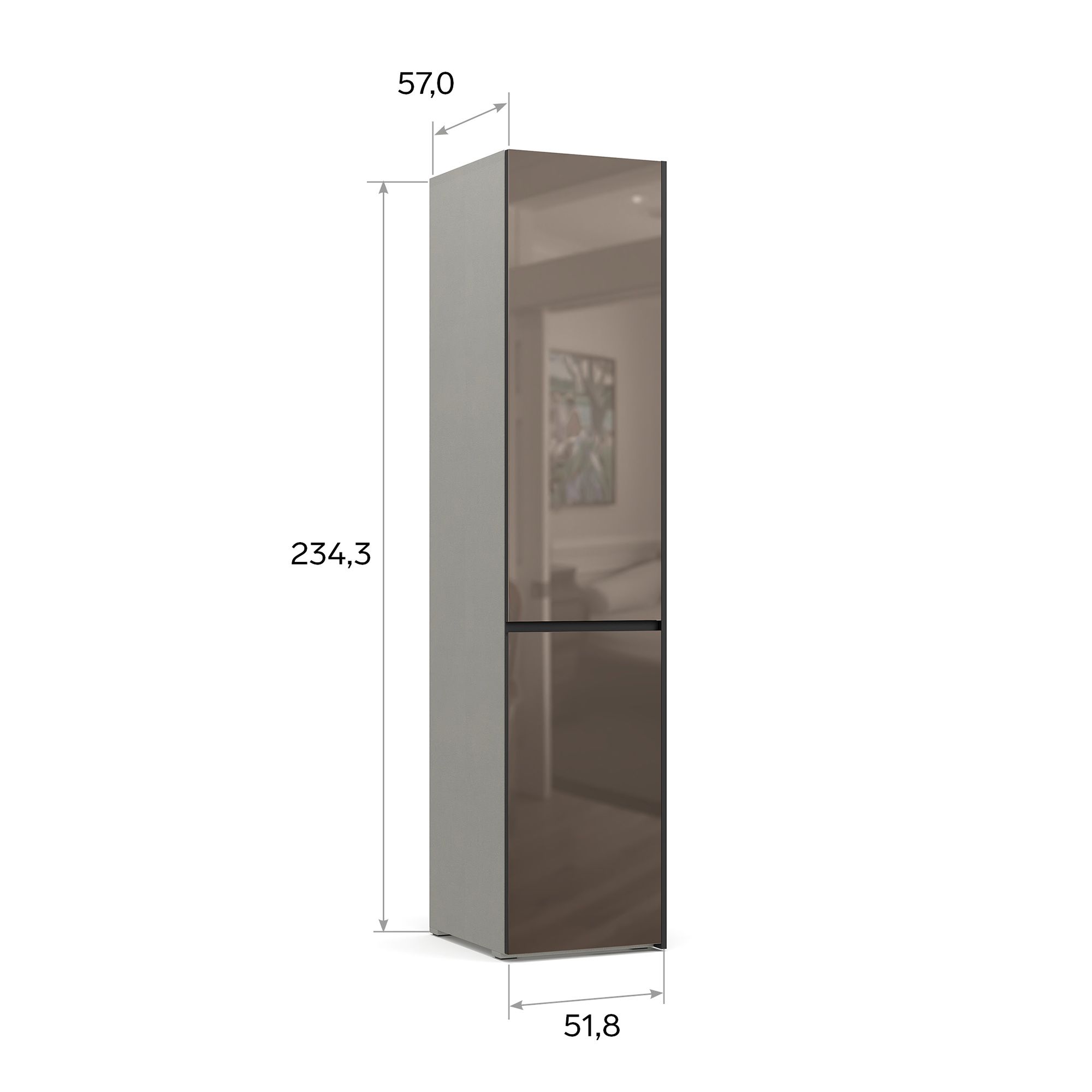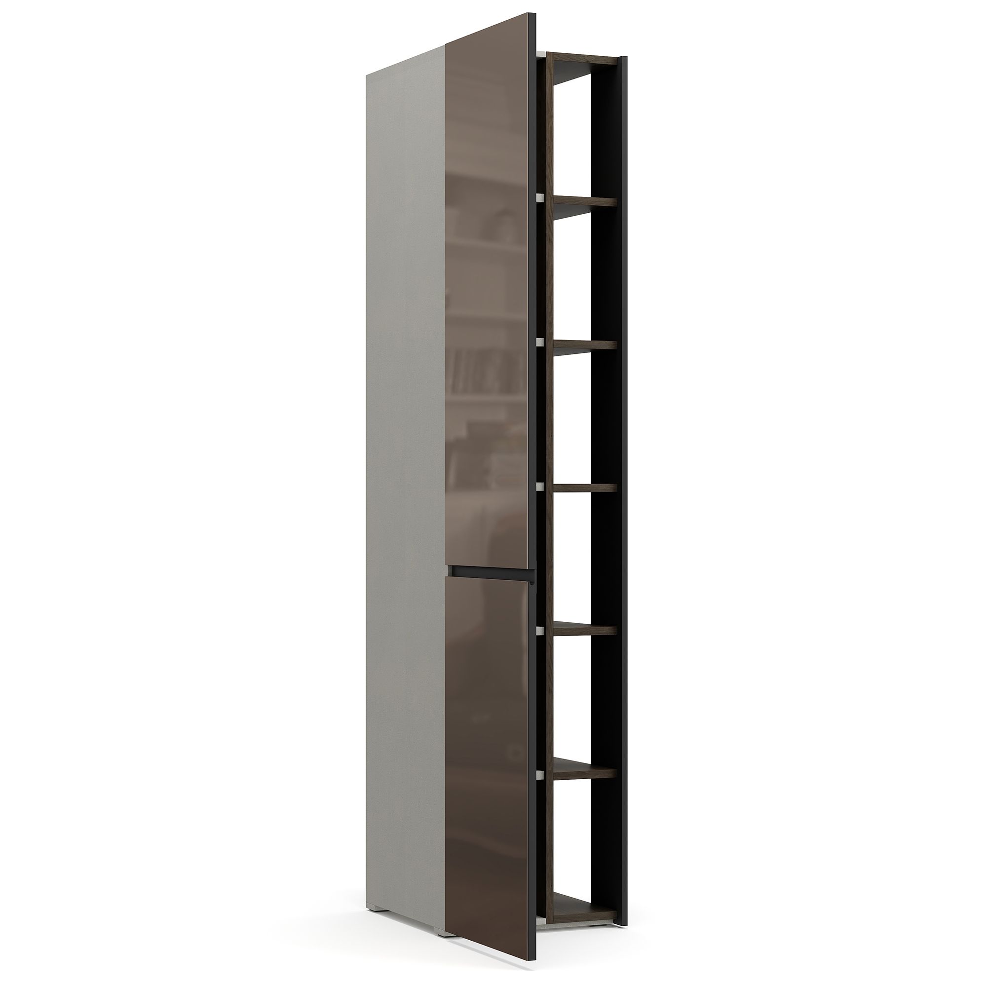 Шкафы BRUNO используются в качестве завершающих элементов системы хранения и могут приставляться как к прямым, так и к угловым моделям. Конструкция шкафа предусматривает закрытую нишу с полками, выполненную в отделке текстурой Шенилл, а также открытую нишу с полками в древесной текстуре. Глубина шкафа указана без учета фасада, ширина – c учетом планки (1,8 см).