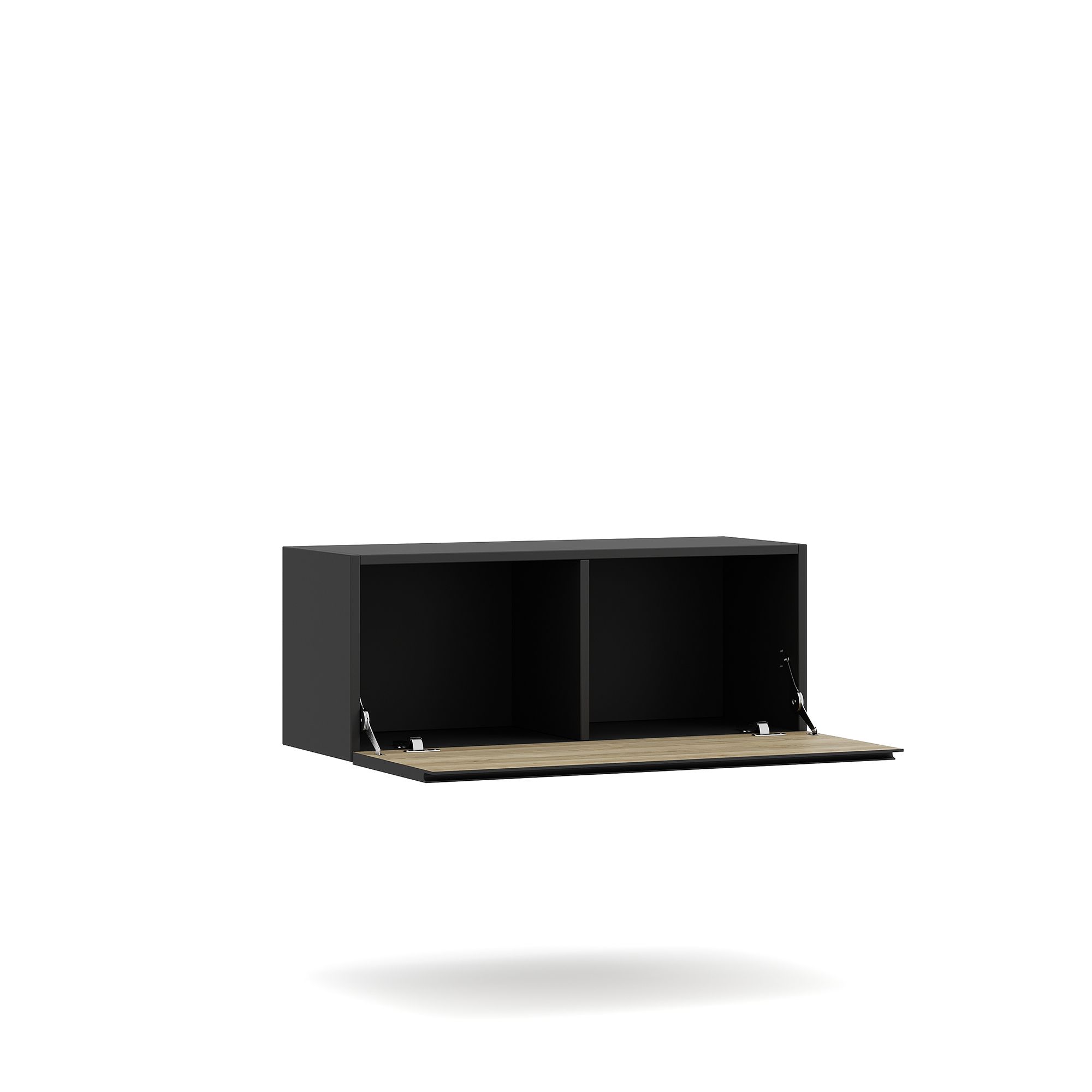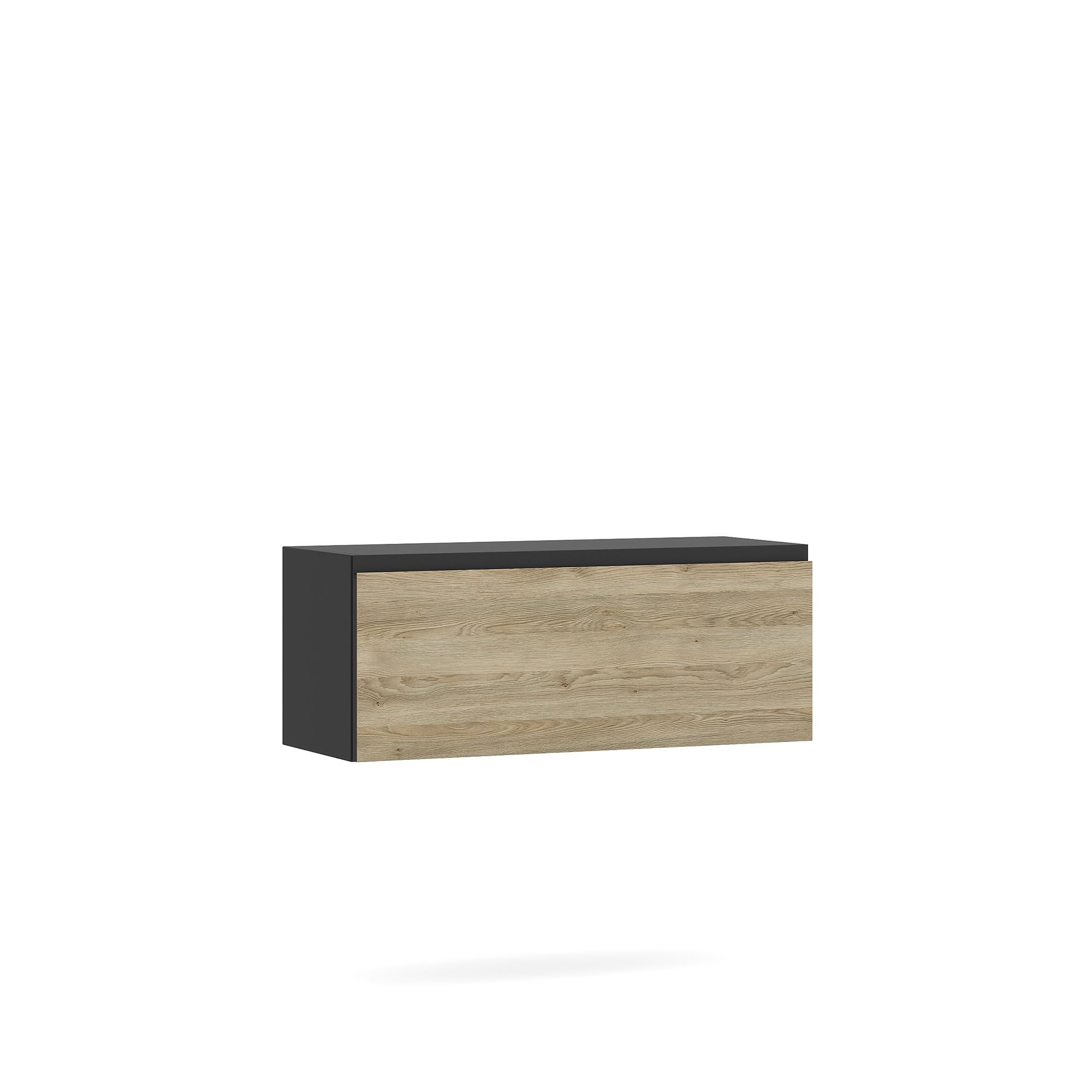 Навесной шкаф BRUNO оснащен откидным фасадом (открывание вниз) и эргономичной J-ручкой, графитовый оттенок которой создает контраст с отделкой фасада. Механизм открывания предусматривает регулировку удерживающего усилия. В качестве опции предлагаются регулируемые опоры высотой 18 мм или высокие металлические опоры, позволяющие превратить шкаф в функциональную тумбу. В стоимость изделия включена крышка в древесной текстуре. При использовании шкафа в качестве тумбы крышку можно дополнительно оснастить мягким элементом (заказываются отдельно).