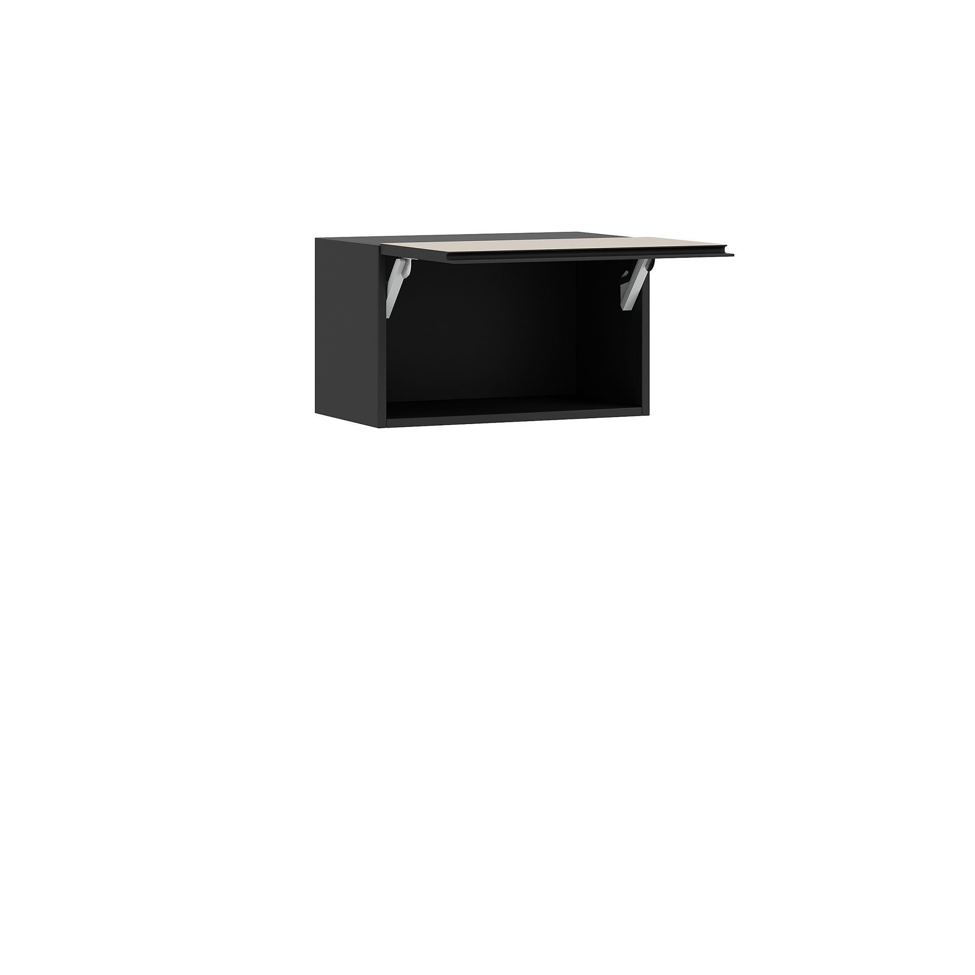 Навесной шкаф BRUNO оснащен откидным фасадом (открывание вверх) и эргономичной J-ручкой, графитовый оттенок которой создает контраст с отделкой фасада. Механизм открывания предусматривает регулировку удерживающего усилия.В стоимость изделия включена крышка в древесной текстуре. В случае, если шкаф находится выше зоны видимости, применение крышки не обязательно.