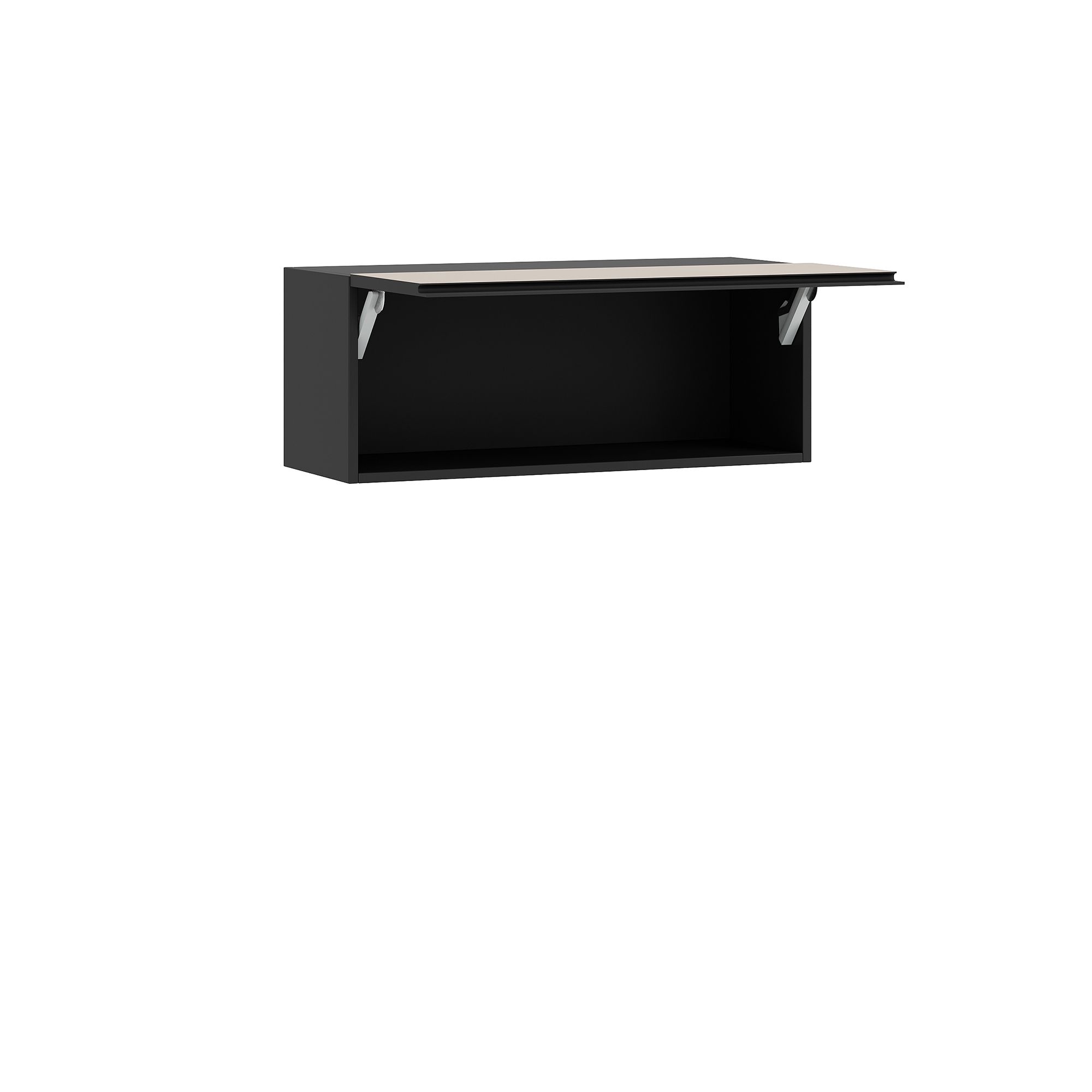 Навесной шкаф BRUNO оснащен откидным фасадом (открывание вверх) и эргономичной J-ручкой, графитовый оттенок которой создает контраст с отделкой фасада. Механизм открывания предусматривает регулировку удерживающего усилия. В стоимость изделия включена крышка в древесной текстуре. В случае, если шкаф находится выше зоны видимости, применение крышки не обязательно.