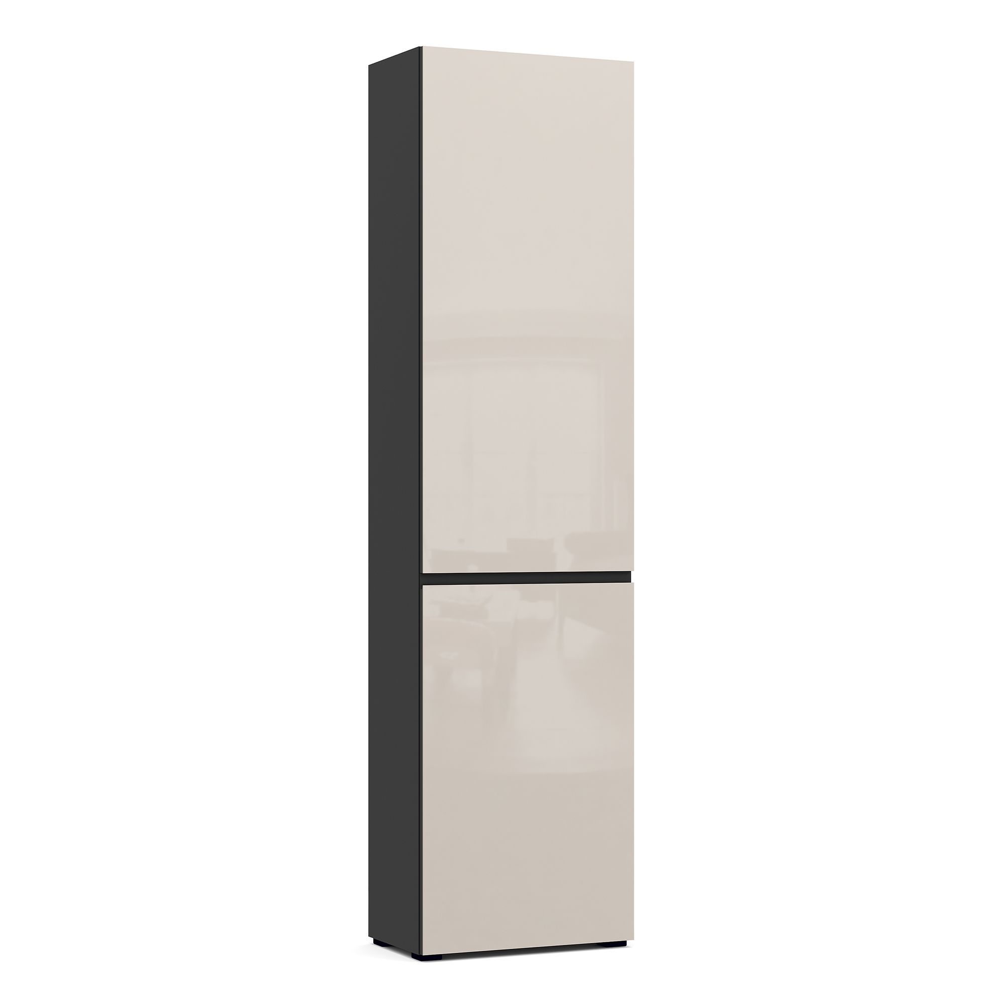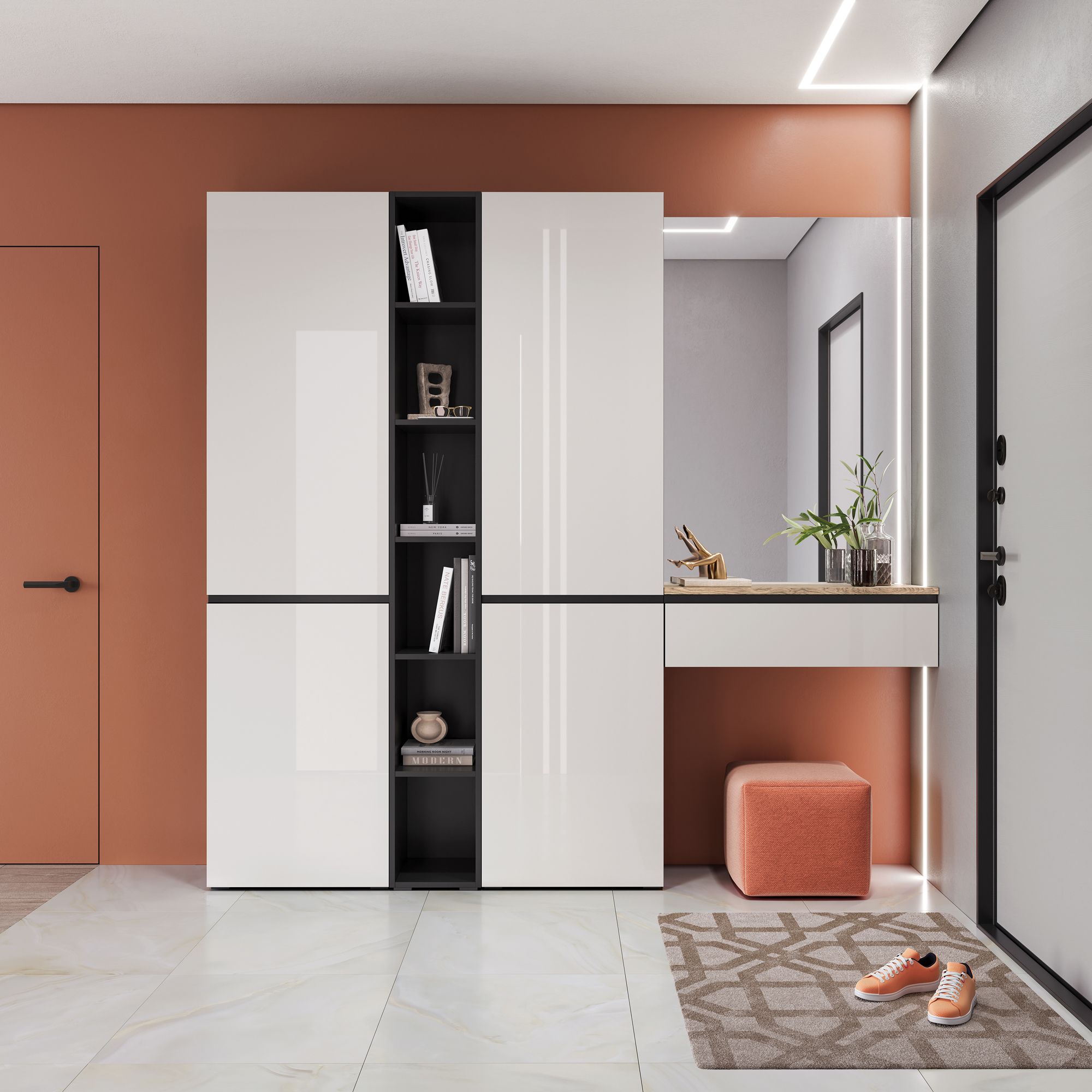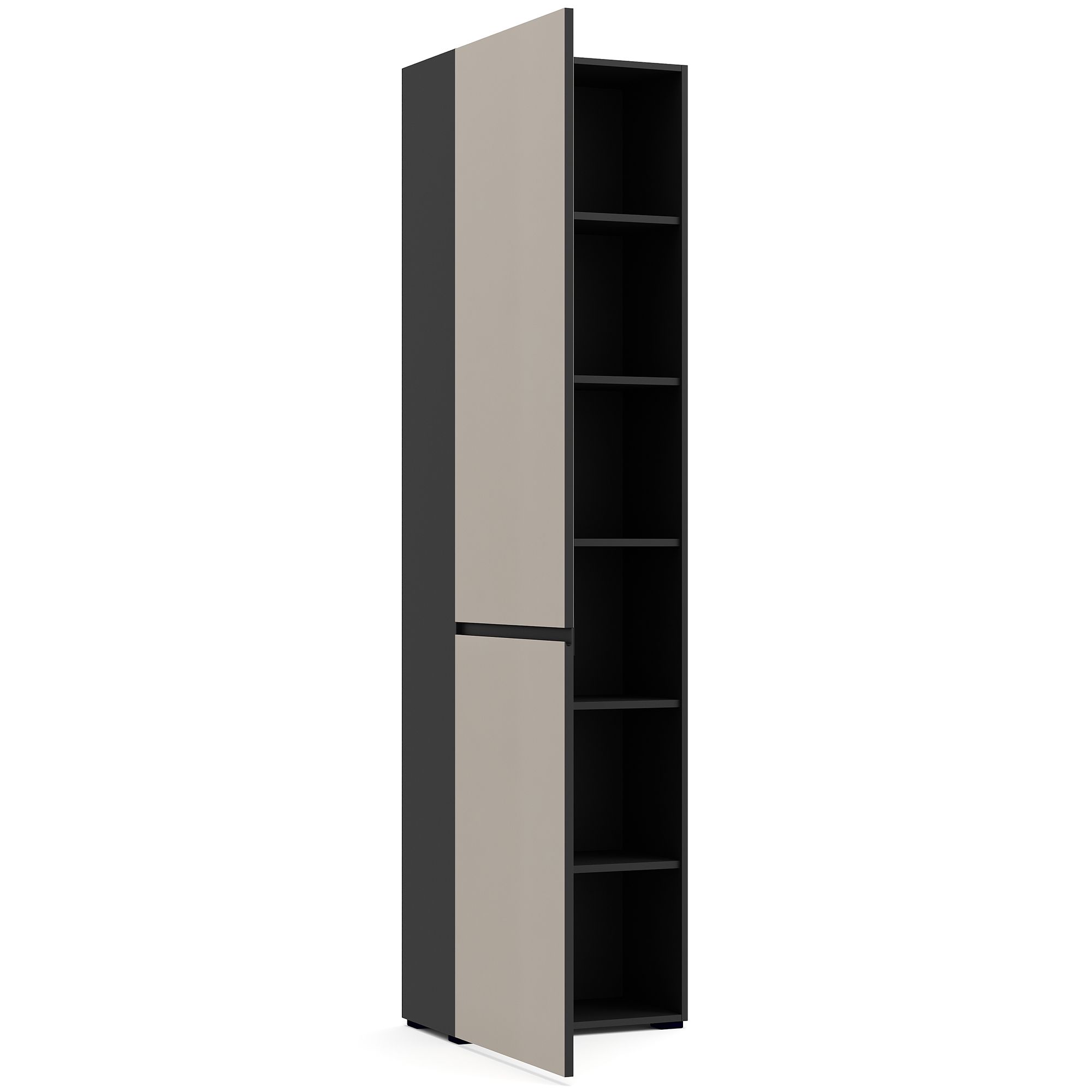 За фасадом однодверного шкафа BRUNO, оснащенного эргономичной J-ручкой контрастного графитового оттенка, располагается система полок. Возможно исполнение как с правым, так и с левым открыванием.