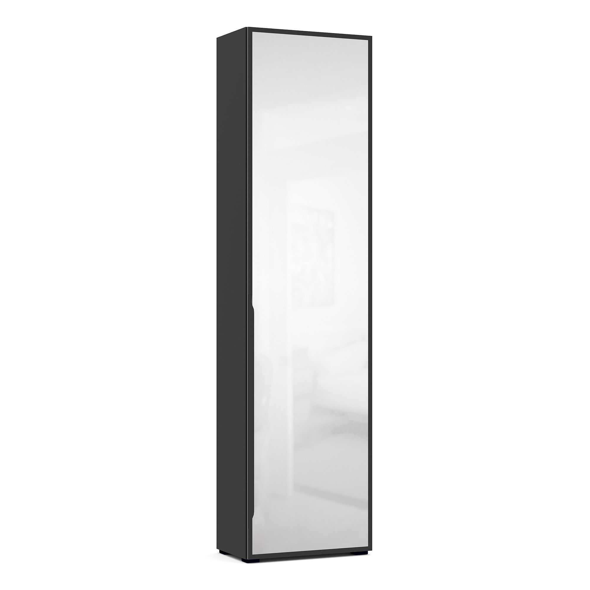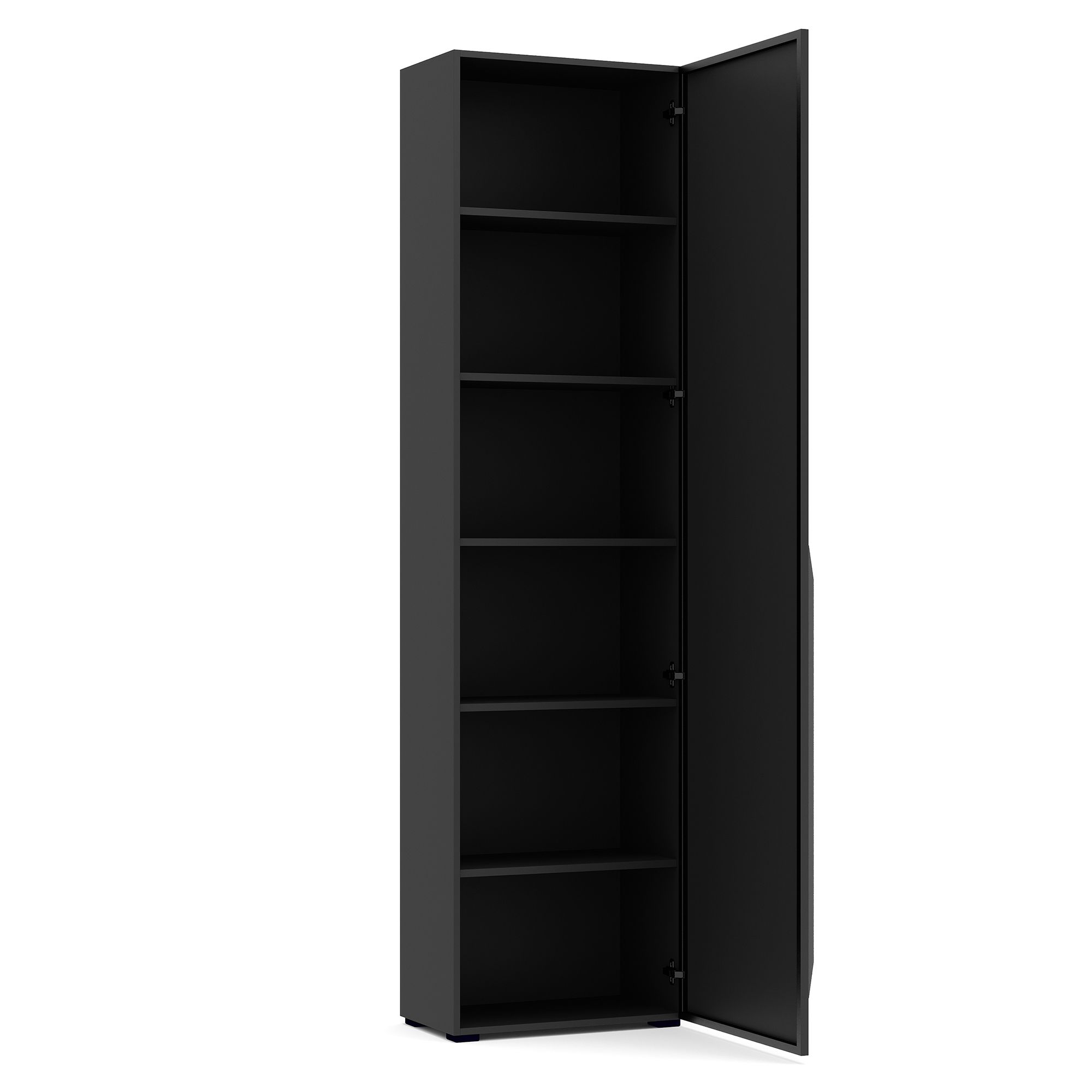 За зеркальным фасадом однодверного шкафа BRUNO располагается система полок. Шкаф оснащается накладной ручкой черного цвета. Возможно исполнение как с правым, так и с левым открыванием.