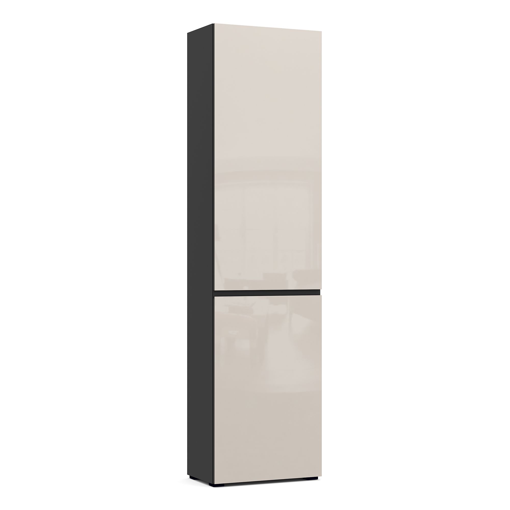 За фасадом однодверного шкафа BRUNO, оснащенного эргономичной J-ручкой контрастного графитового оттенка, располагаются две полки, к верхней из которых крепится штанга для вешалок. Возможно исполнение как с правым, так и с левым открыванием.