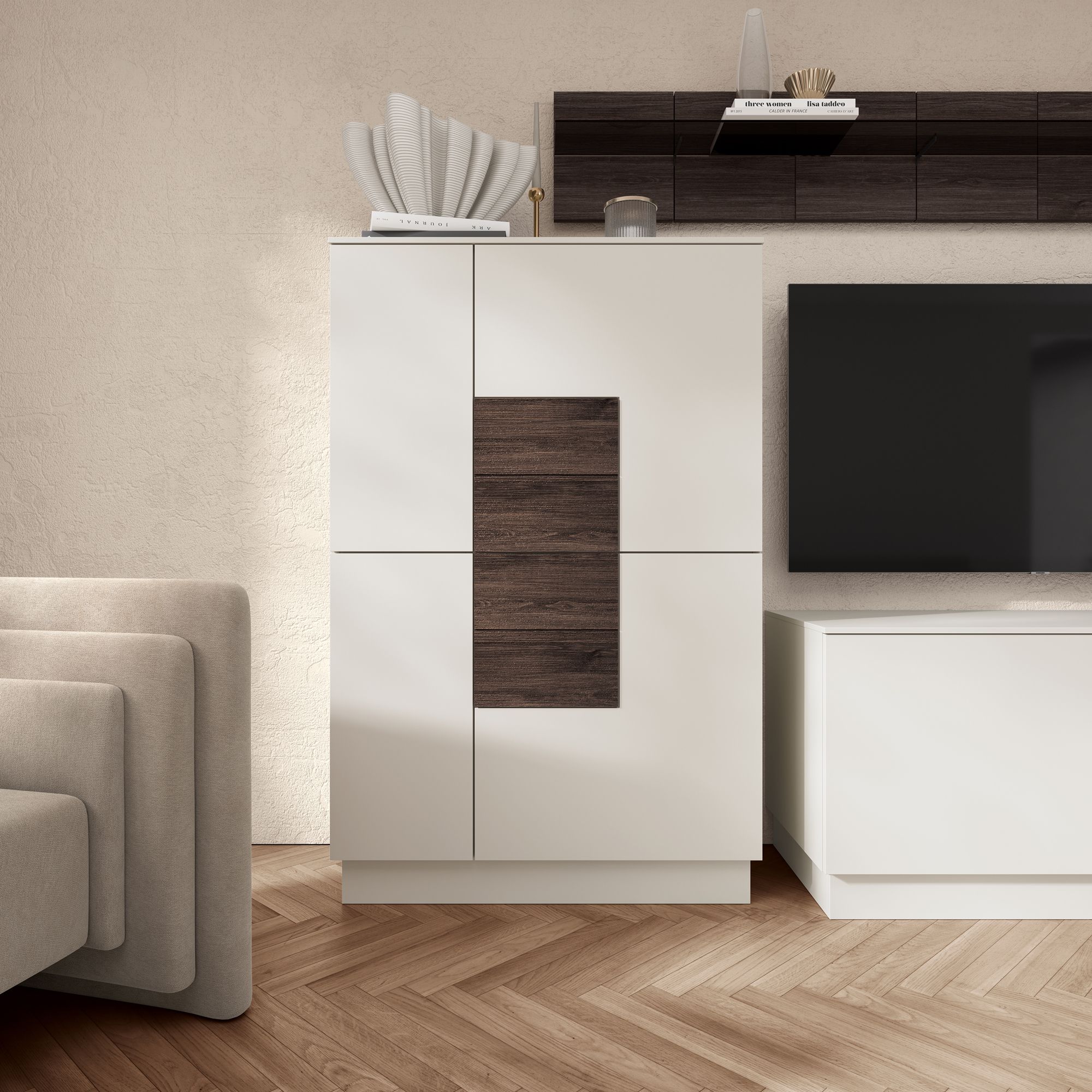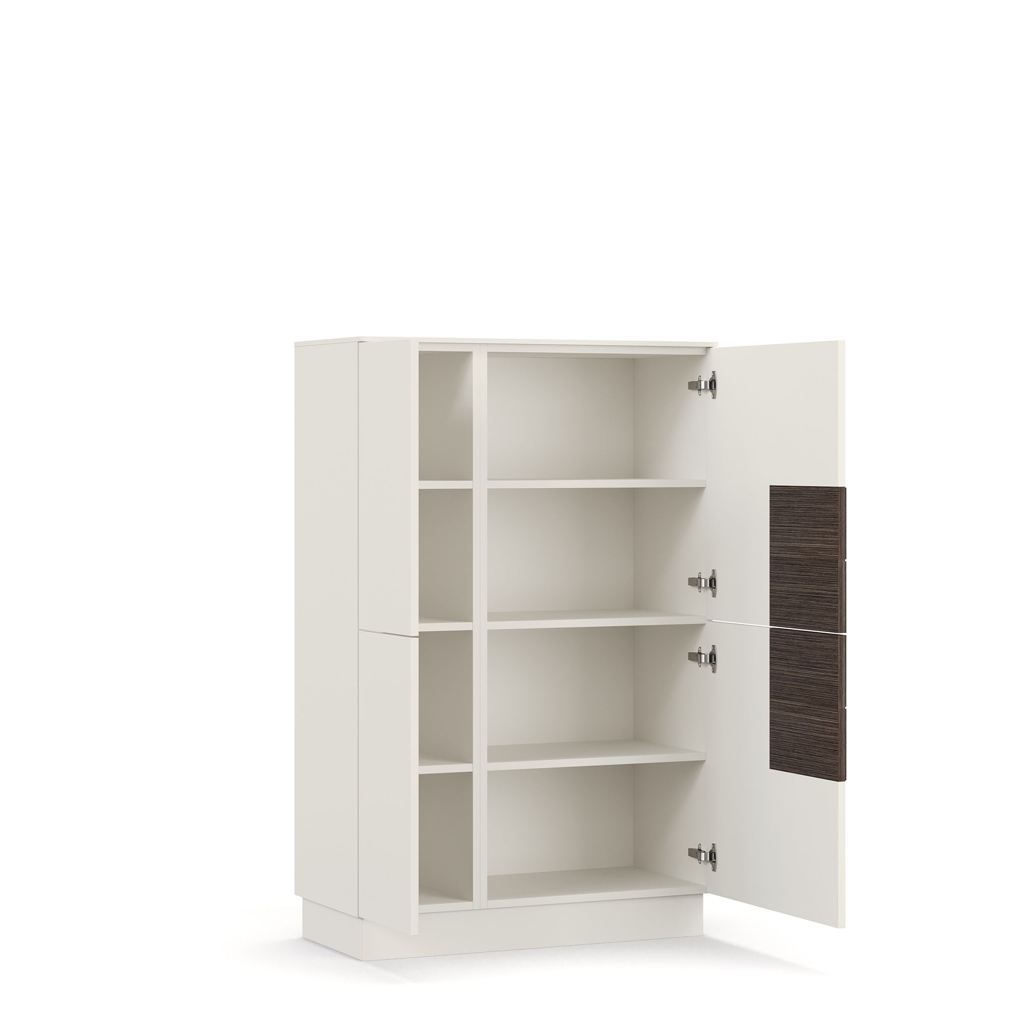 Узкая секция шкафа MONAKO оснащена двумя распашными фасадами в отделке эмалью. Фасады широкой части имеют вставки, декорированные шпоном. За фасадами располагается система полок из ЛДСП.