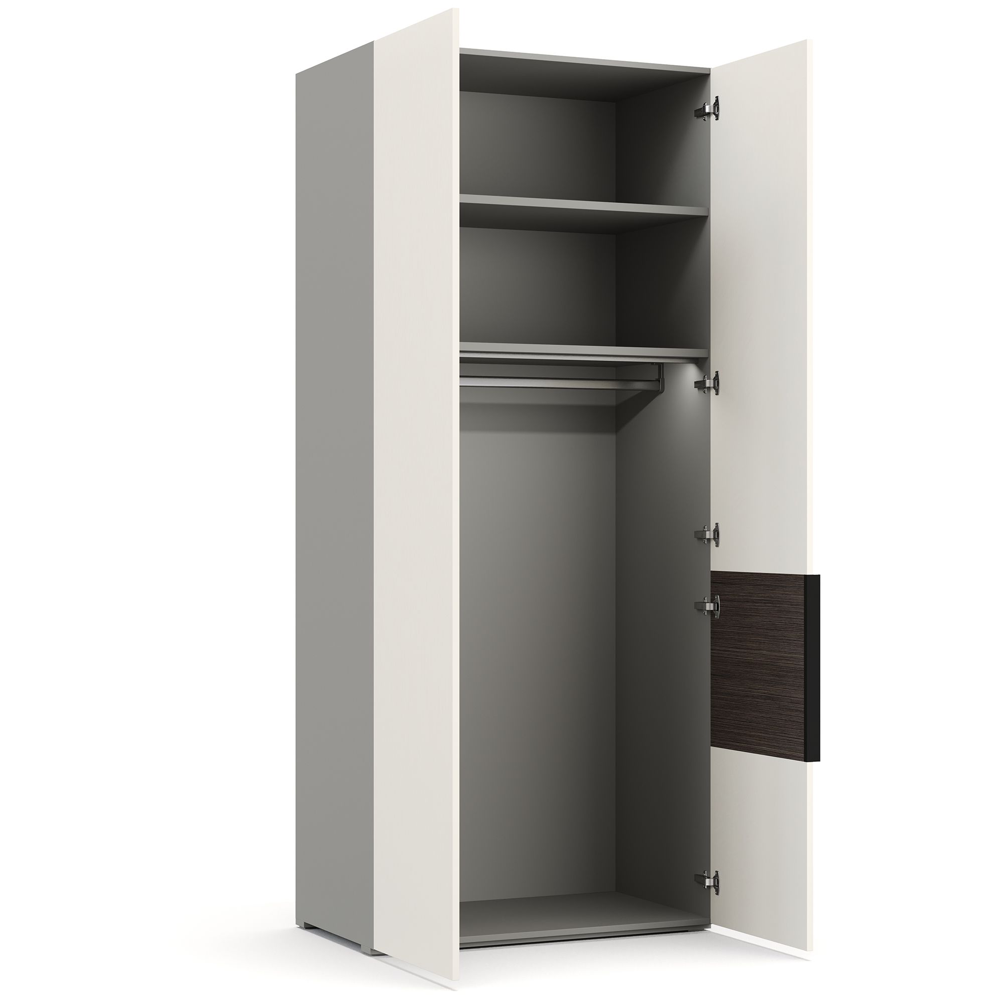 Наполнение двухдверного шкафа MONAKO представляет собой две полки, к нижней из которых крепится штанга для вешалок. Фасады изделия выполнены в отделке премиальной шелковой эмалью, один из них декорирован вставкой из натурального шпона. Корпус шкафа выполнен в текстуре Шенилл, имитирующей натуральную ткань. В комплектацию включен встроенный светильник, который включается автоматически при открывании дверей. ВАЖНО! Боковые стенки для шкафа, а также система включения подсветки с трансформатором и удлинитель (2 метра) заказываются отдельно.