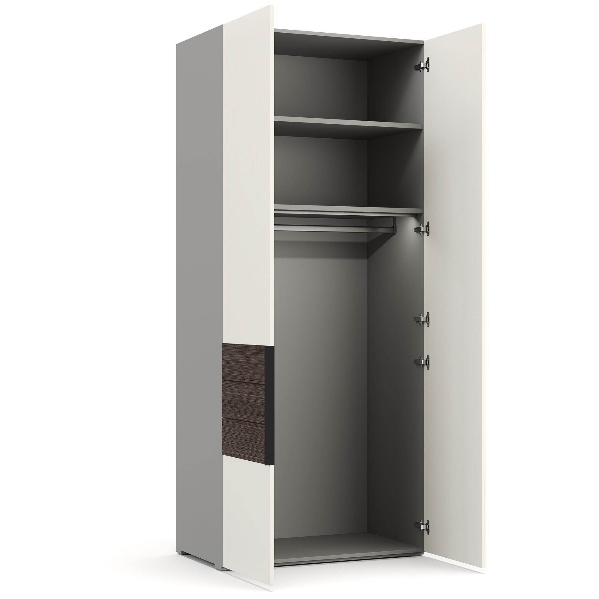 Один из фасадов двухдверного шкафа MONAKO представляет собой единое зеркальное полотно, второй выполнен в отделке премиальной шелковой эмалью и декорирован вставкой из натурального шпона. Корпус шкафа выполнен в текстуре Шенилл, имитирующей натуральную ткань. Наполнение шкафа представляет собой две полки, к нижней из которых крепится штанга для вешалок. В комплектацию включен встроенный светильник, который включается автоматически при открывании дверей. ВАЖНО! Боковые стенки для шкафа, а также система включения подсветки с трансформатором и удлинитель (2 метра) заказываются отдельно.