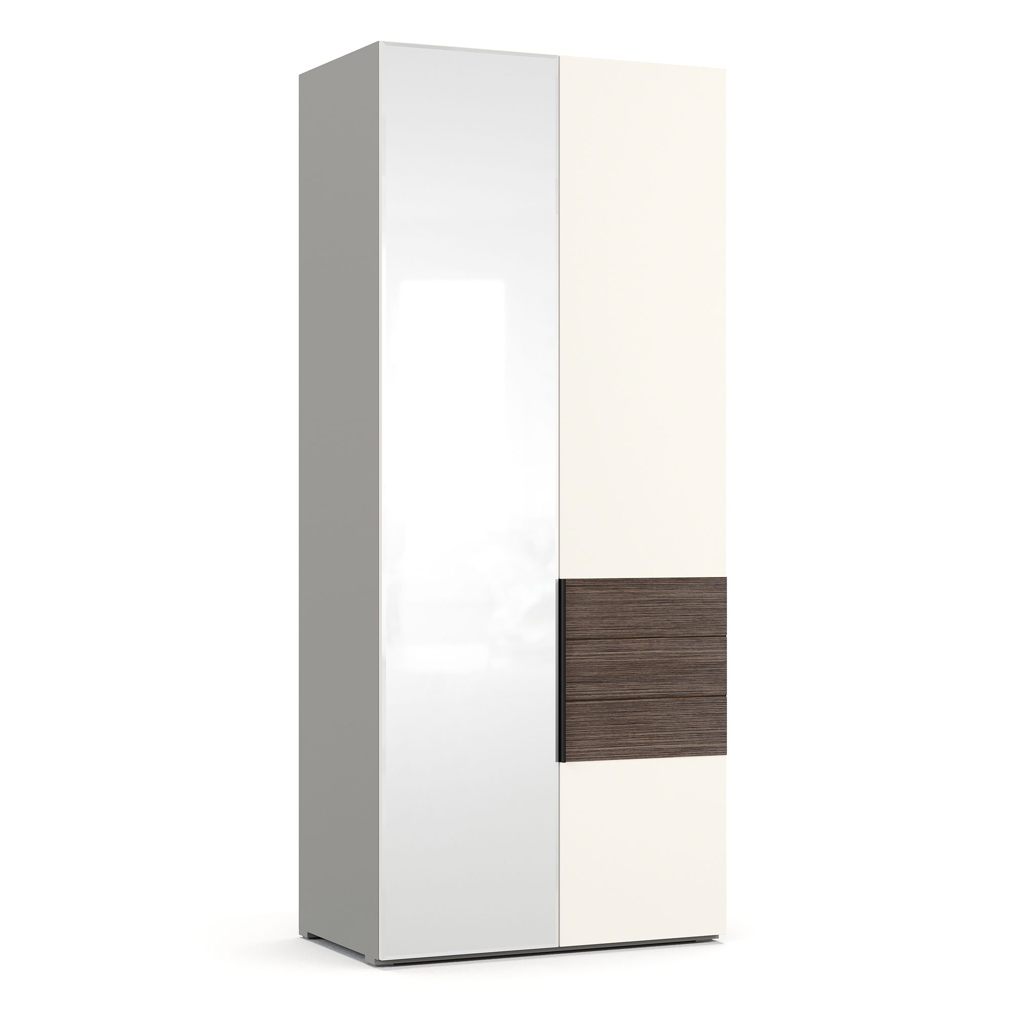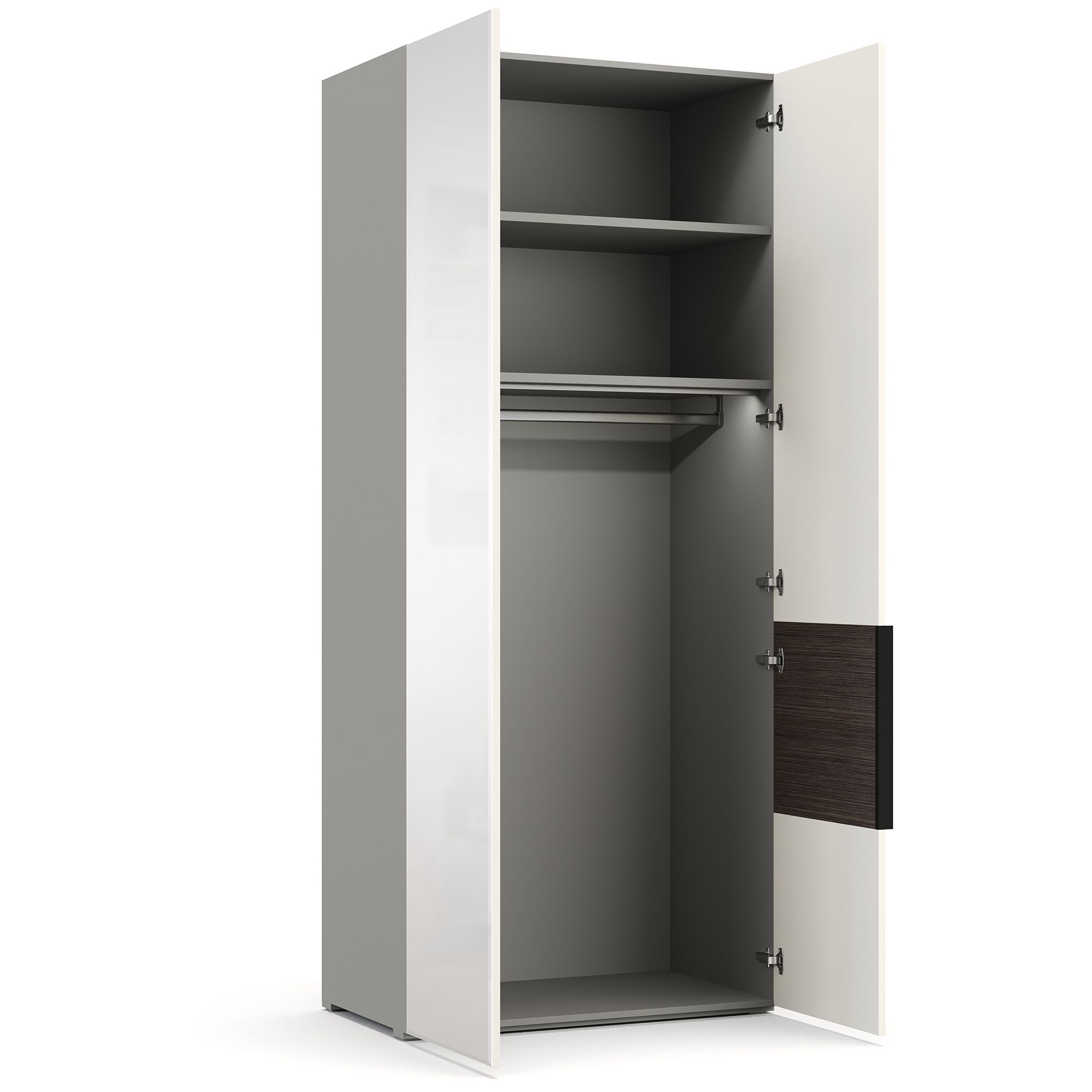Один из фасадов двухдверного шкафа MONAKO представляет собой единое зеркальное полотно, второй выполнен в отделке премиальной шелковой эмалью и декорирован вставкой из натурального шпона. Корпус шкафа выполнен в текстуре Шенилл, имитирующей натуральную ткань. Наполнение шкафа представляет собой две полки, к нижней из которых крепится штанга для вешалок. В комплектацию включен встроенный светильник, который включается автоматически при открывании дверей. ВАЖНО! Боковые стенки для шкафа, а также система включения подсветки с трансформатором и удлинитель (2 метра) заказываются отдельно.