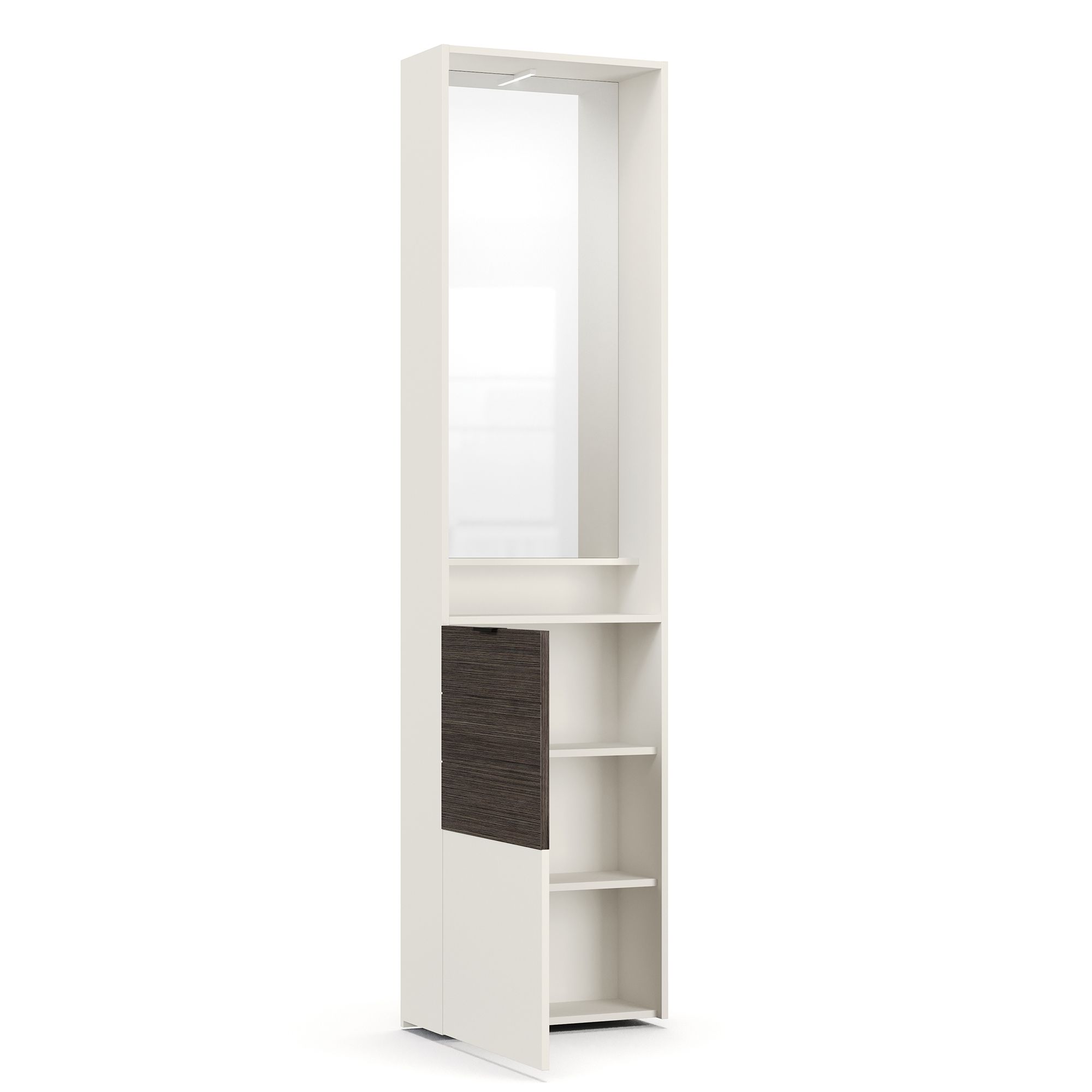 Завершающий шкаф MONAKO с распашным фасадом, нишей с зеркалом и полкой может располагаться как в левой, так и в правой части шкафной композиции. При желании модуль можно дополнить светильником (заказывается отдельно).