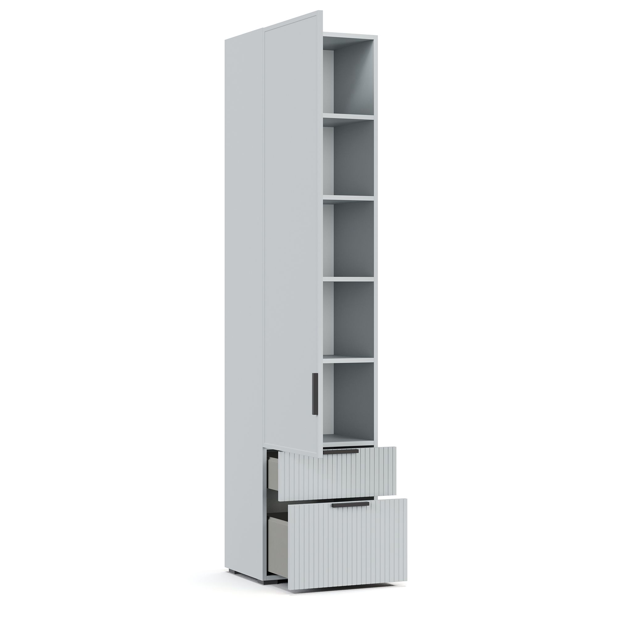 Верхняя часть шкафа-пенала NAPOLI оснащена сплошным фасадом с тонкой рамкой, за которым располагаются полки из ЛДСП. Возможно как левое, так и правое открывание фасада. В нижней части расположены два выдвижных ящика, декорированных вертикальной фрезеровкой. В качестве опции предлагается установка шкафа на опоры высотой 12 см (заказываются отдельно).
