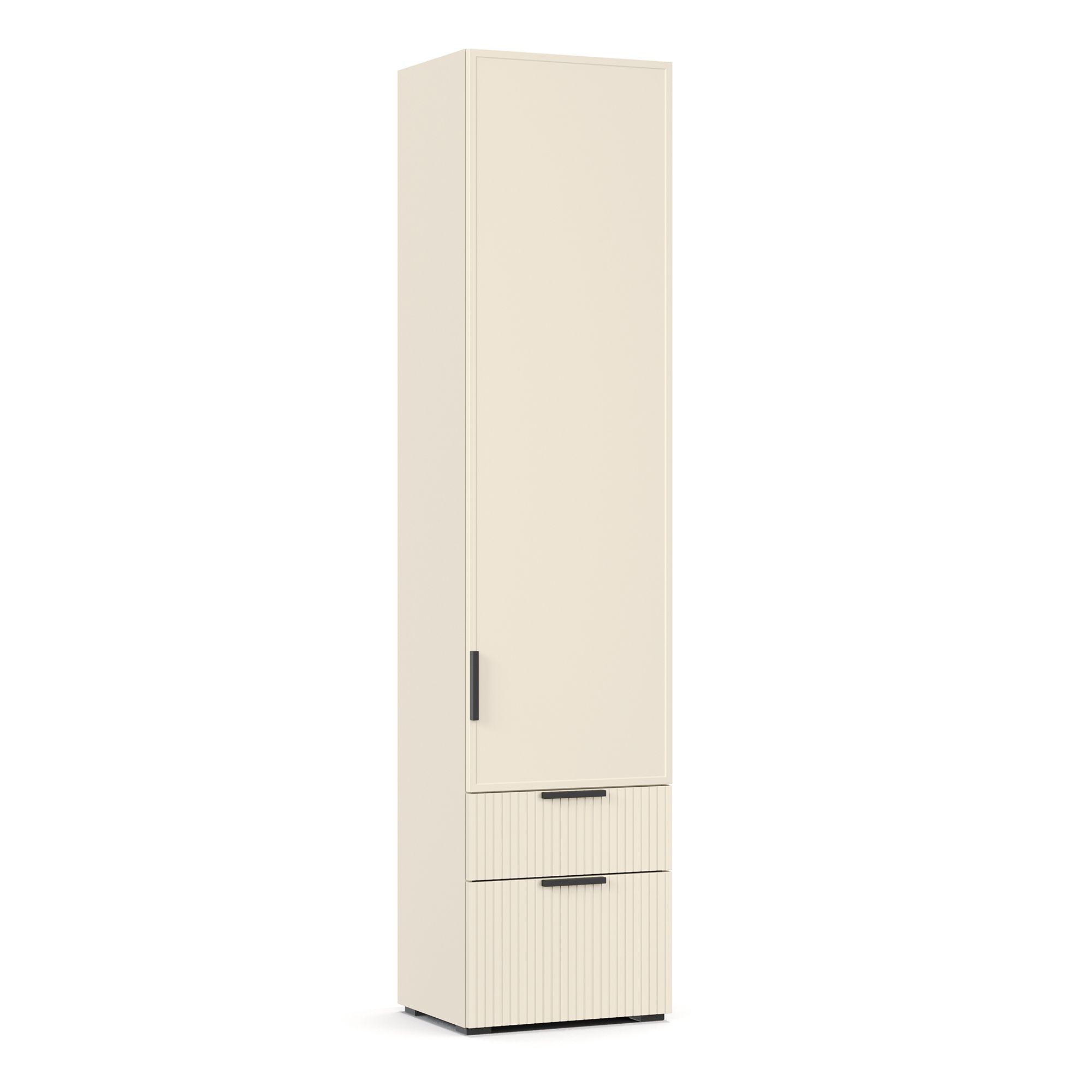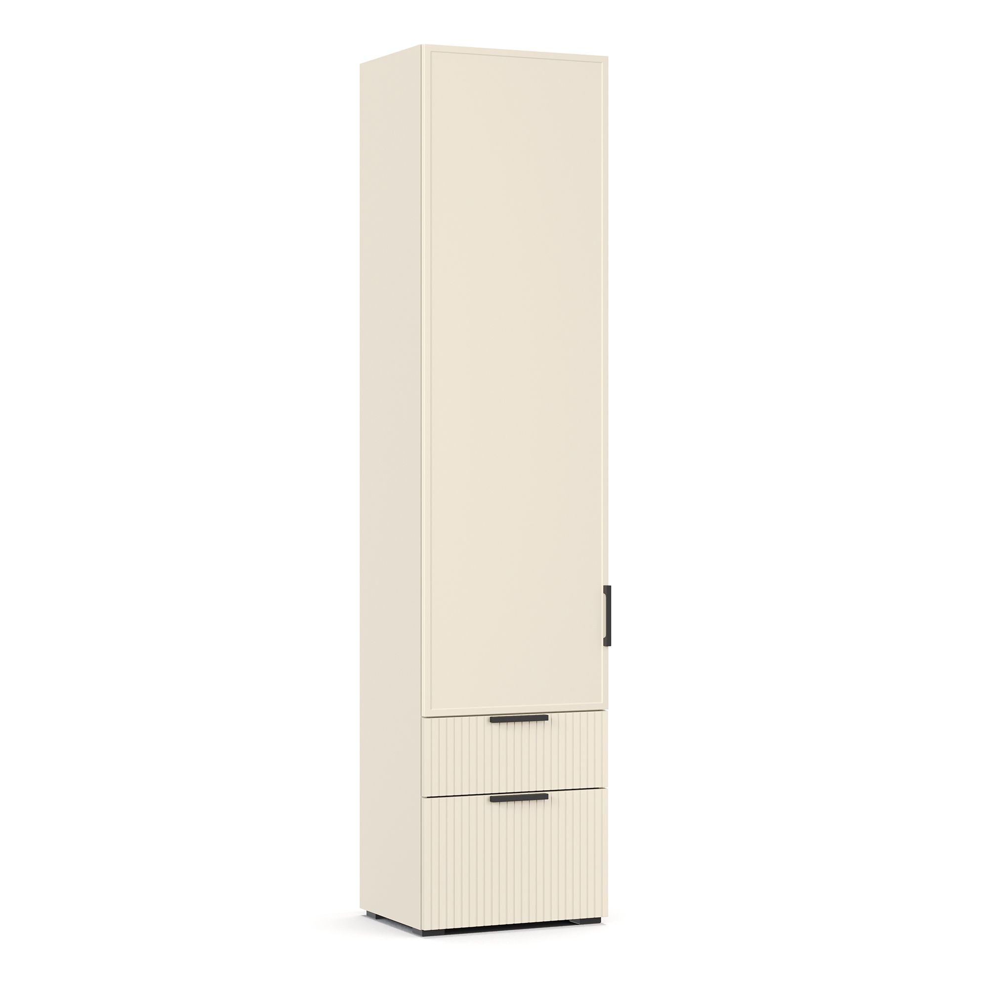 Верхняя часть шкафа-пенала NAPOLI оснащена сплошным фасадом с тонкой рамкой, за которым располагаются полки из ЛДСП. Возможно как левое, так и правое открывание фасада. В нижней части расположены два выдвижных ящика, декорированных вертикальной фрезеровкой. В качестве опции предлагается установка шкафа на опоры высотой 12 см (заказываются отдельно).