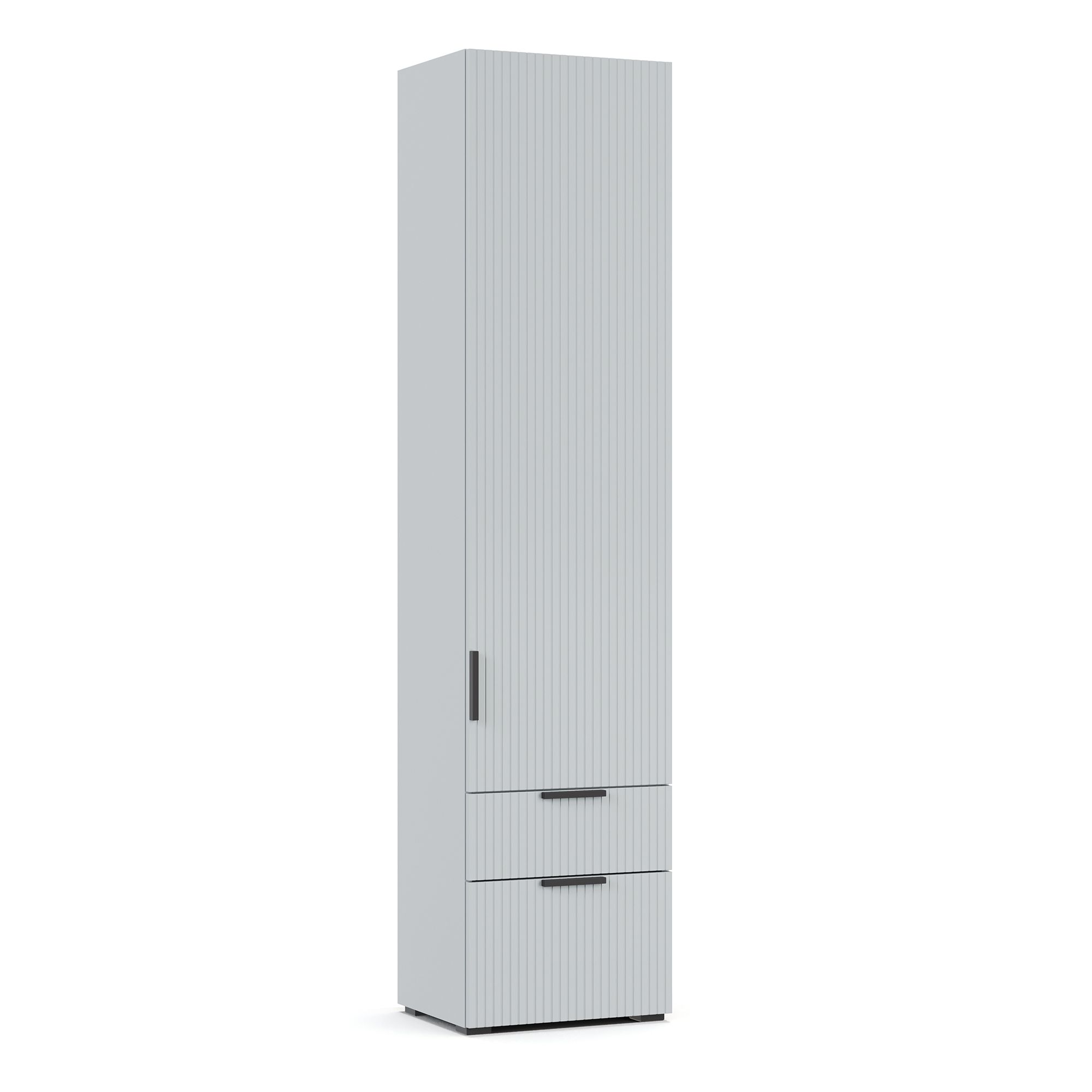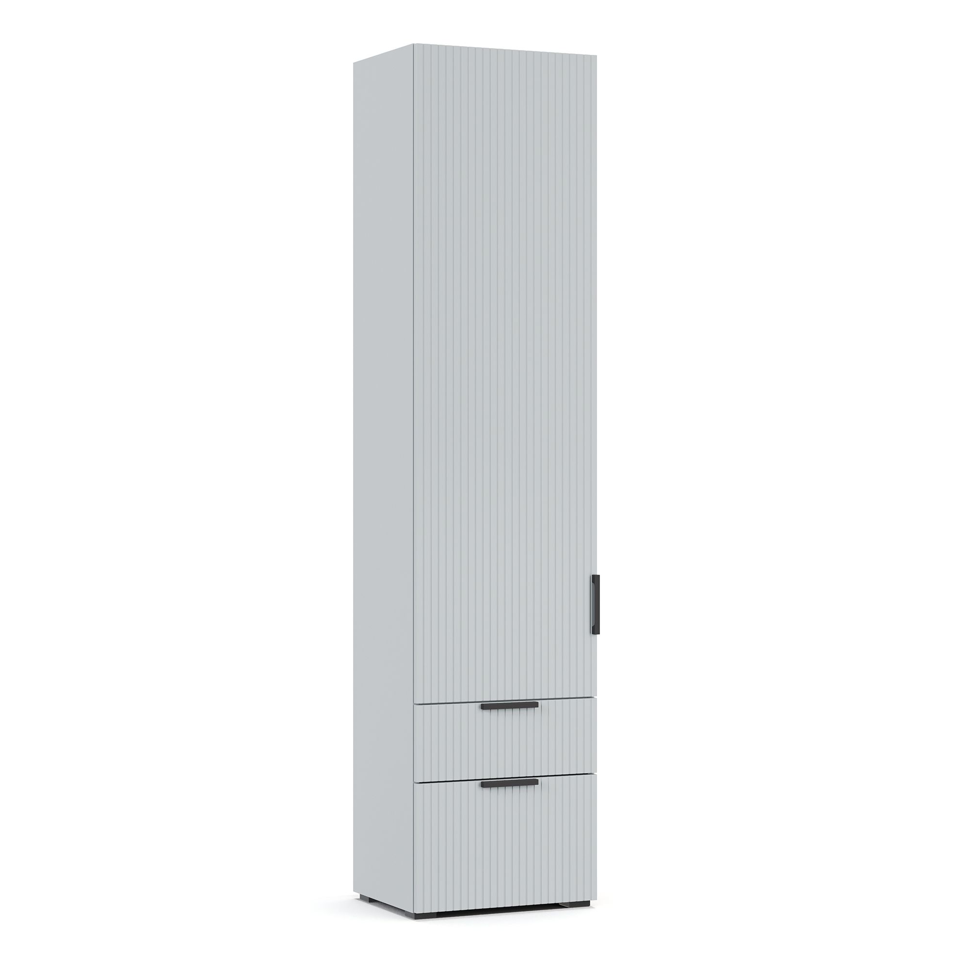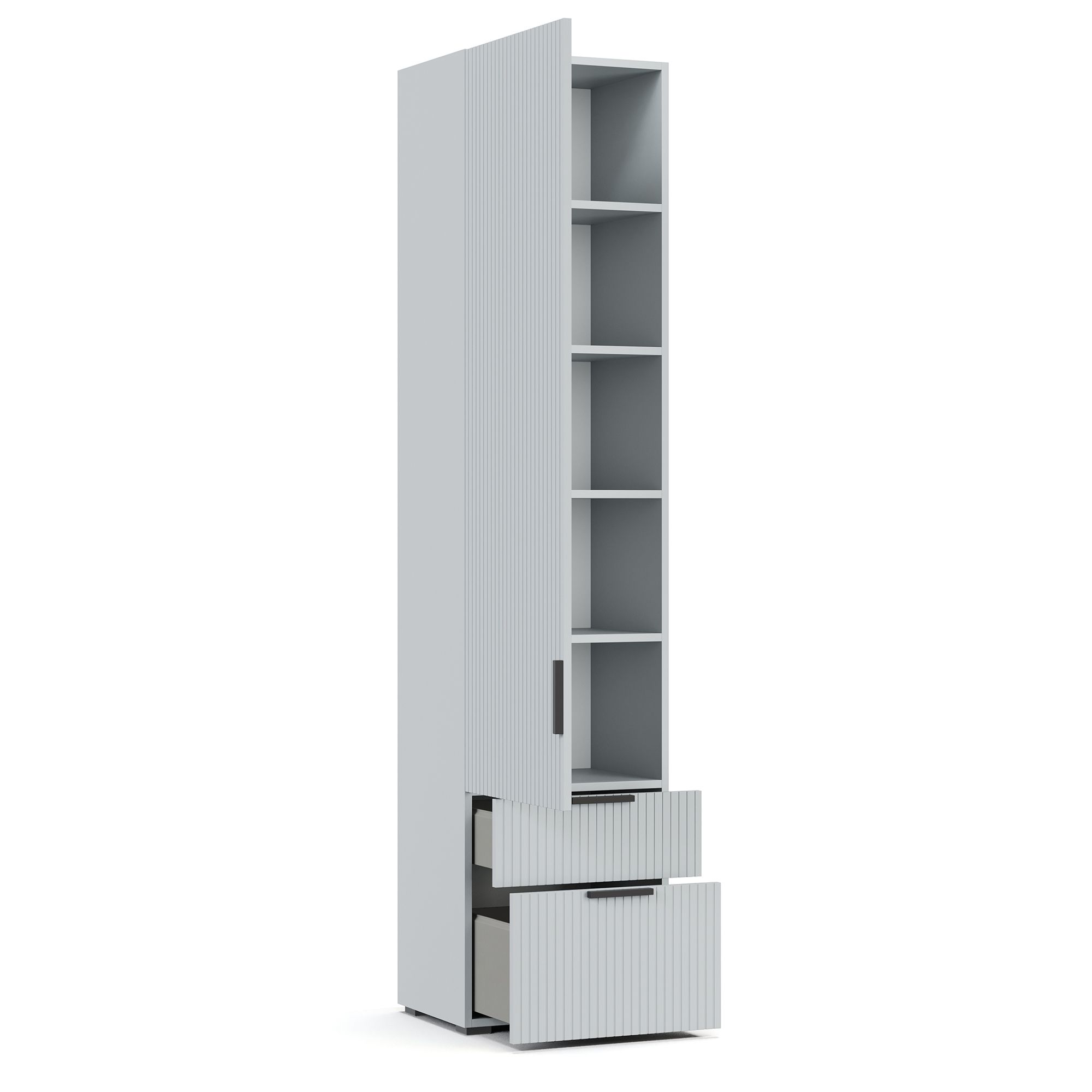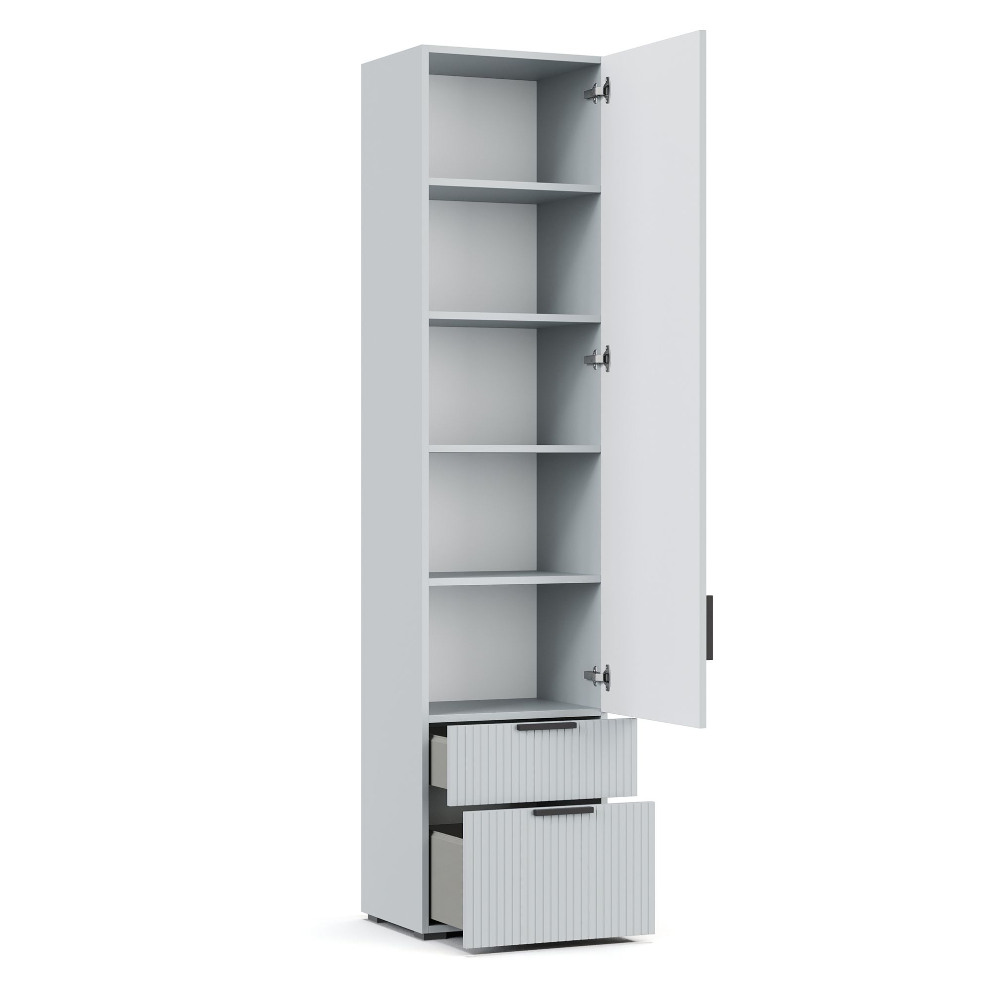 Верхняя часть шкафа-пенала NAPOLI оснащена сплошным фасадом, за которым располагаются полки из ЛДСП. Возможно как левое, так и правое открывание фасада. В нижней части расположены два выдвижных ящика. Распашной фасад и ящики декорированы вертикальной фрезеровкой. В качестве опции предлагается установка шкафа на опоры высотой 12 см (заказываются отдельно).