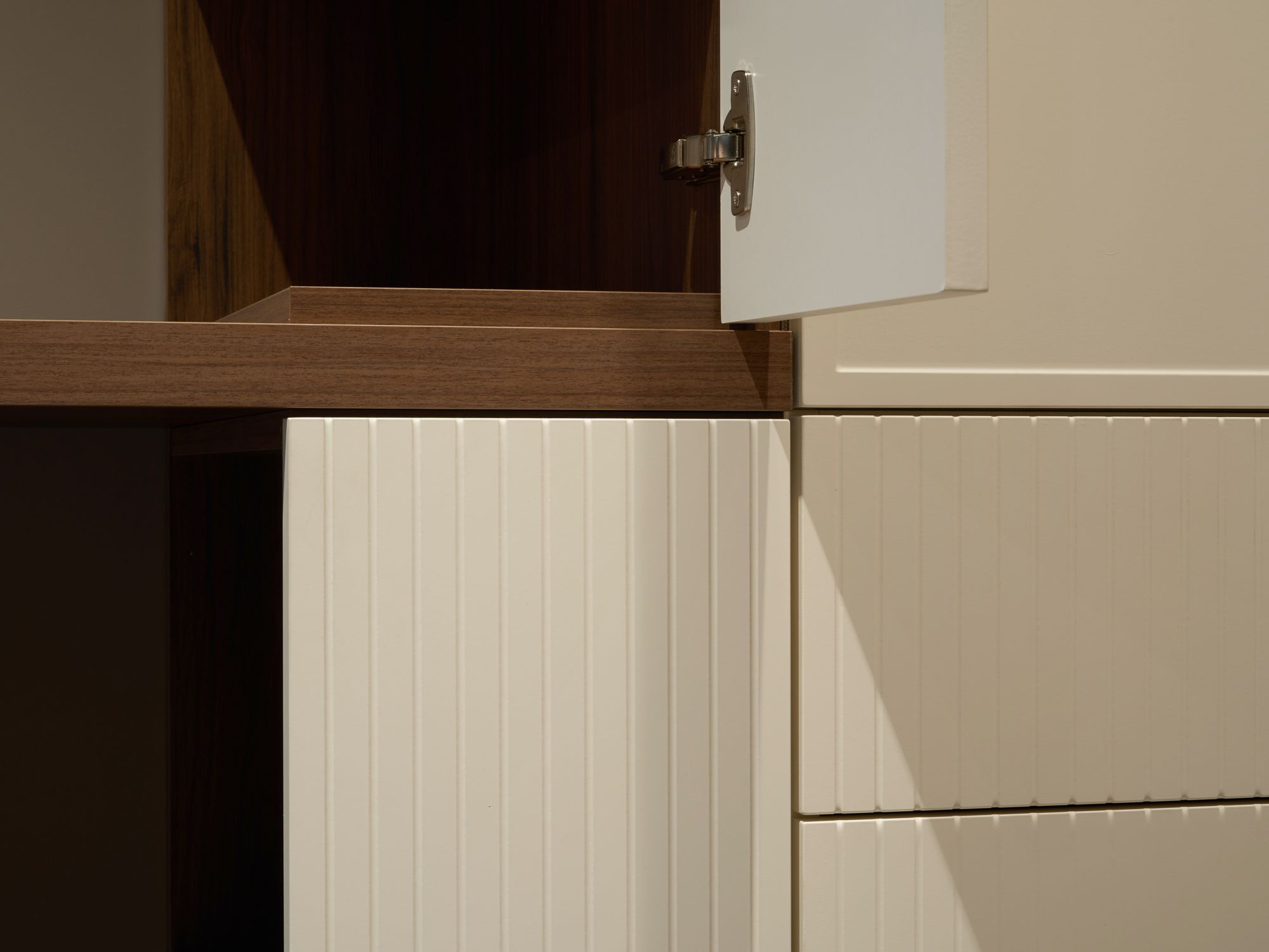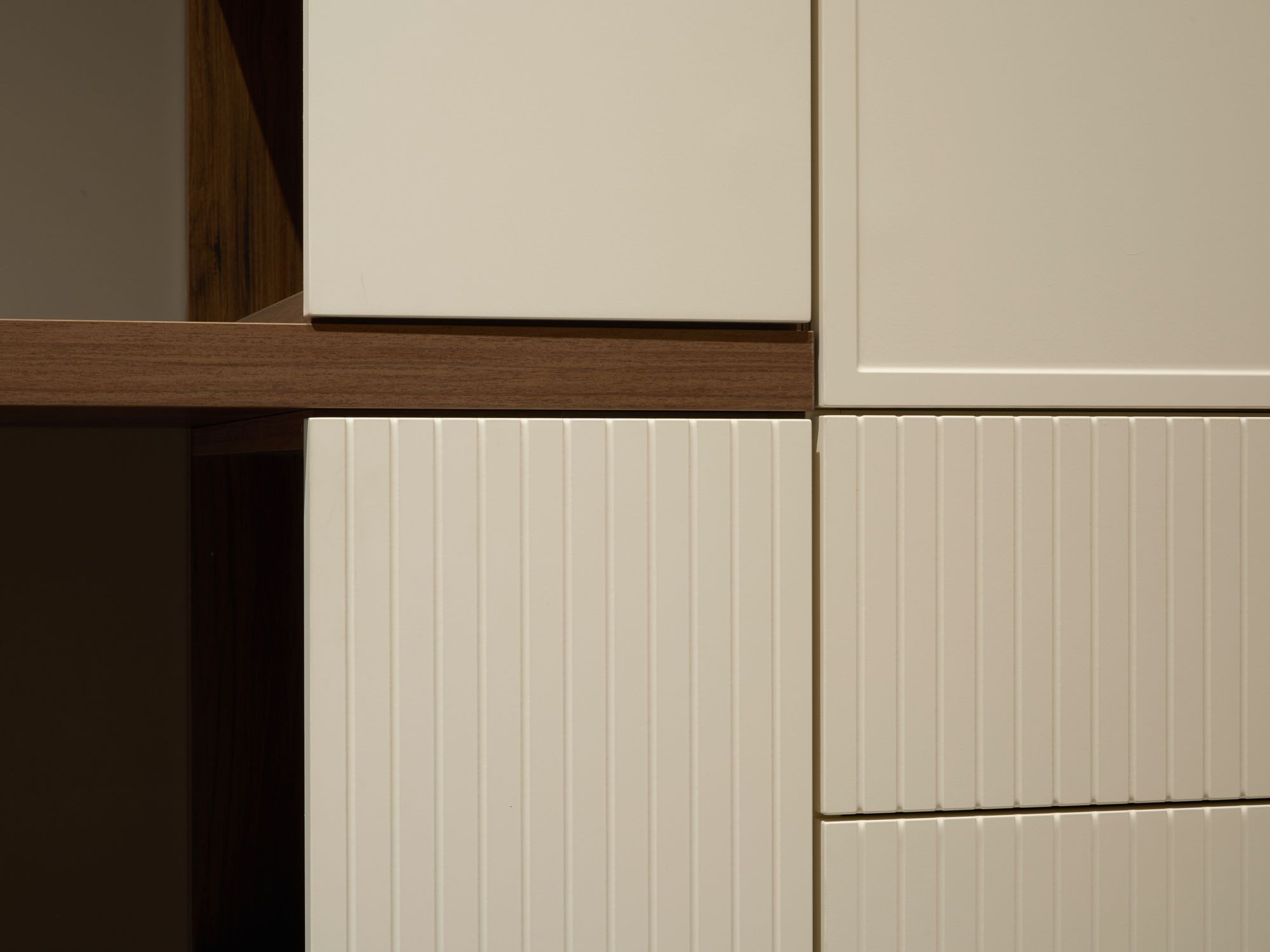 Трендовый декор в виде вертикальных фрезерованных полосок на фасадах задает пространству современный ритм, одновременно создавая ощущение спокойствия, размеренности и стабильности. За счет сочетания гладкой и рельефной поверхностей интерьер приобретает многомерность и глубину.