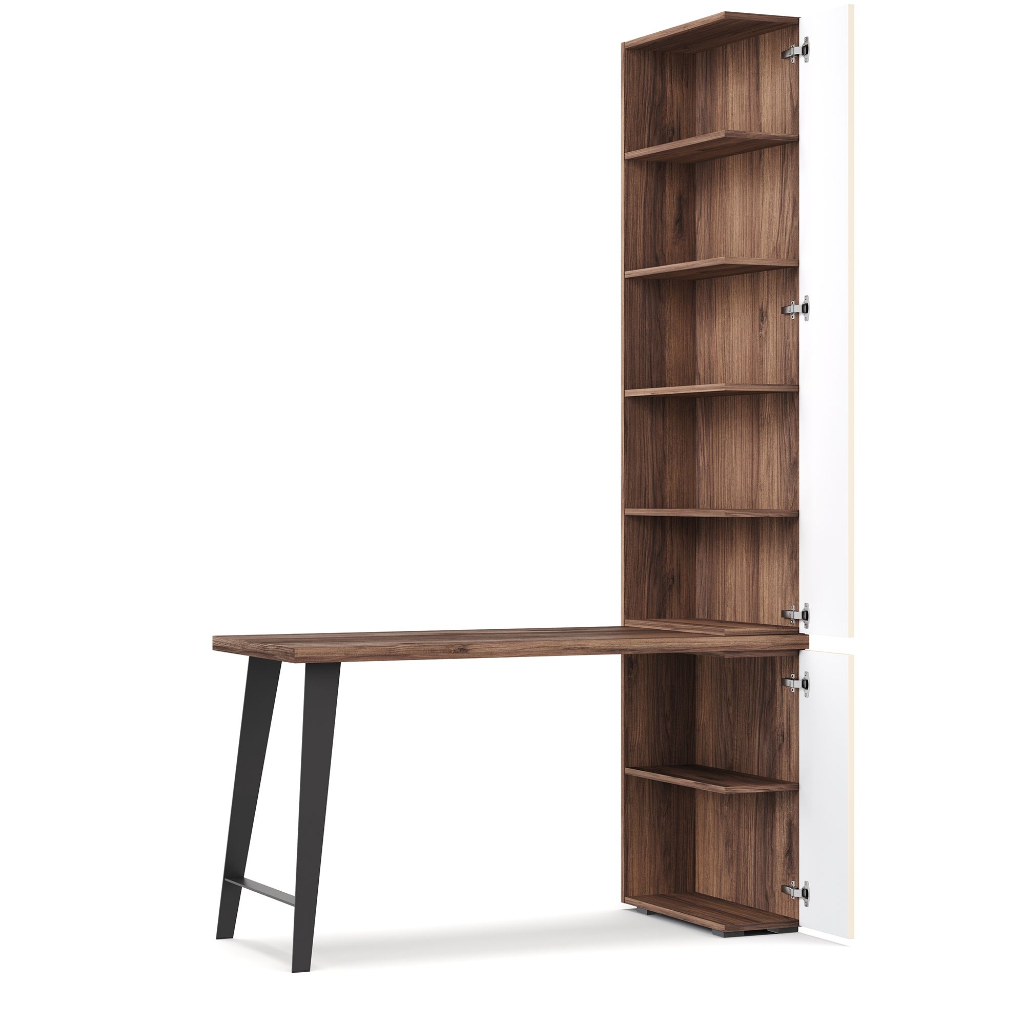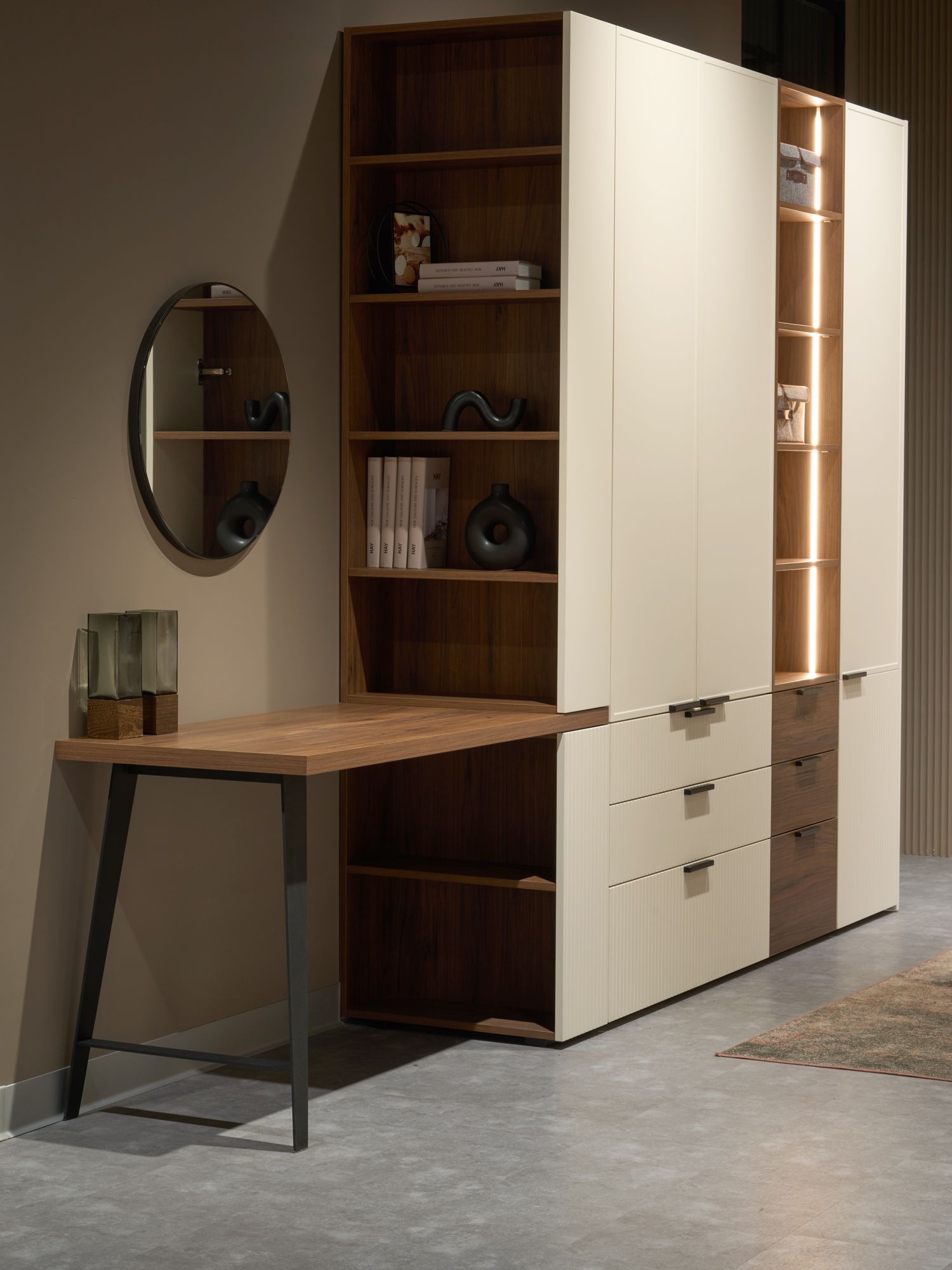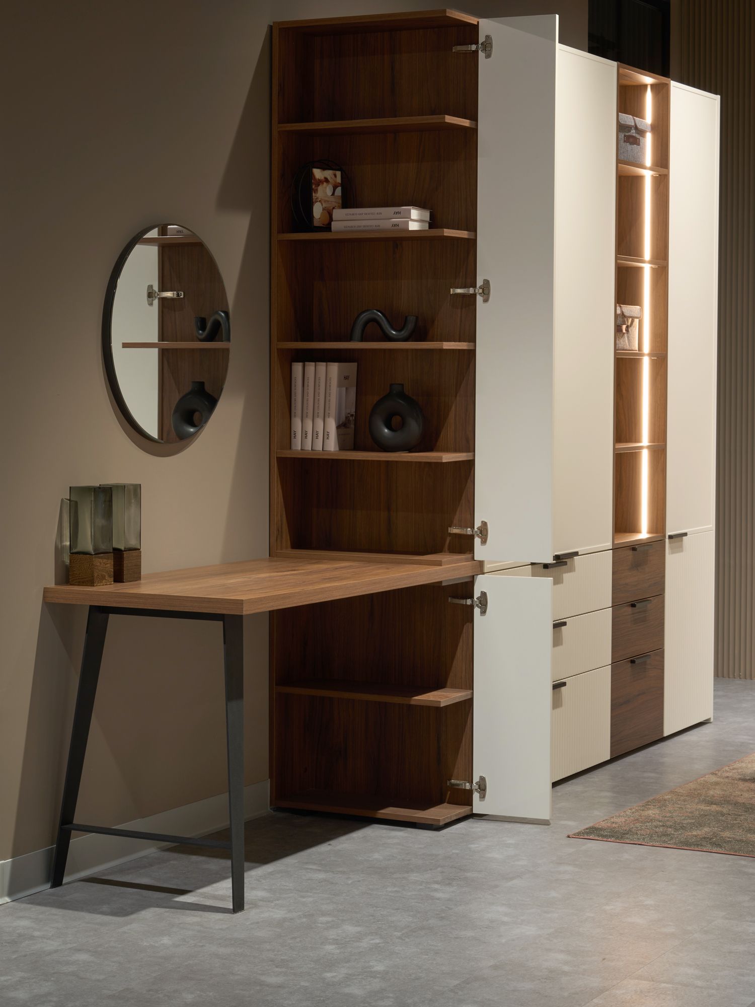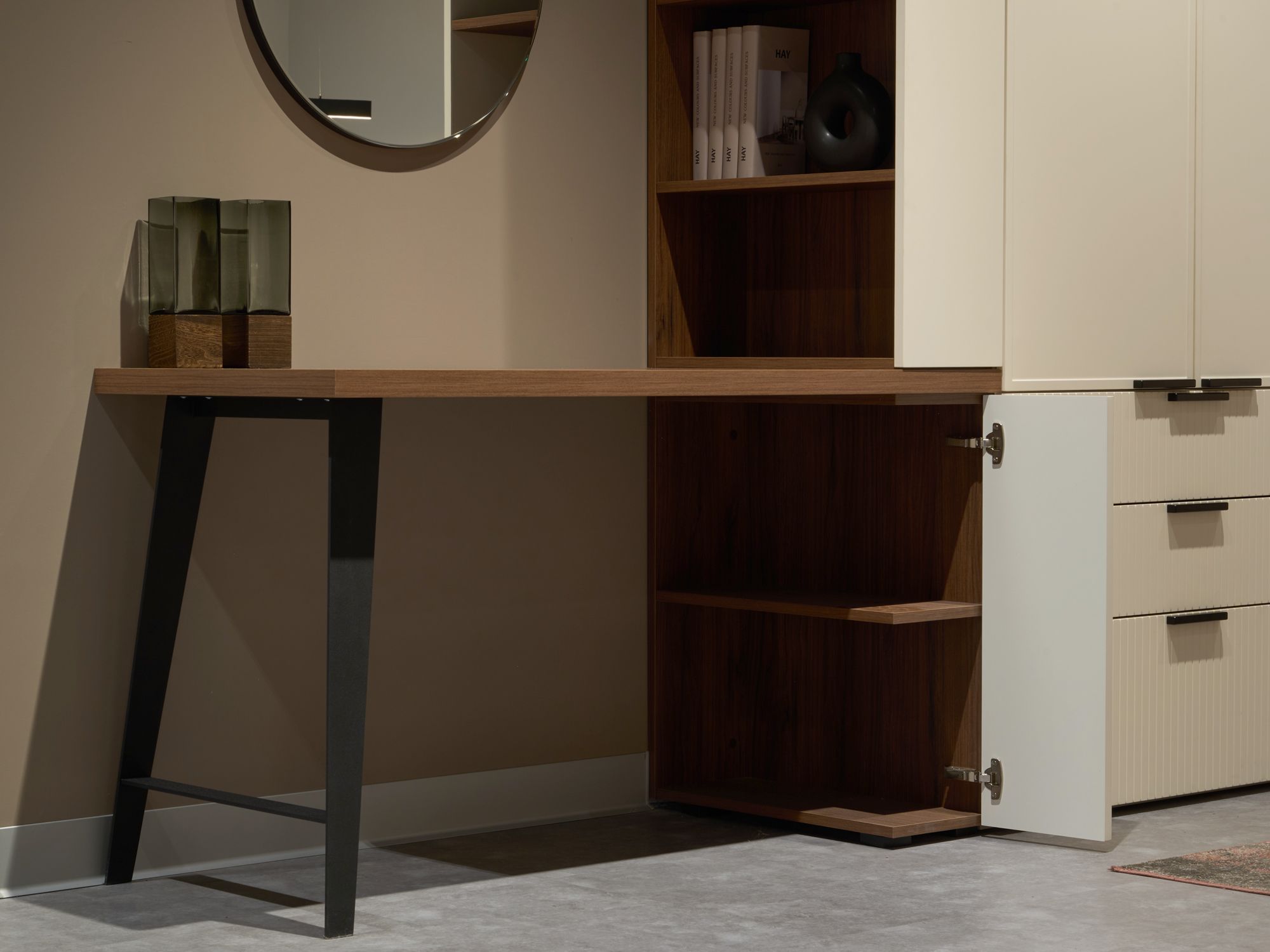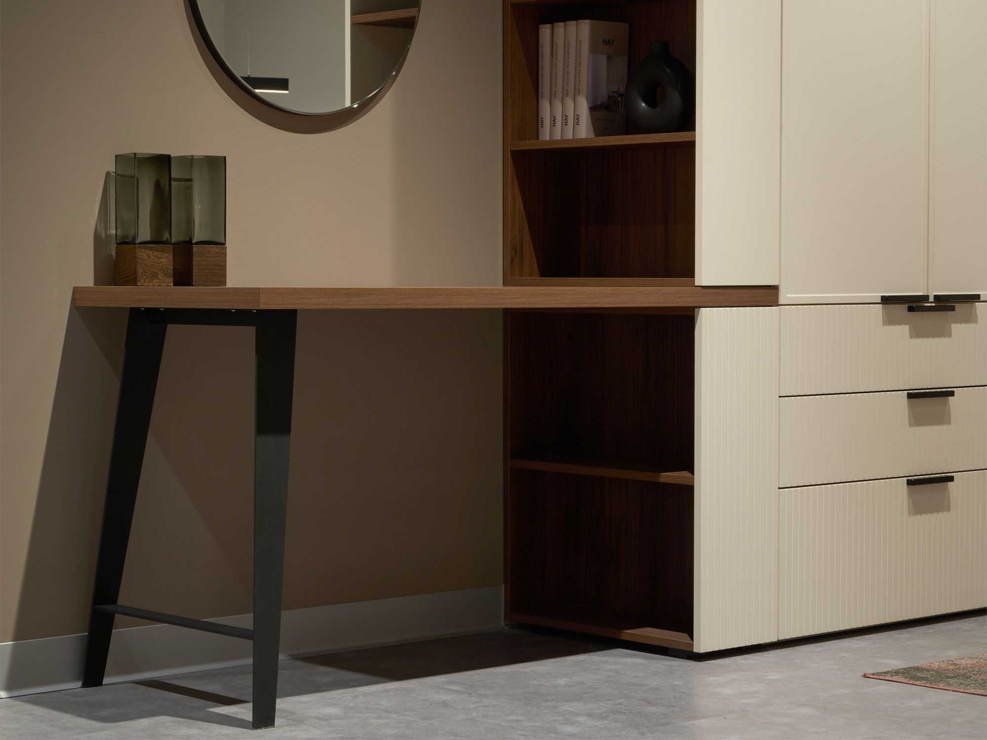 Шкаф NAPOLI с полками из ЛДСП, оснащен столом на металлической опоре с покрытием Черный матовый и используется в качестве завершающего элемента системы хранения. Элемент может устанавливаться как справа, так и слева относительно шкафной композиции. Дизайн выполнен в сочетании древесной текстуры, гладкой поверхности и фактурной отделки вертикальной фрезеровкой.