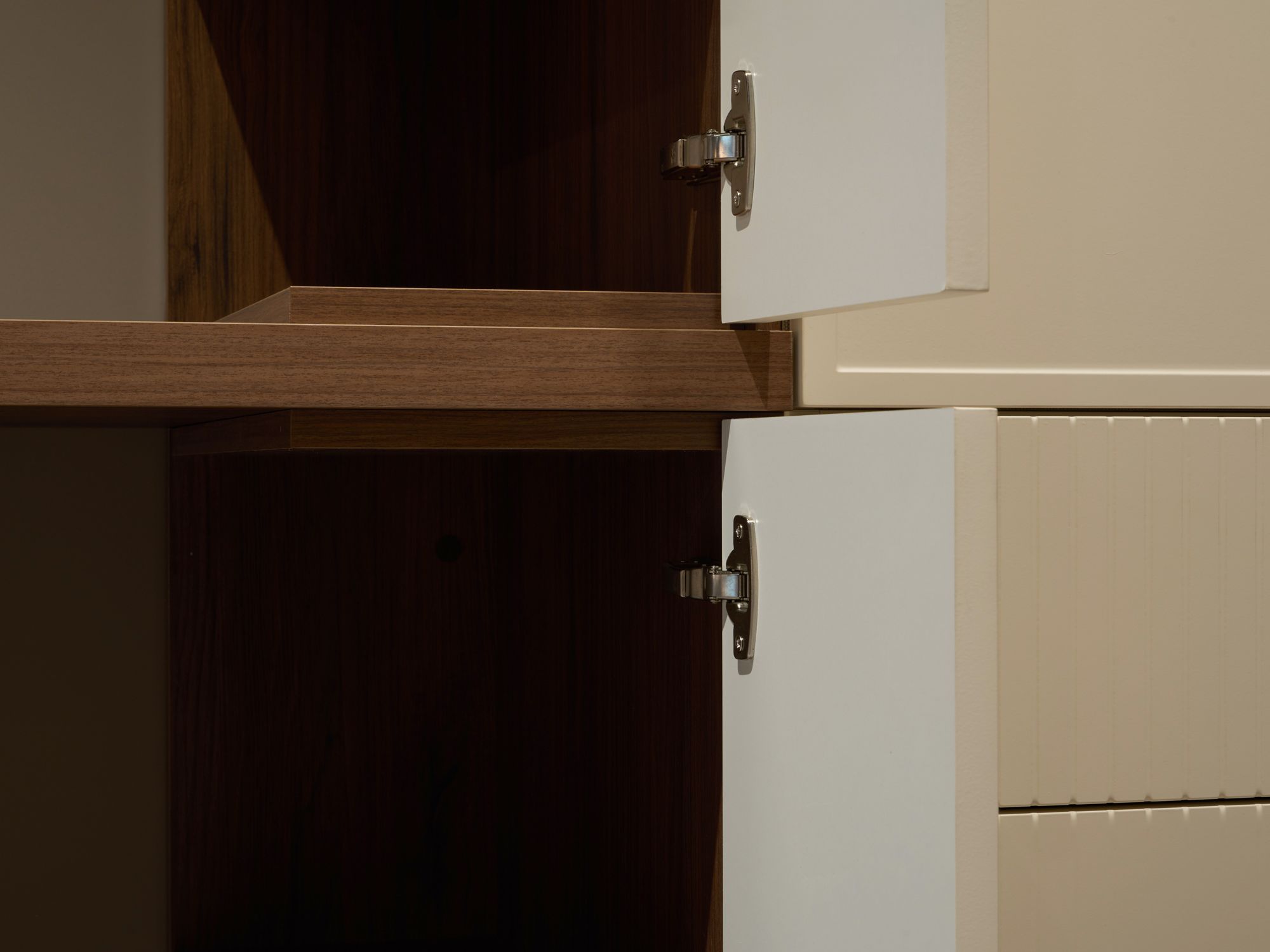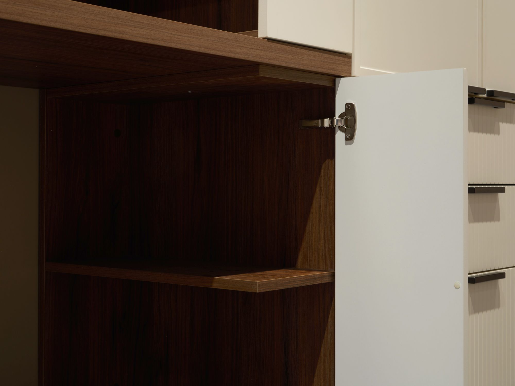 Для навески распашных фасадов используются петли быстрого монтажа, оснащенные доводчиком уже в базовой комплектации. Они рассчитаны на 200 тыс. циклов открывания, что обеспечивает удобство и комфорт эксплуатации мебели на долгие годы даже при ежедневном интенсивном использовании.