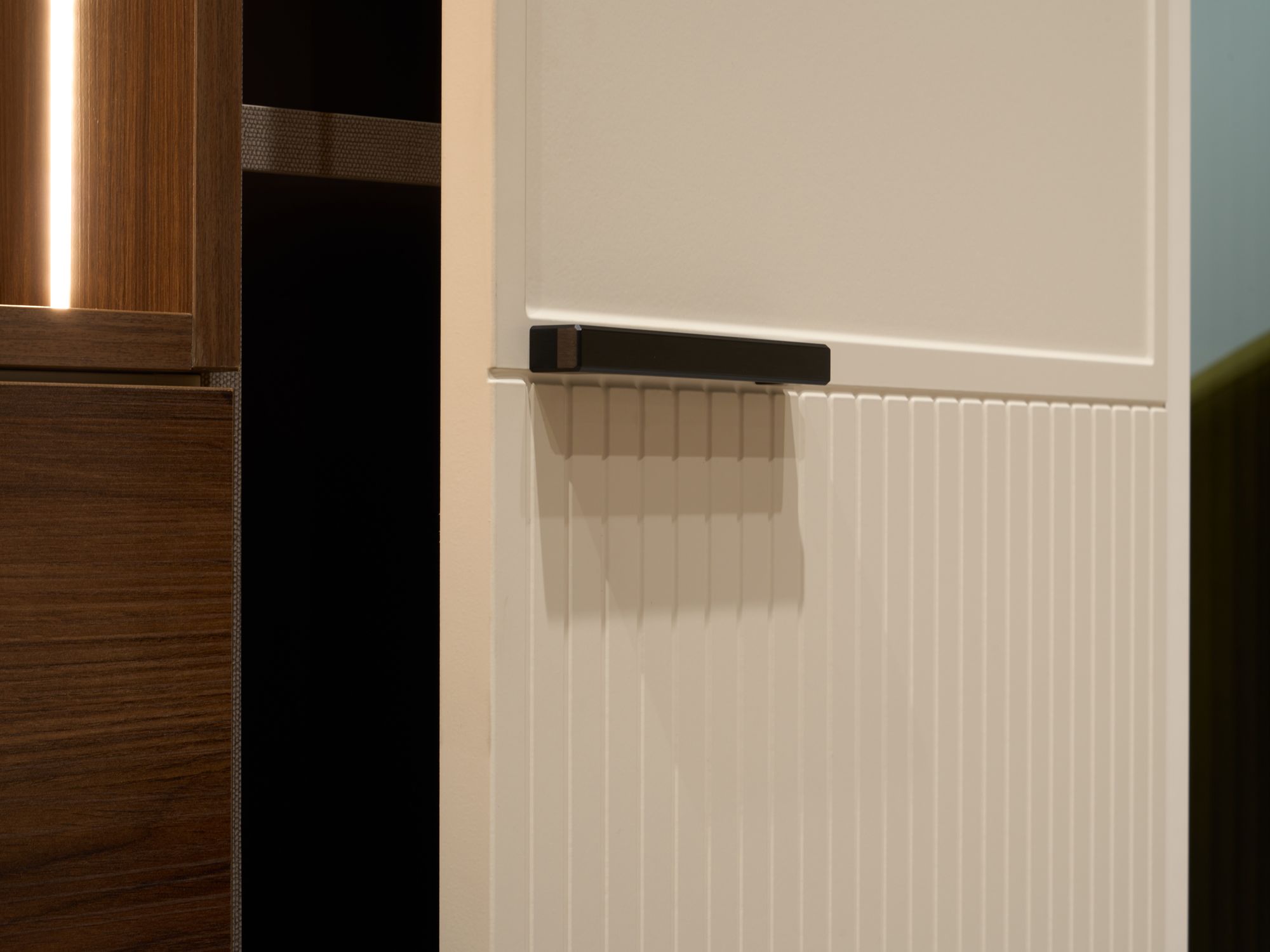 Трендовый декор в виде вертикальных фрезерованных полосок на фасадах задает пространству современный ритм, одновременно создавая ощущение спокойствия, размеренности и стабильности. За счет сочетания гладкой и рельефной поверхностей интерьер приобретает многомерность и глубину.