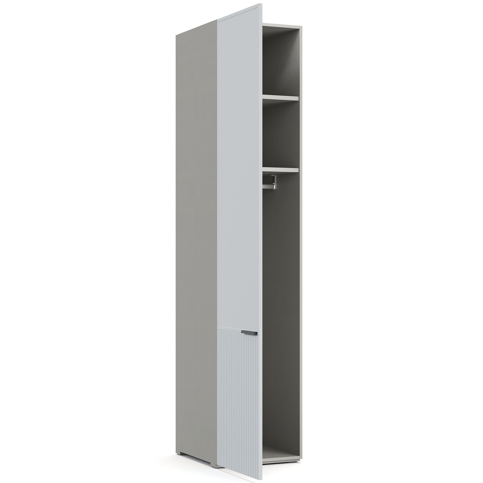 Внутреннее наполнение однодверного шкафа NAPOLI представляет собой систему из двух полок, к нижней из которых крепится штанга для вешалок. Верхняя часть фасада декорирована тонкой рамкой, нижняя – вертикальной фрезеровкой. Корпус шкафа выполнен в текстуре Шенилл. Предусмотрены варианты с левым и правым открыванием фасада. ВАЖНО! При использовании в качестве отдельно стоящего модуля, завершающего элемента композиции или рядом с угловым шкафом обязательно оснащение боковыми стенками (заказываются отдельно). Эксплуатация без них дизайном не предусмотрена.