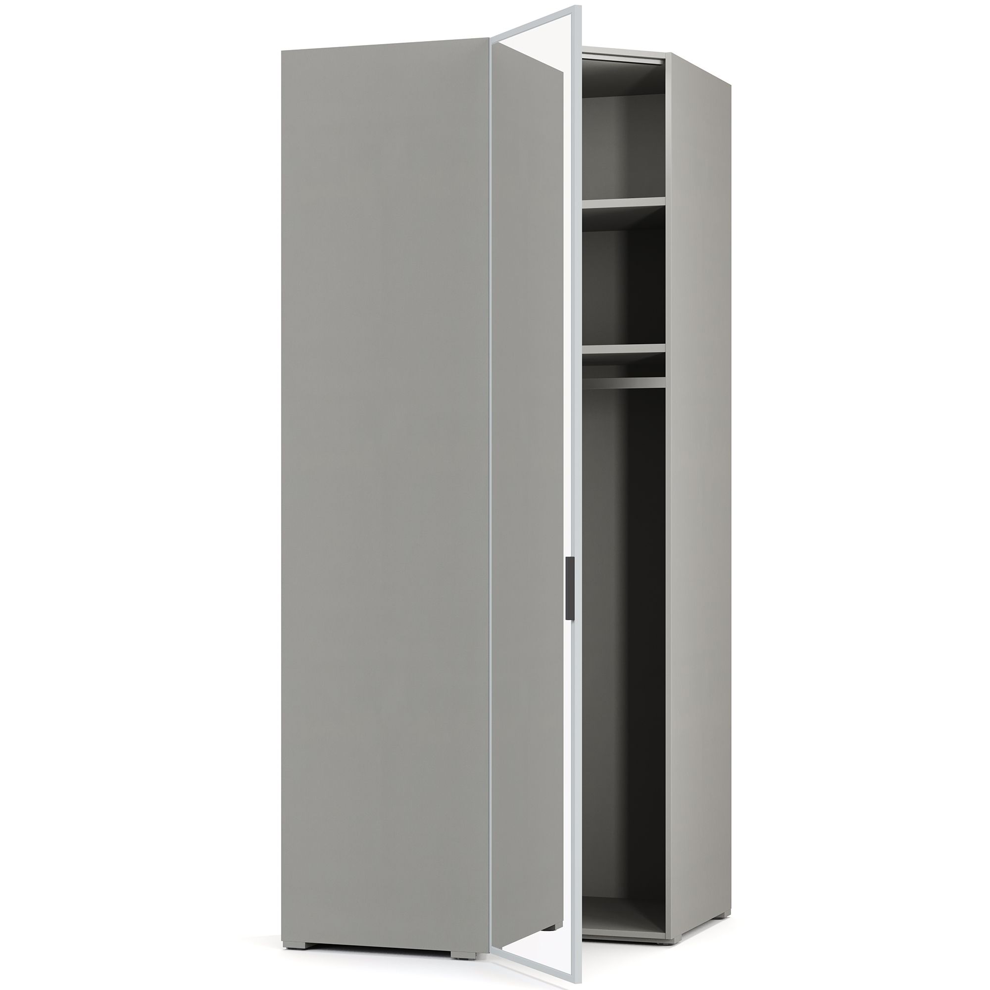 Внутреннее наполнение углового шкафа NAPOLI состоит из двух секций. Одна из них оборудована двумя полками (к нижней крепится штанга для вешалок), а вторая – системой из 5 полок. Фасад представляет собой единое зеркальное полотно. Возможно как левое, так и правое открывание фасада. Корпус выполнен в текстуре Шенилл. Шкаф оборудован встроенным светильником (система включения заказывается отдельно). ВАЖНО! Боковые стенки для шкафа заказываются отдельно. Эксплуатация без них дизайном не предусмотрена.