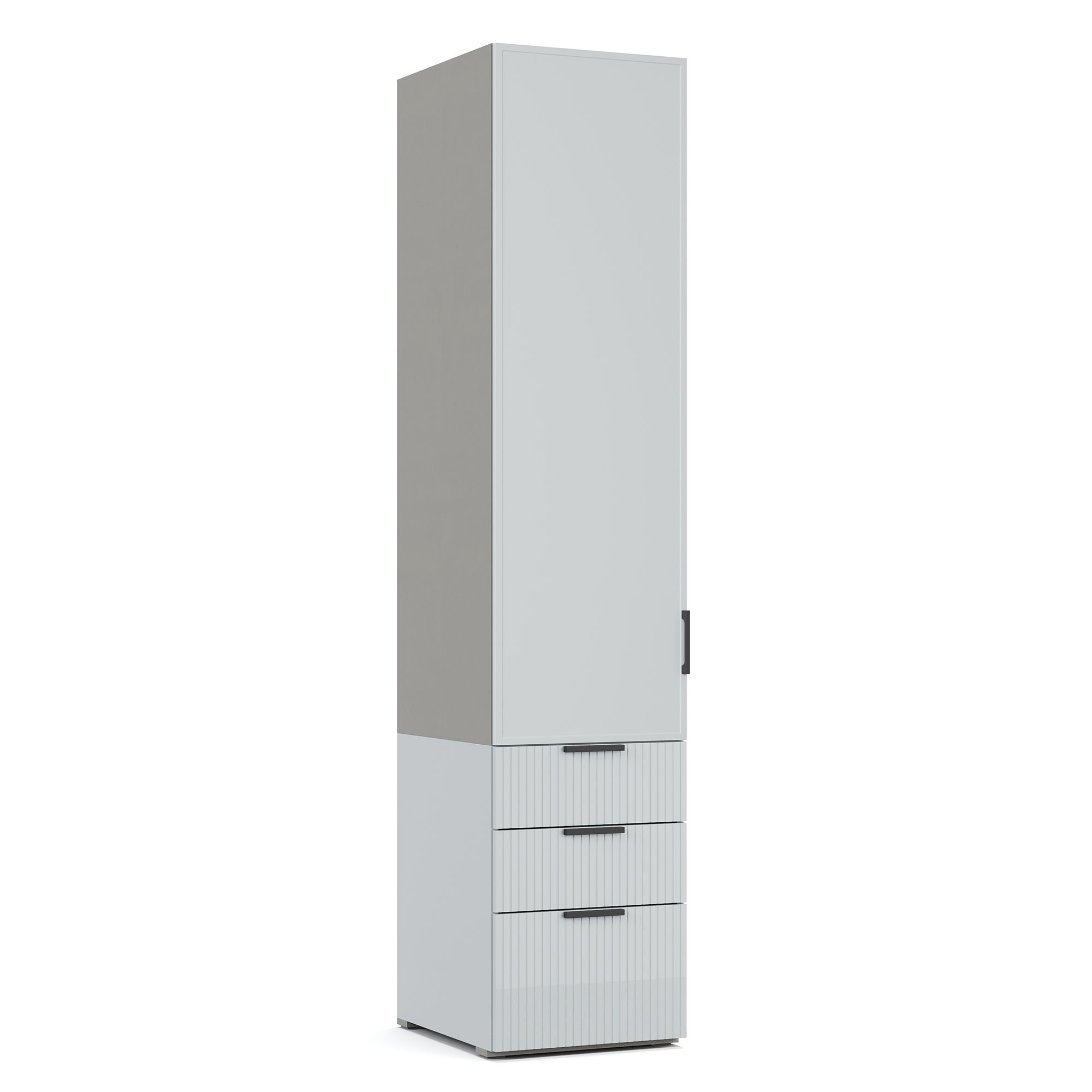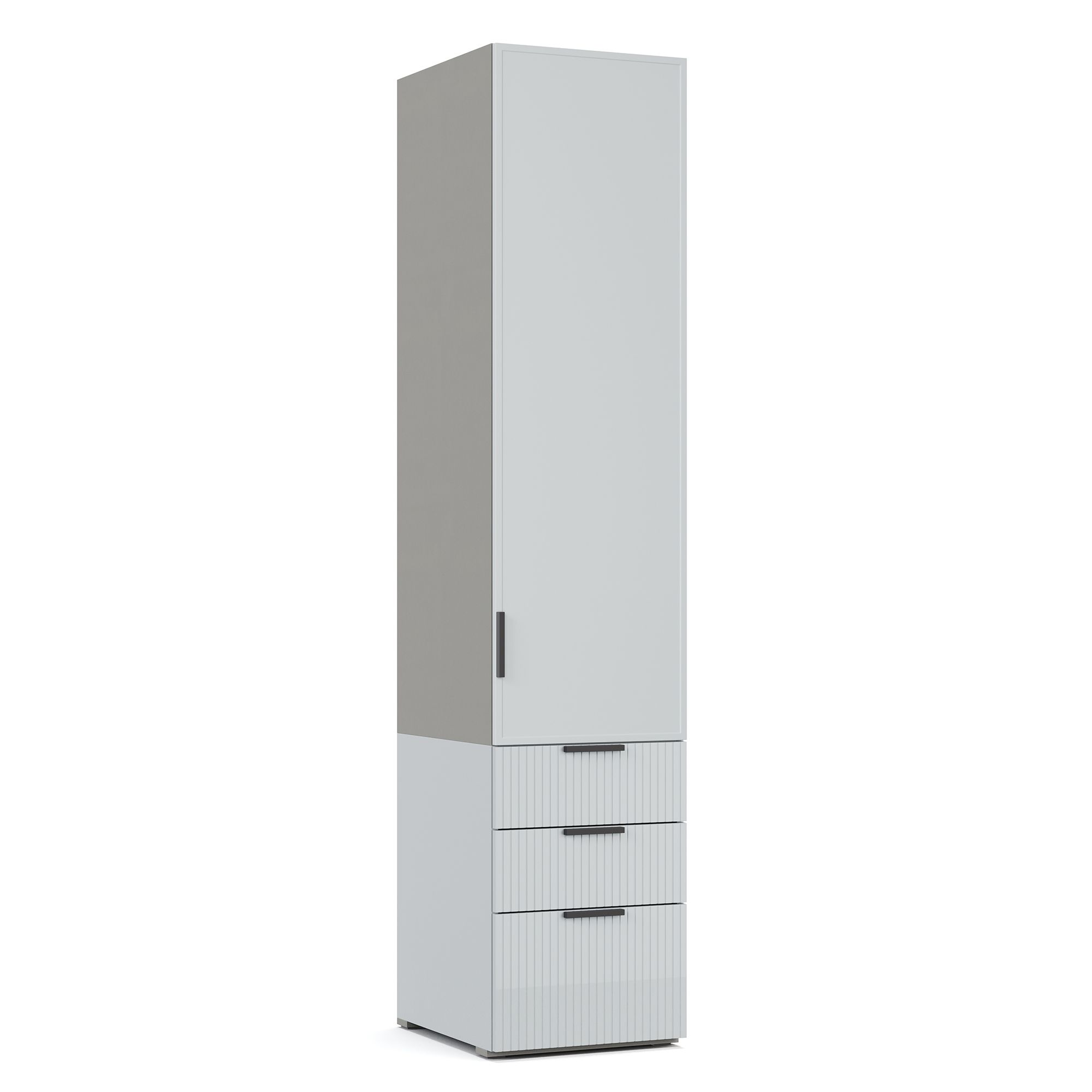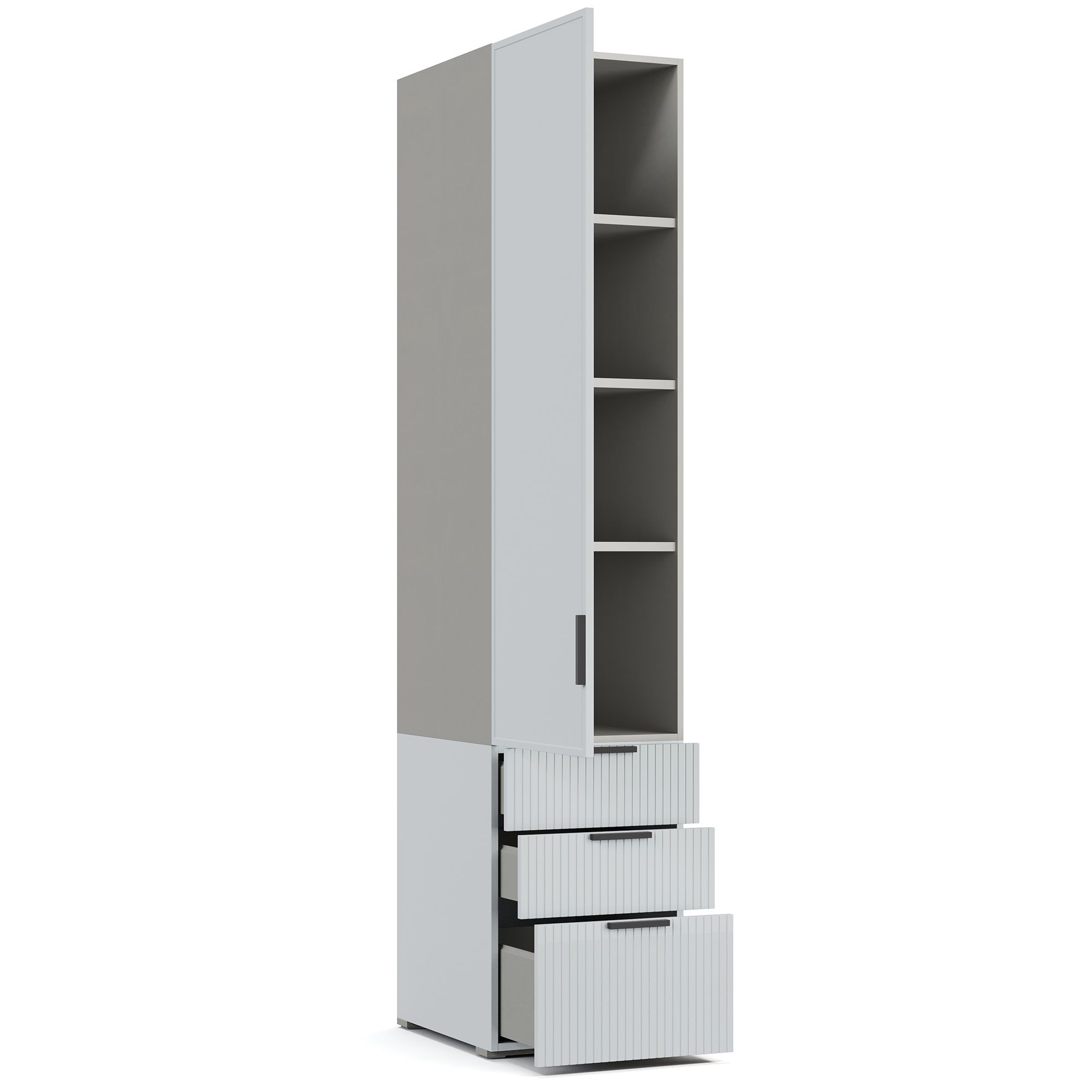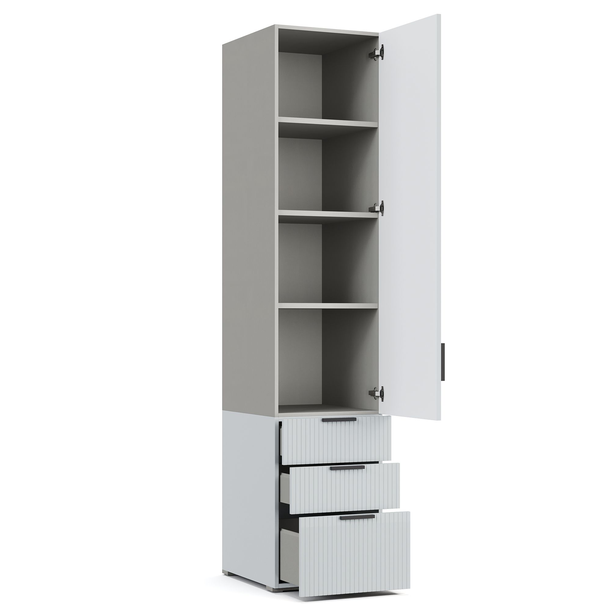 Верхняя часть шкафа NAPOLI оснащена сплошным фасадом с тонкой рамкой, за которым располагаются три полки из ЛДСП. Возможно как левое, так и правое открывание фасада. В нижней части расположены три выдвижных ящика с вертикальной фрезировкой. Внешний декор корпуса шкафа и внутренний декор ящиков выполнены в текстуре Шенилл. ВАЖНО! Боковые стенки для шкафа заказываются отдельно. Эксплуатация без них дизайном не предусмотрена.