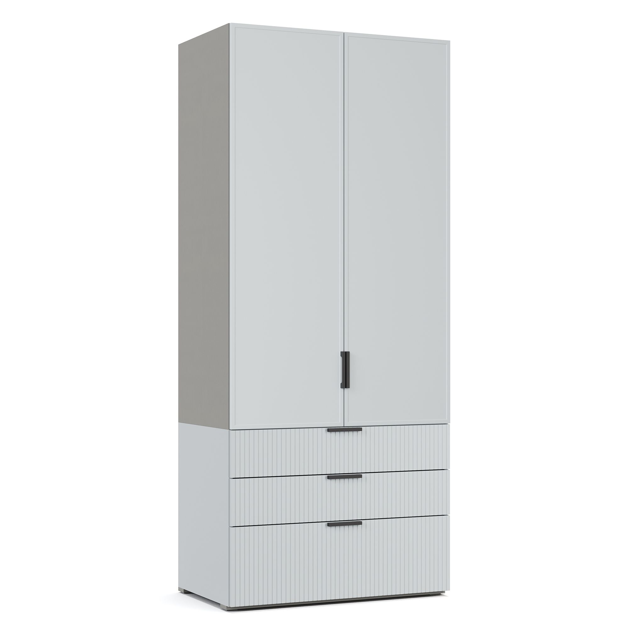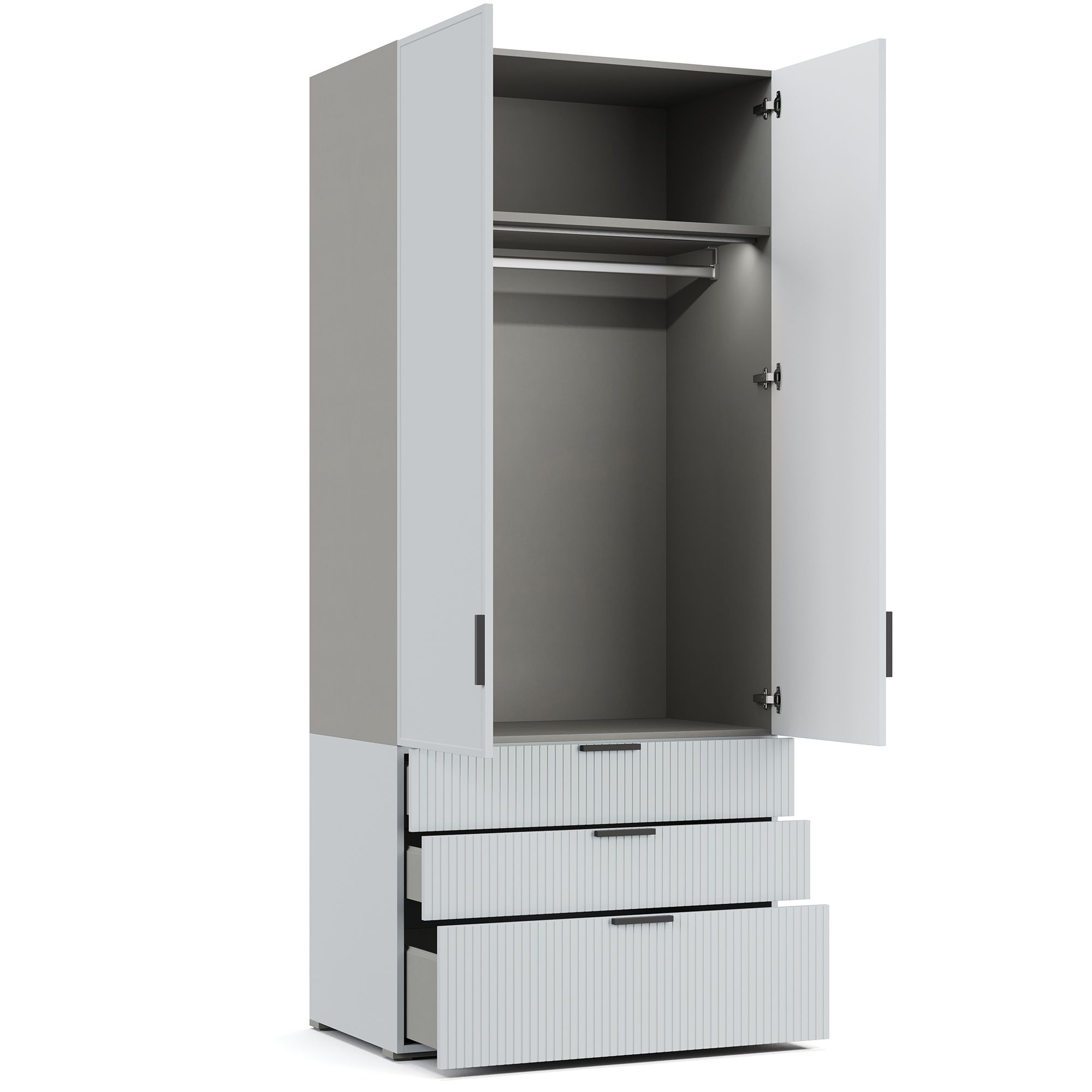 Верхняя часть двухдверного шкафа NAPOLI оснащена распашными фасадами с тонкой рамкой. Внутреннее наполнение представляет собой полку из ЛДСП, к которой крепится штанга для вешалок. Шкаф оборудован внутренней подсветкой (система включения заказывается отдельно). В нижней части расположены три выдвижных ящика с фасадами в отделке фрезеровкой. Внешний декор корпуса шкафа и внутренний декор ящиков выполнены в текстуре Шенилл. ВАЖНО! Боковые стенки для шкафа заказываются отдельно. Эксплуатация без них дизайном не предусмотрена.