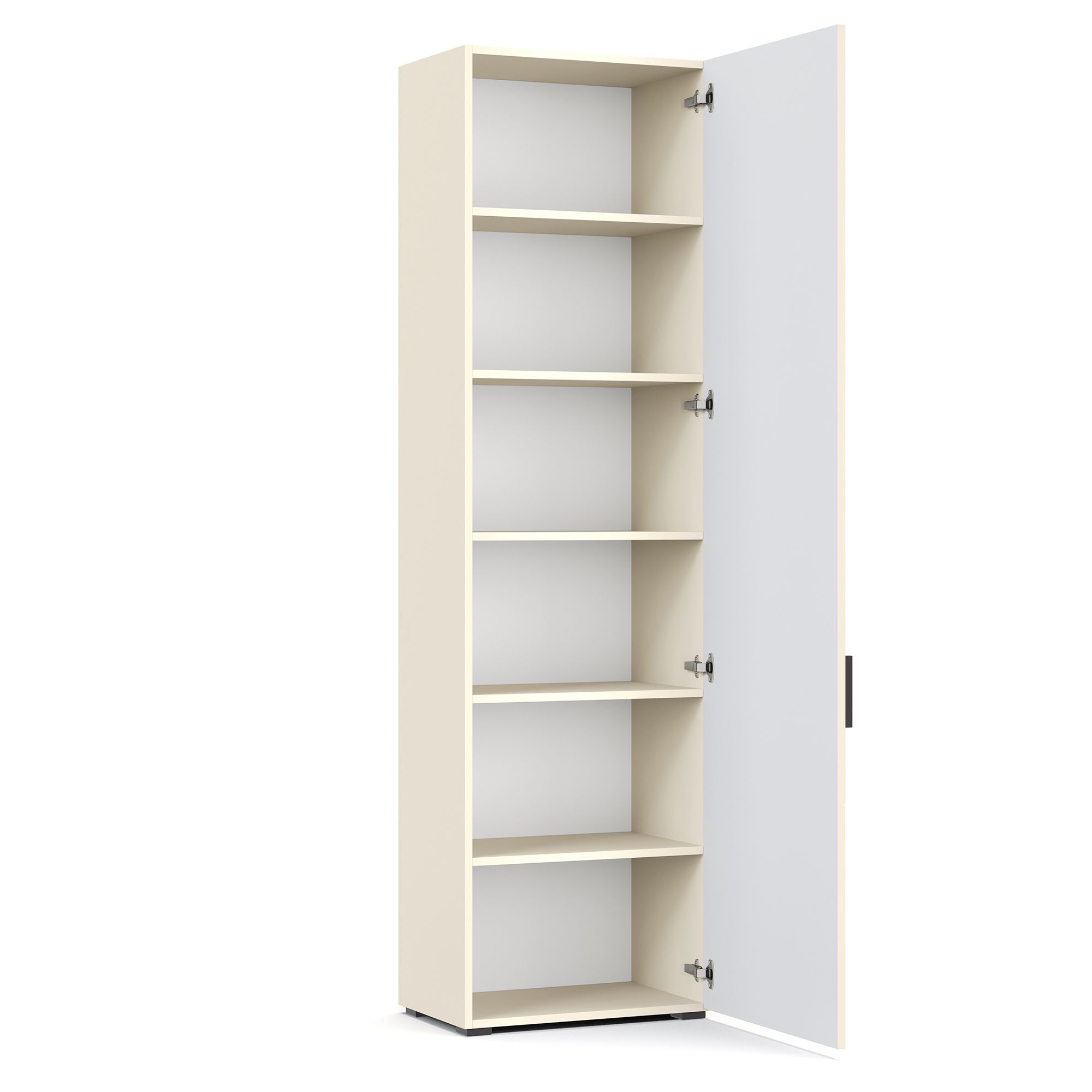 Внутреннее наполнение однодверного шкафа NAPOLI представляет собой систему полок. Верхняя часть фасада декорирована тонкой рамкой, нижняя – вертикальной фрезеровкой. Предусмотрены варианты с левым и правым открыванием фасада.