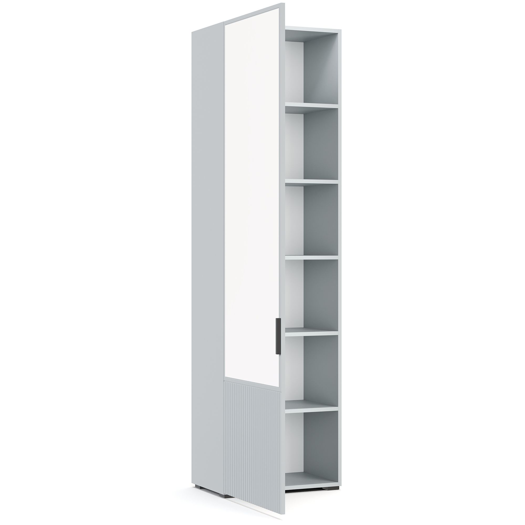 Внутреннее наполнение однодверного шкафа NAPOLI представляет собой систему полок. Верхняя часть фасада оснащена зеркалом, нижняя декорирована вертикальной фрезеровкой. Предусмотрены варианты с левым и правым открыванием фасада.