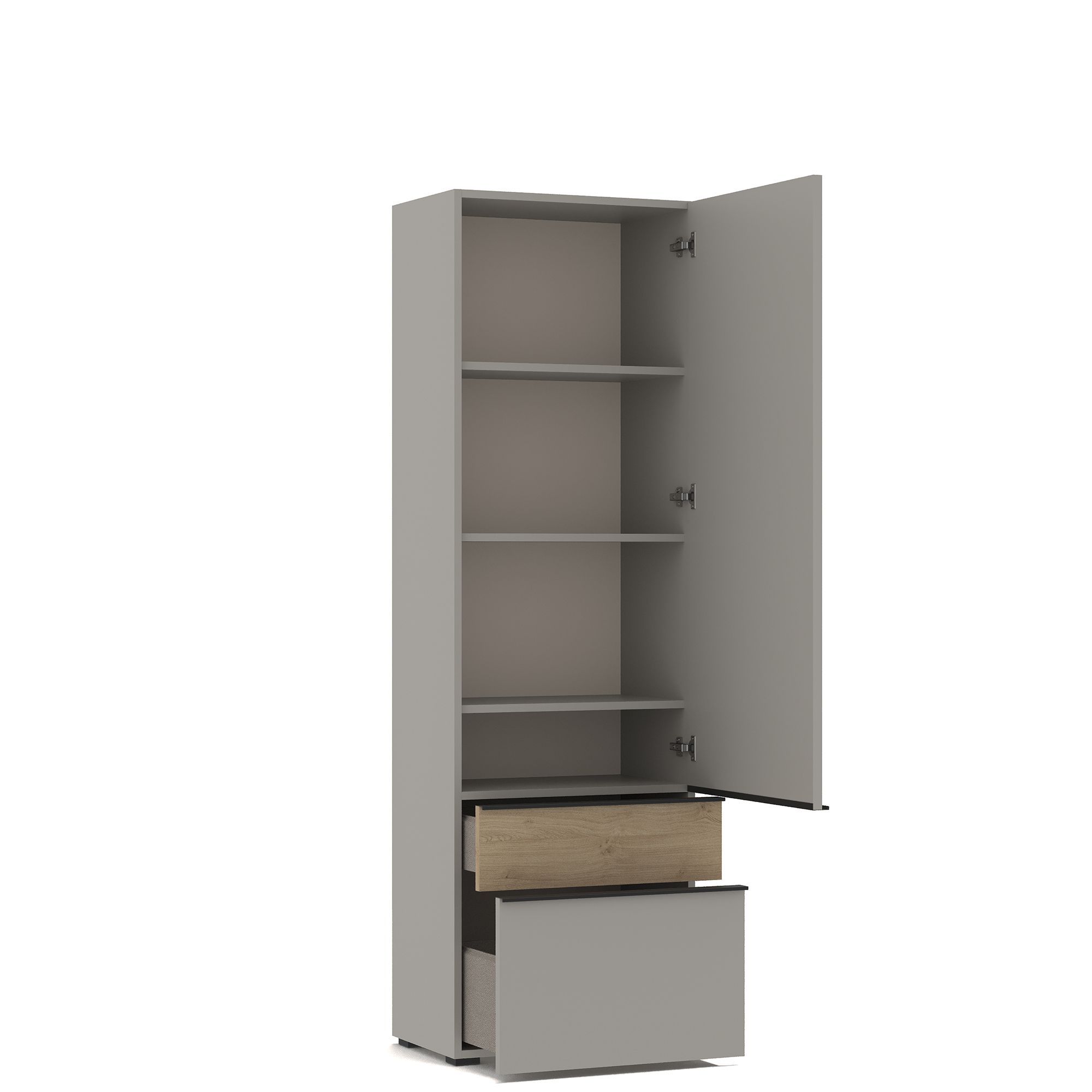 Шкаф-пенал ТЕРАМО / TERAMO оснащен распашным фасадом с системой открывания Push, за которым расположена система полок из ЛДСП. Возможно как правое, так и левое открывание. В нижней части располагаются выдвижные ящики. Дизайн шкафа выполнен в сочетании древесной текстуры Дуб Кендал натуральный и монохромной отделки. Накладные ручки из алюминия с черным матовым покрытием входят в комплектацию.