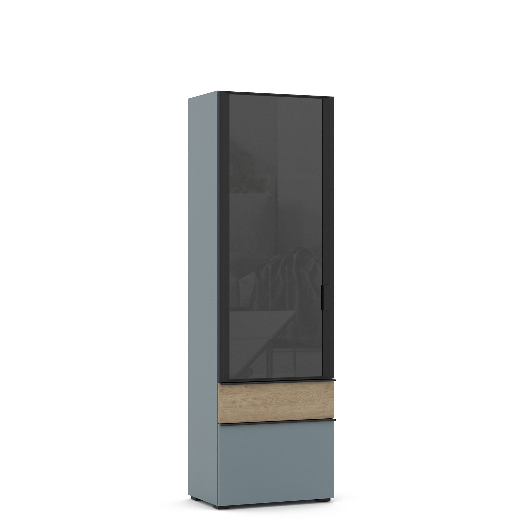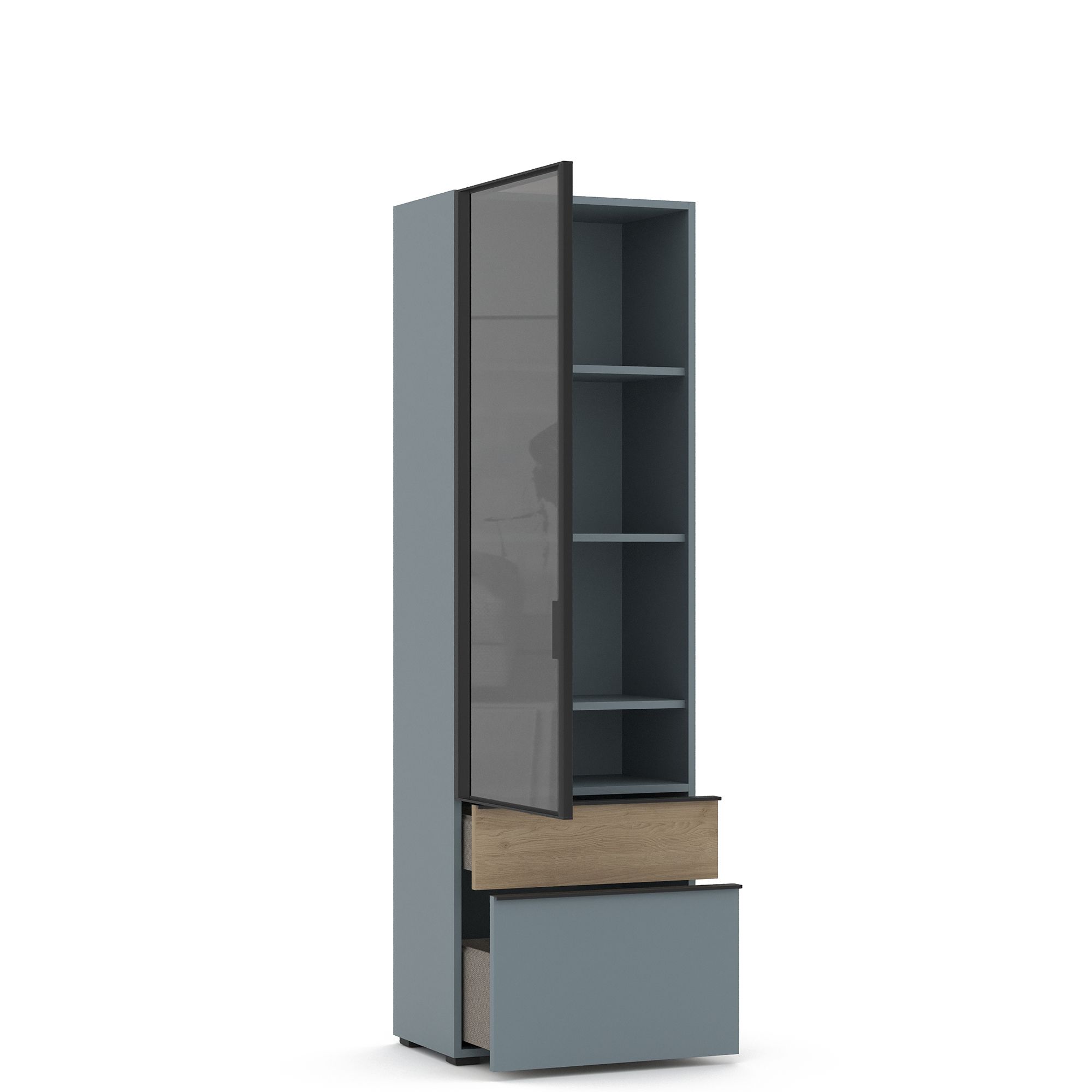 Шкаф-витрина TERAMO оснащен распашным фасадом с тонированным стеклом серого оттенка в черной металлической раме, за которым расположена система полок из ЛДСП. Предусмотрены варианты как с правым, так и с левым открыванием. В нижней части располагаются выдвижные ящики. Дизайн шкафа выполнен в сочетании древесной текстуры Дуб Кендал натуральный и монохромной отделки. Накладные ручки из алюминия с черным матовым покрытием входят в комплектацию.