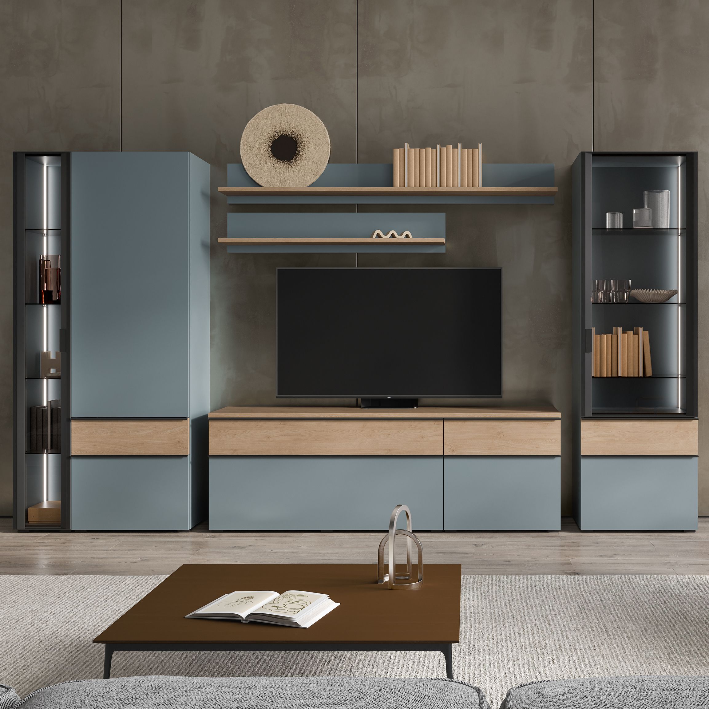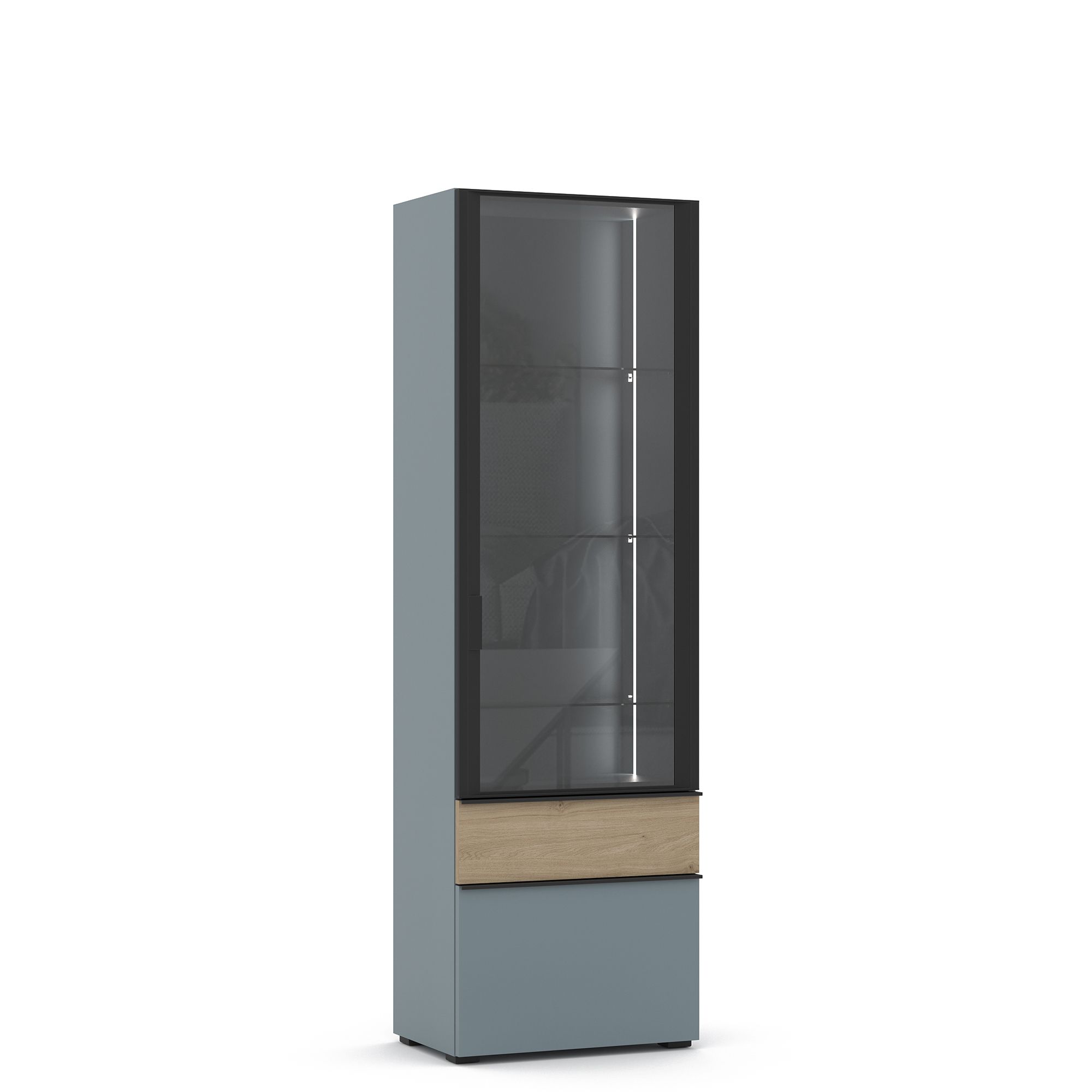Шкаф-витрина TERAMO оснащен распашным фасадом с тонированным стеклом серого оттенка в черной металлической раме, за которым расположена система стеклянных полок. Задняя стенка за стеклом – в цвет корпуса. Предусмотрены варианты как с правым, так и с левым открыванием. В нижней части располагаются выдвижные ящики. Дизайн шкафа выполнен в сочетании древесной текстуры Дуб Кендал натуральный и монохромной отделки. Накладные ручки из алюминия с черным матовым покрытием и система подсветки входят в комплектацию. ВАЖНО! Система включения-выключения встроенной подсветки заказывается отдельно.