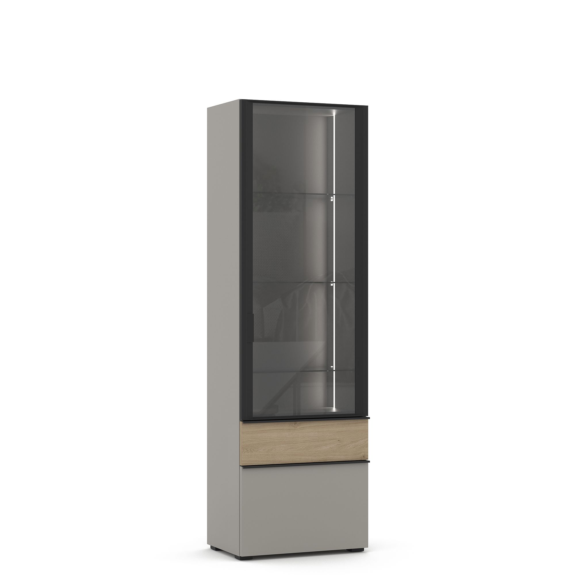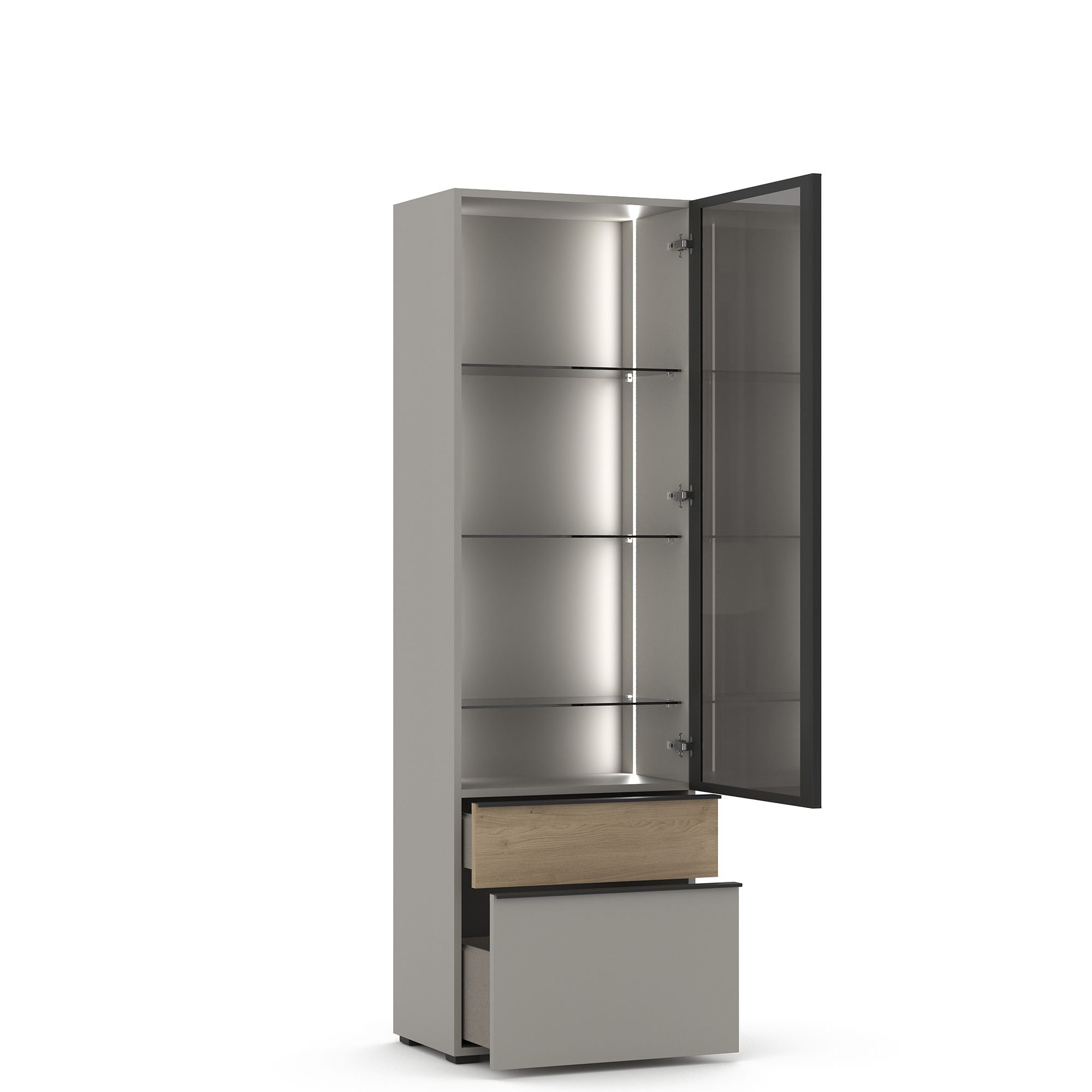 Шкаф-витрина TERAMO оснащен распашным фасадом с тонированным стеклом серого оттенка в черной металлической раме, за которым расположена система стеклянных полок. Задняя стенка за стеклом – в цвет корпуса. Предусмотрены варианты как с правым, так и с левым открыванием. В нижней части располагаются выдвижные ящики. Дизайн шкафа выполнен в сочетании древесной текстуры Дуб Кендал натуральный и монохромной отделки. Накладные ручки из алюминия с черным матовым покрытием и система подсветки входят в комплектацию. ВАЖНО! Система включения-выключения встроенной подсветки заказывается отдельно.